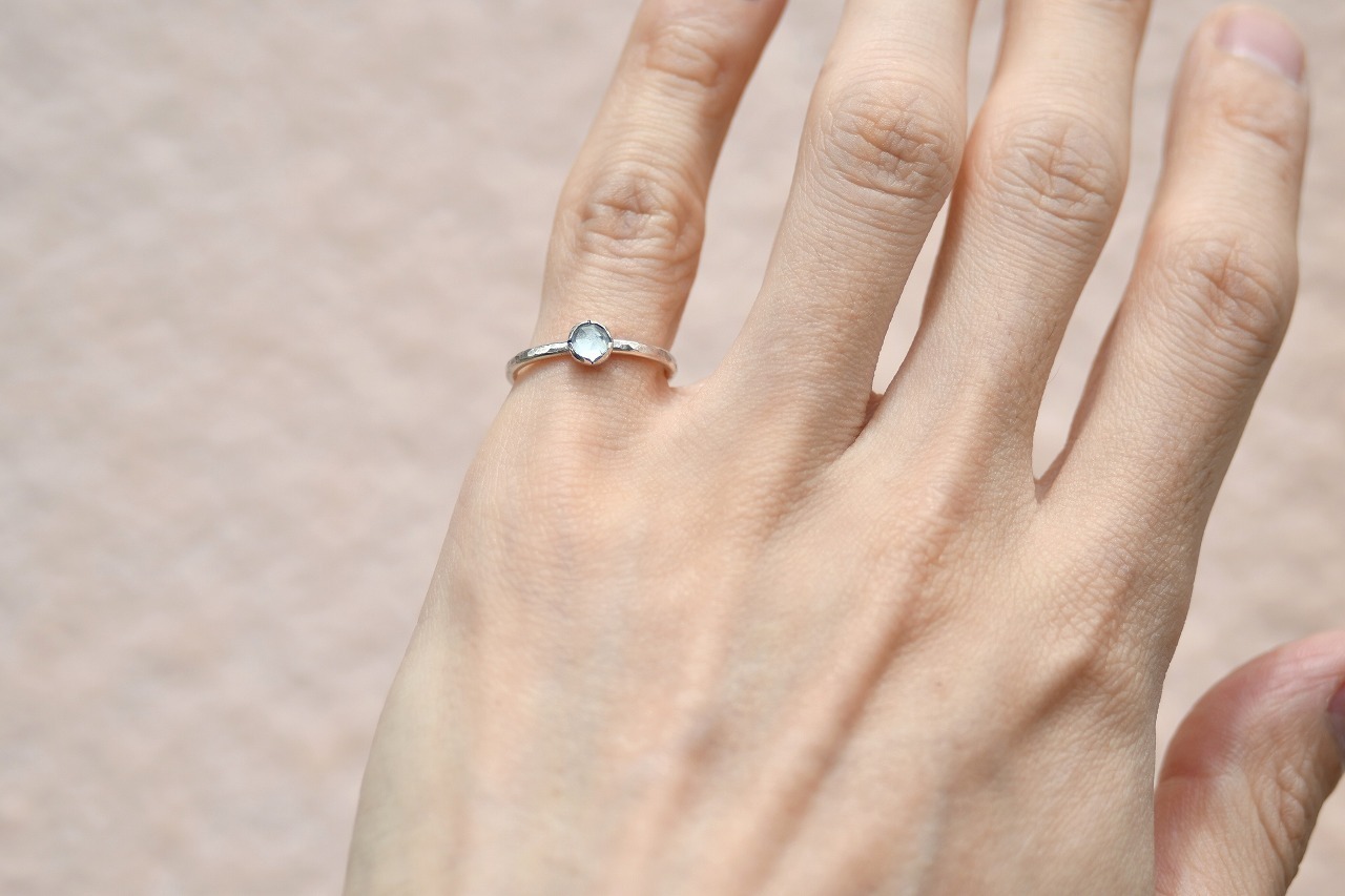 珍しいローズカットのアクアマリンとシルバーの組み合わせはキラキラと光を反射して、さりげなさの中に確かな存在感を楽しめるリングに仕上げることができたと思います。