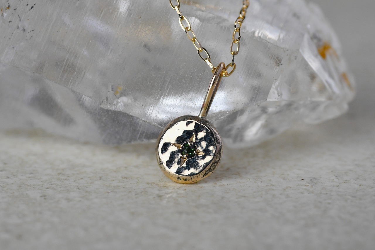 10金の表面に槌目を打って制作を行ったペンダントトップに一粒石を留めて制作を行う作品シリーズになります。