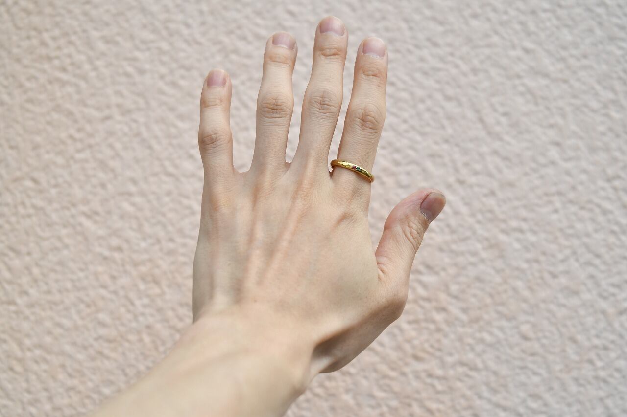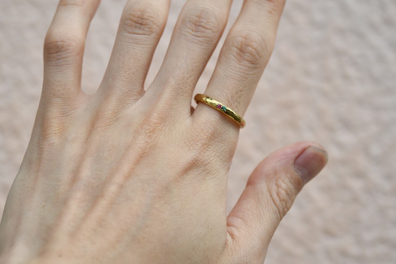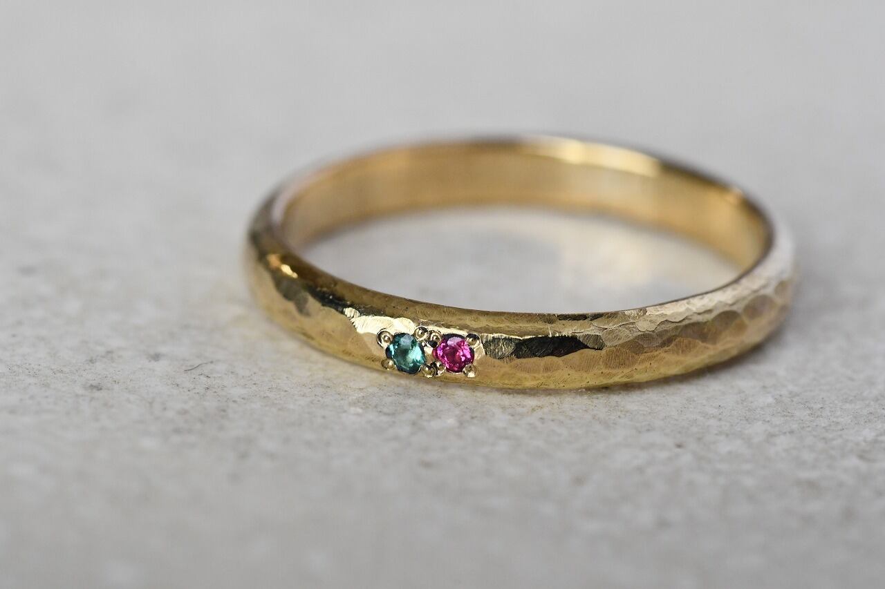 真鍮で制作を行った甲丸リングの表面にピンクスピネルとエメラルドを留めて制作を行ったリングになります。