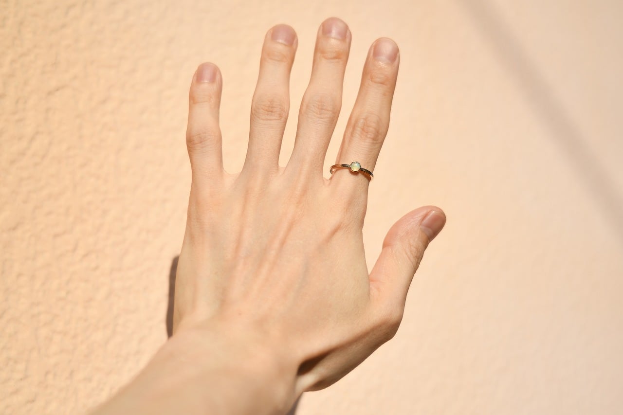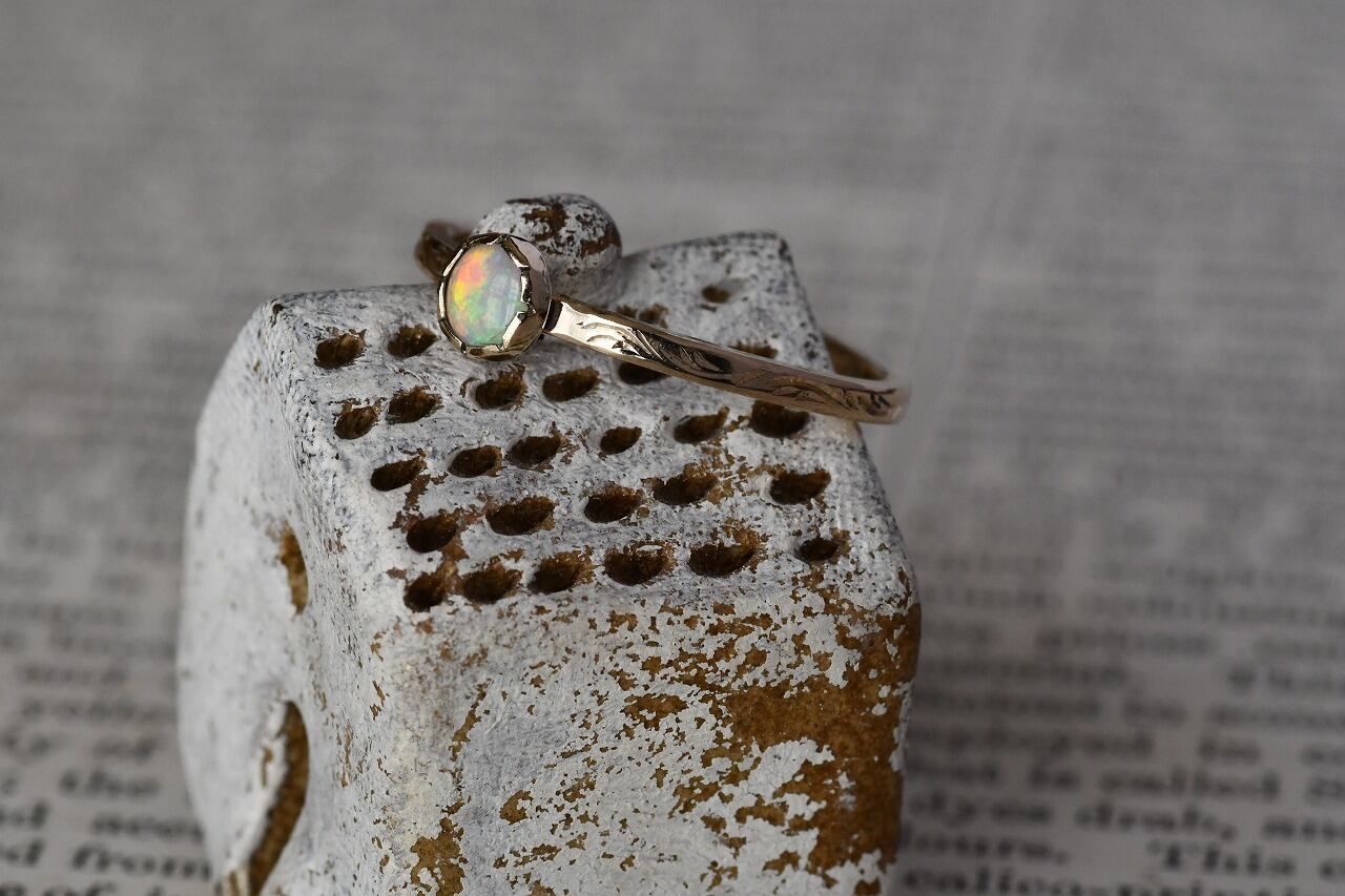 美しいプレシャスオパールと10金の明るい輝き、リング部分には彫りをいれてさりげなくとも気品を感じる作品として仕上げることができました。