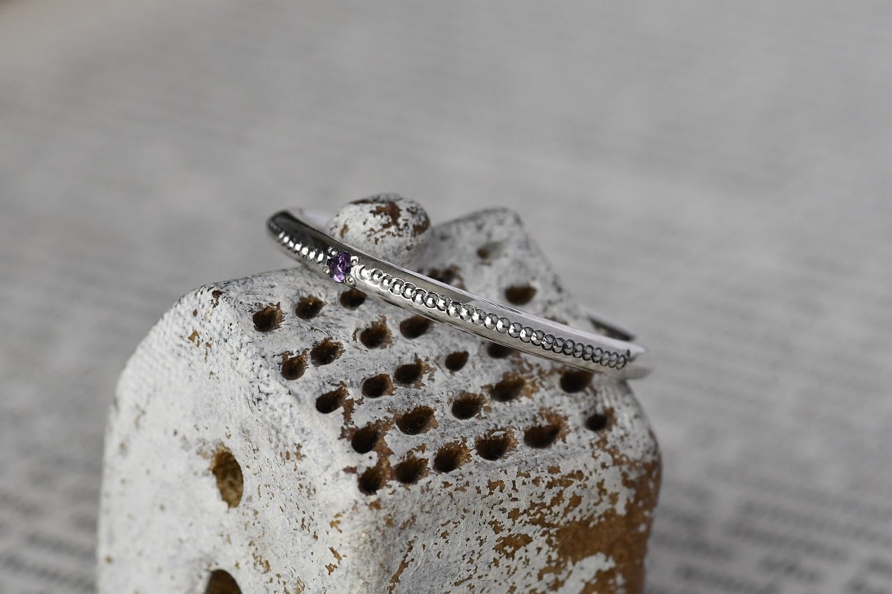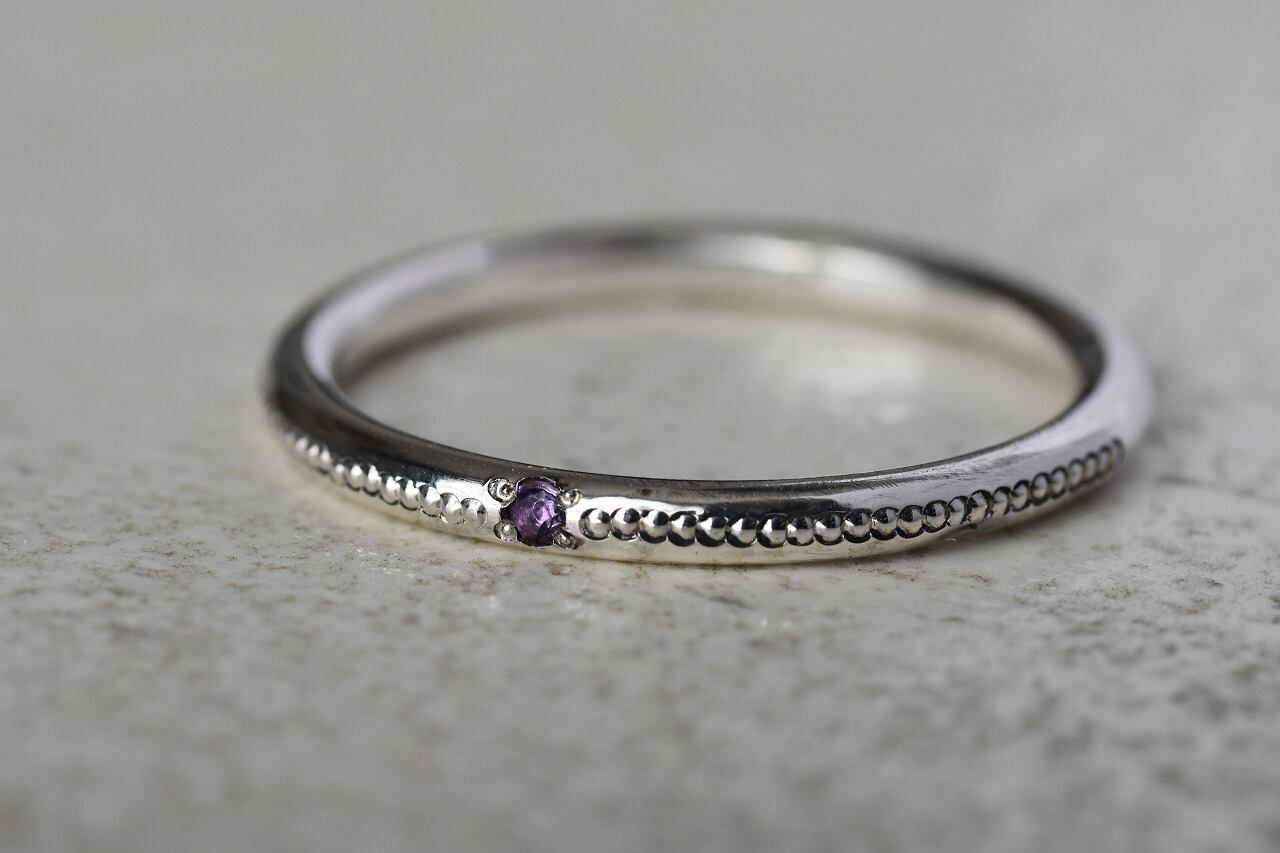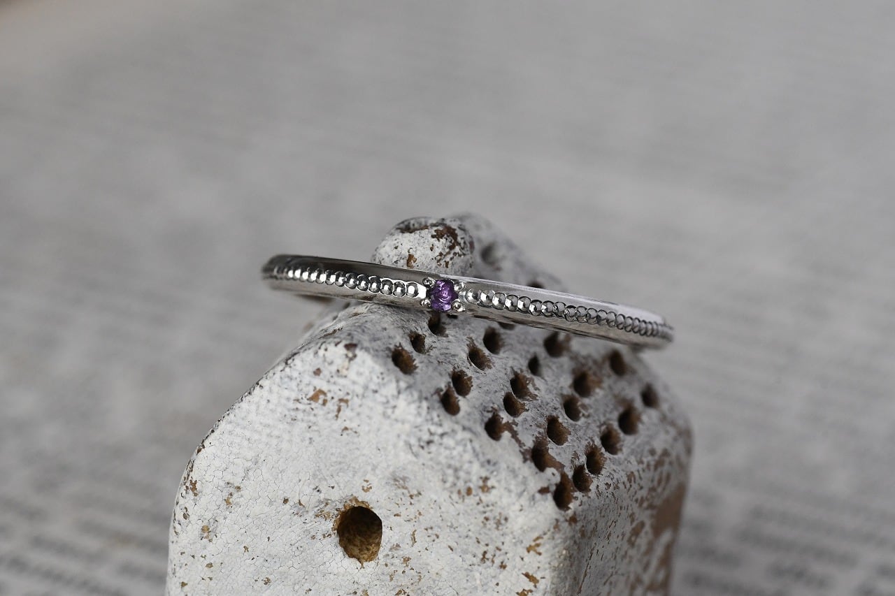 2月の誕生石であるアメジストはその透明な紫色の輝きが最大の特徴で、古来、エジプトやユダヤ教、キリスト教世界などで装飾品などに使われ、特にキリスト教世界では司教の石といわれ全員がこの指輪をはめていたといわれています。古くから「酔わないための石」と伝えれれていて、感情の波などに飲み込まれて酔わないようにという願いも込められていたようです。