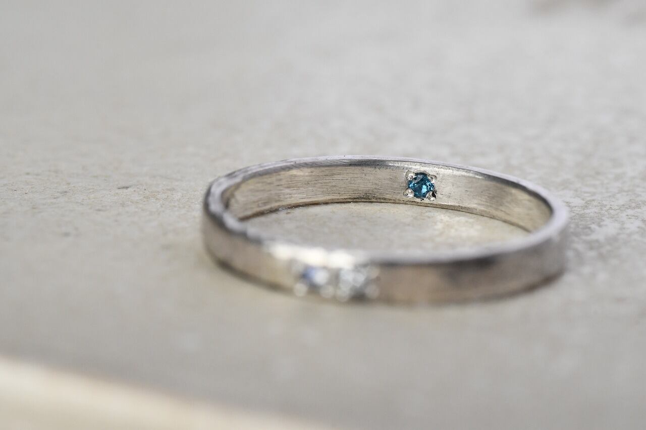 シンプルな平打ちの槌目リングの表面にブルームーンストーンとダイアモンド・裏面にロンドンブルートパーズを留めて制作を行いました。さらりと身に着けやすくも他にはない特別感を感じられる作品に仕上げることができました。