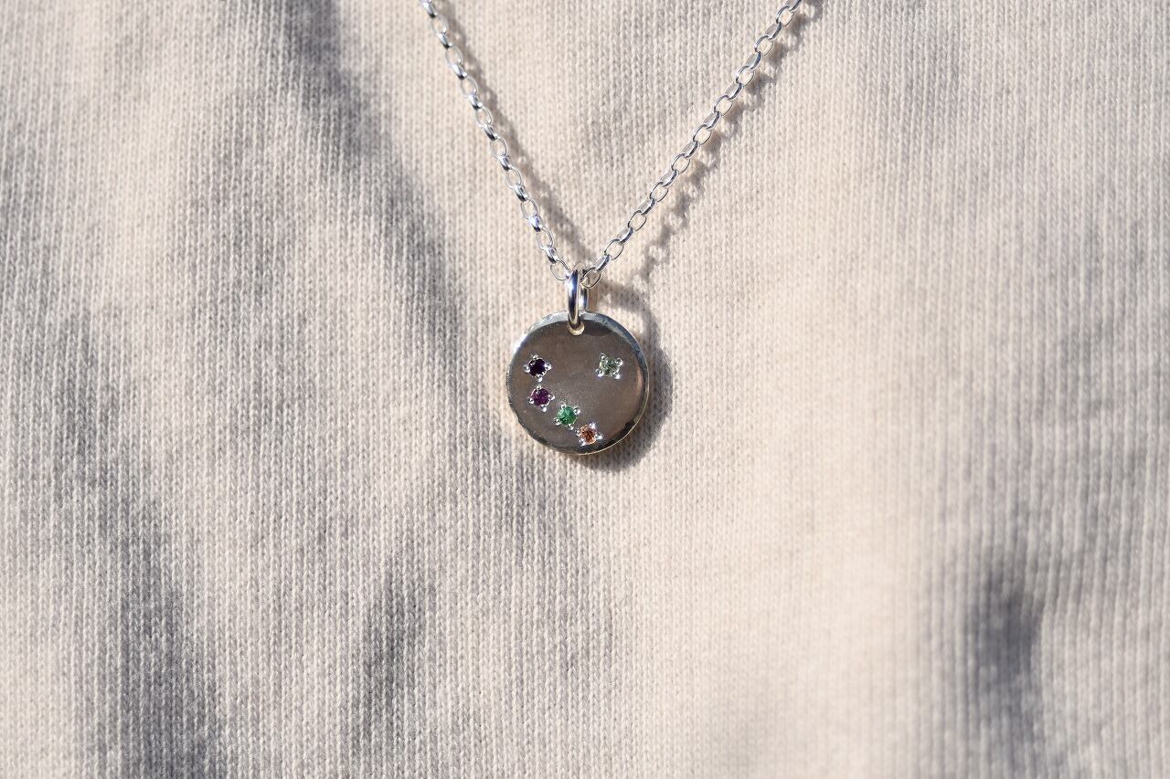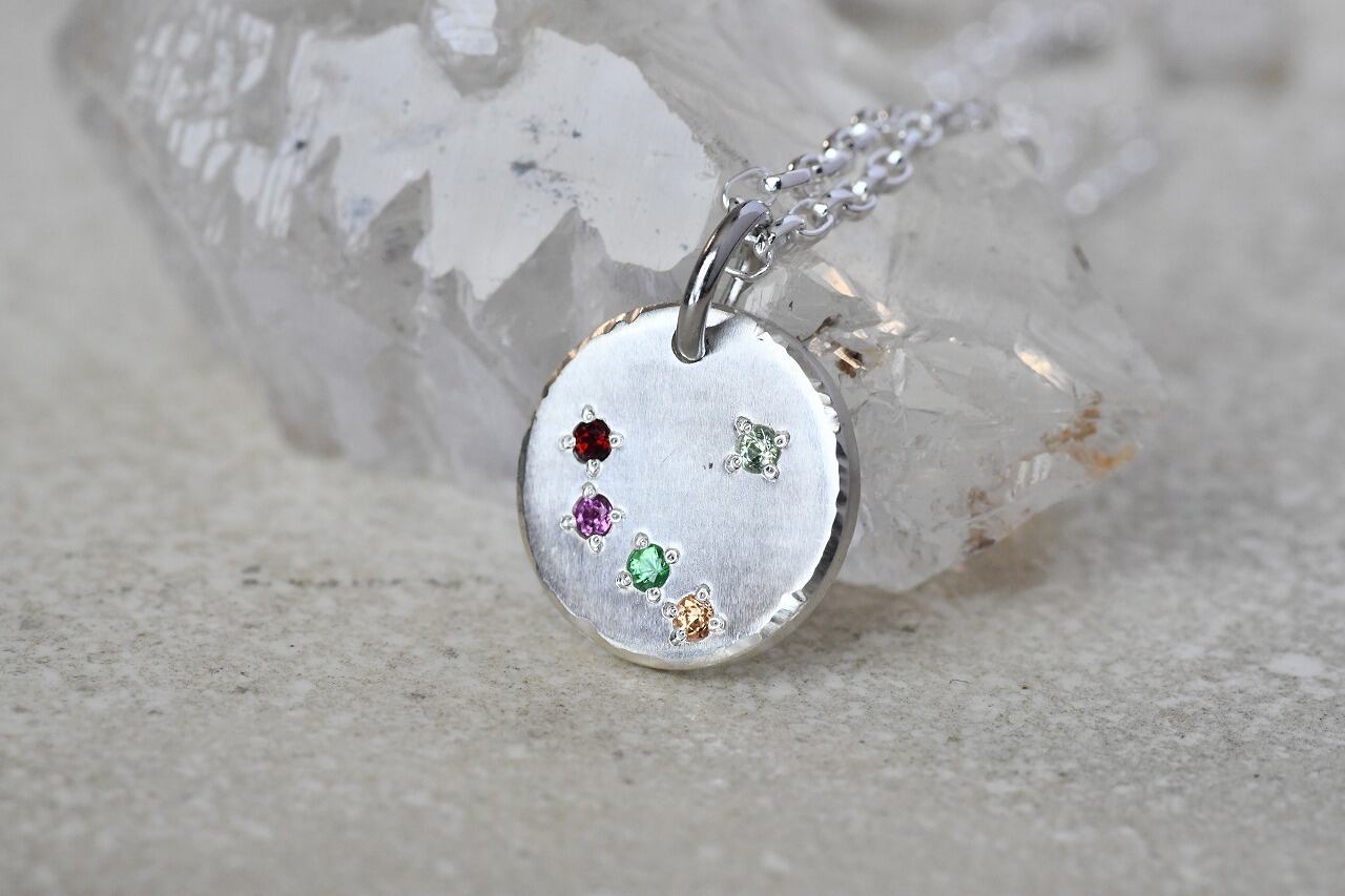 丸いシルバーのペンダントトップに5色のガーネットを留めて制作を行いました。通常ガーネットと言えば深い赤色を思い浮かべると思いますが実に多様な色がある魅力的な石でもあります。