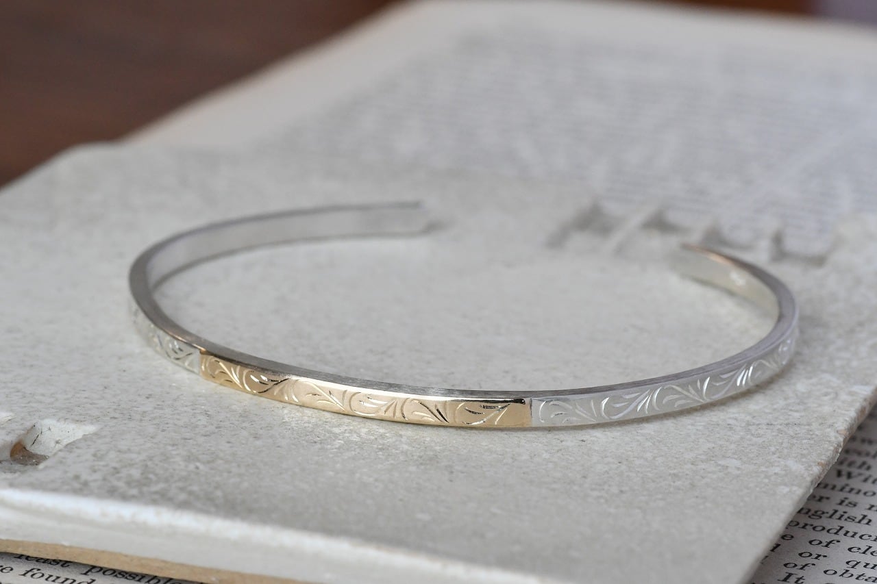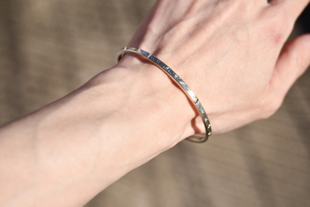 両サイドにアメジストとアイオライトを留め、全周に渡って唐草彫りを和彫りの技術を使って施した作品になります。