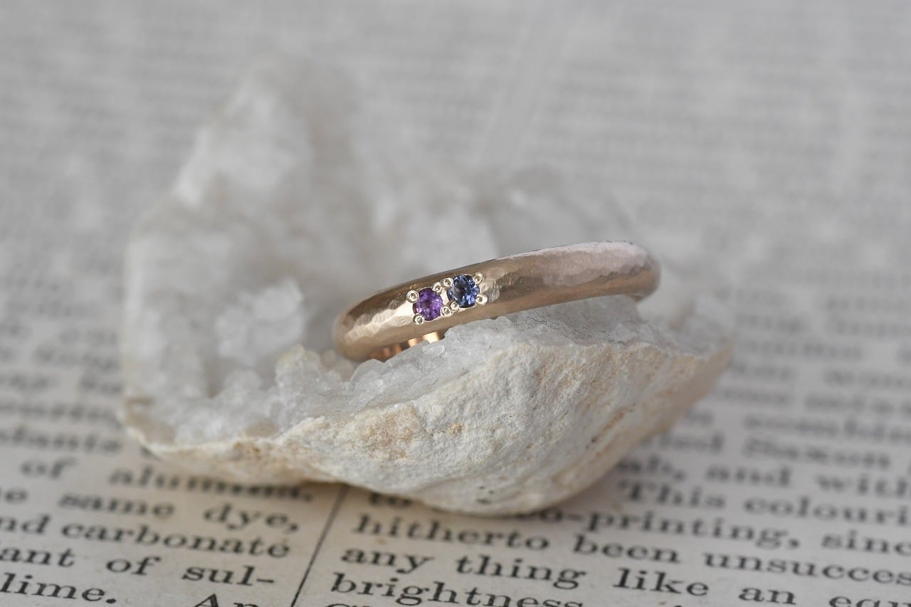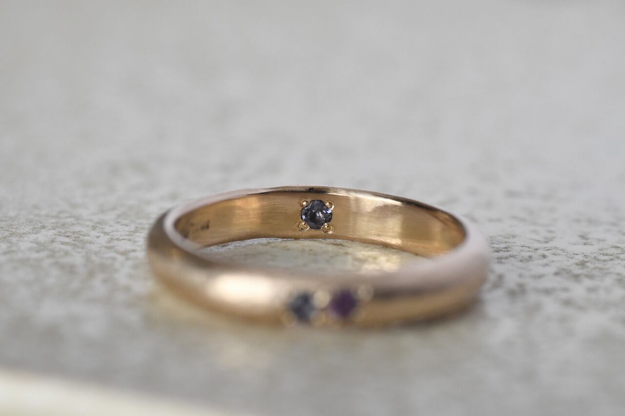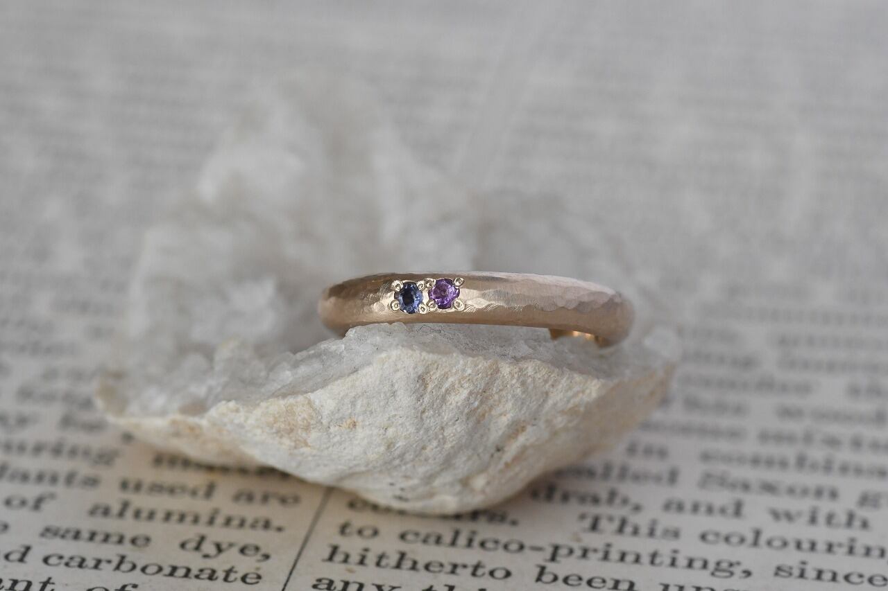 10金に槌目を打って制作を行った甲丸リングに美しいアイオライトとアメジストを留めて、リングの内側にもアイオライトを一粒留めて制作を行った作品になります。