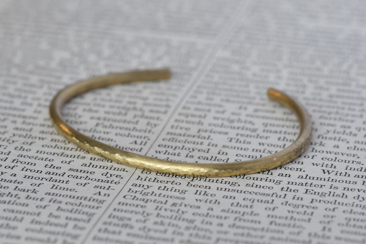 銅と亜鉛を混ぜ合わせた金属で、新品時はまるで黄金の様な輝きを放ち、時間の経過とともに空気中の成分の影響で『硫化』という現象を起こし黒ずんでくる特徴がございます。『硫化』することによりまるでアンティークの様な落ち着いた雰囲気に作品が変化していき、輝く真鍮と落ち着きの真鍮2つの顔を楽しむことができるある意味贅沢な金属でもあります。真鍮の黒ずみやくすみなどが気になる場合は市販の真鍮用の研磨剤などで磨いて元の輝きに戻すこともできます。日常での保管に硫化防止用の袋に入れる、硫化防止チップを密封できる袋にいれてそれと一緒に保管するなどの方法でも黒ずみを抑えることができます。