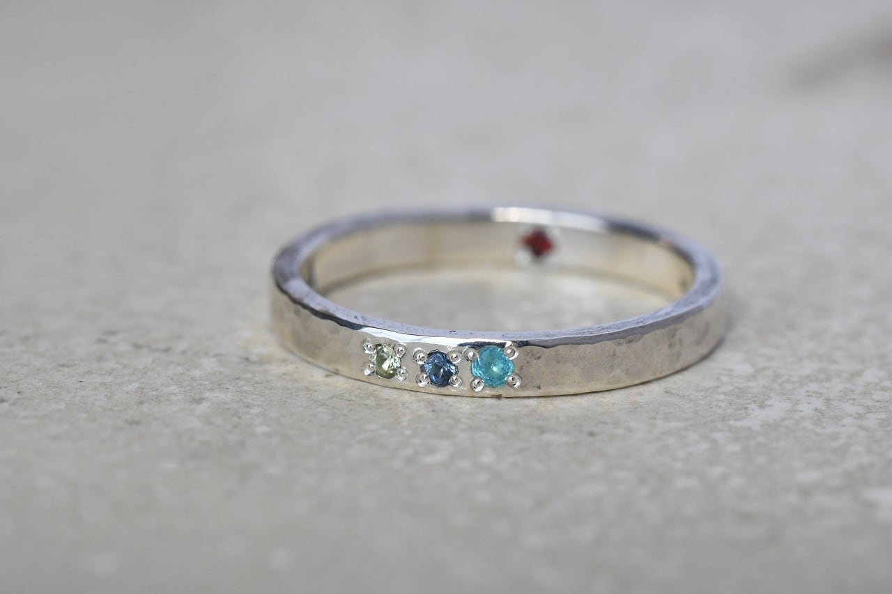 シンプルな平打ちの槌目リングの表面にペリドット・コーンフラワーブルーサファイア・パライバトルマリン・裏面にガーネットを留めて制作を行いました。さらりと身に着けやすくも他にはない特別感を感じられる作品に仕上げることができました。