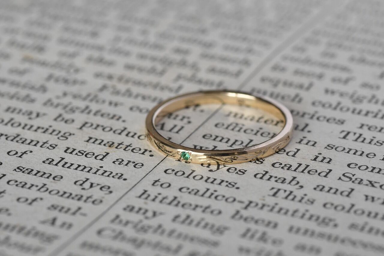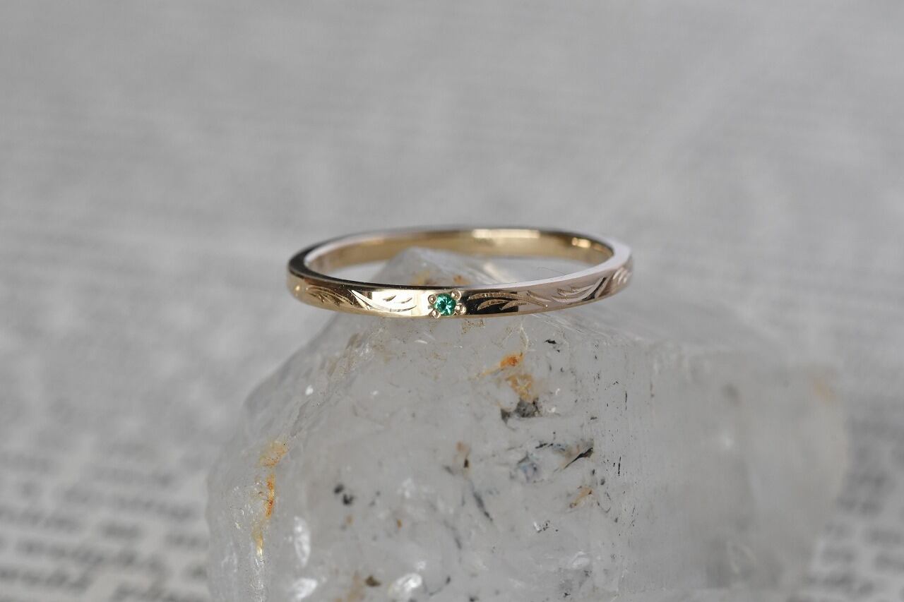 細身のプレーンな平打ちリングに一粒エメラルドを留めたシンプルなデザインの作品に稲穂イメージの彫りを一周入れて制作を行っております。