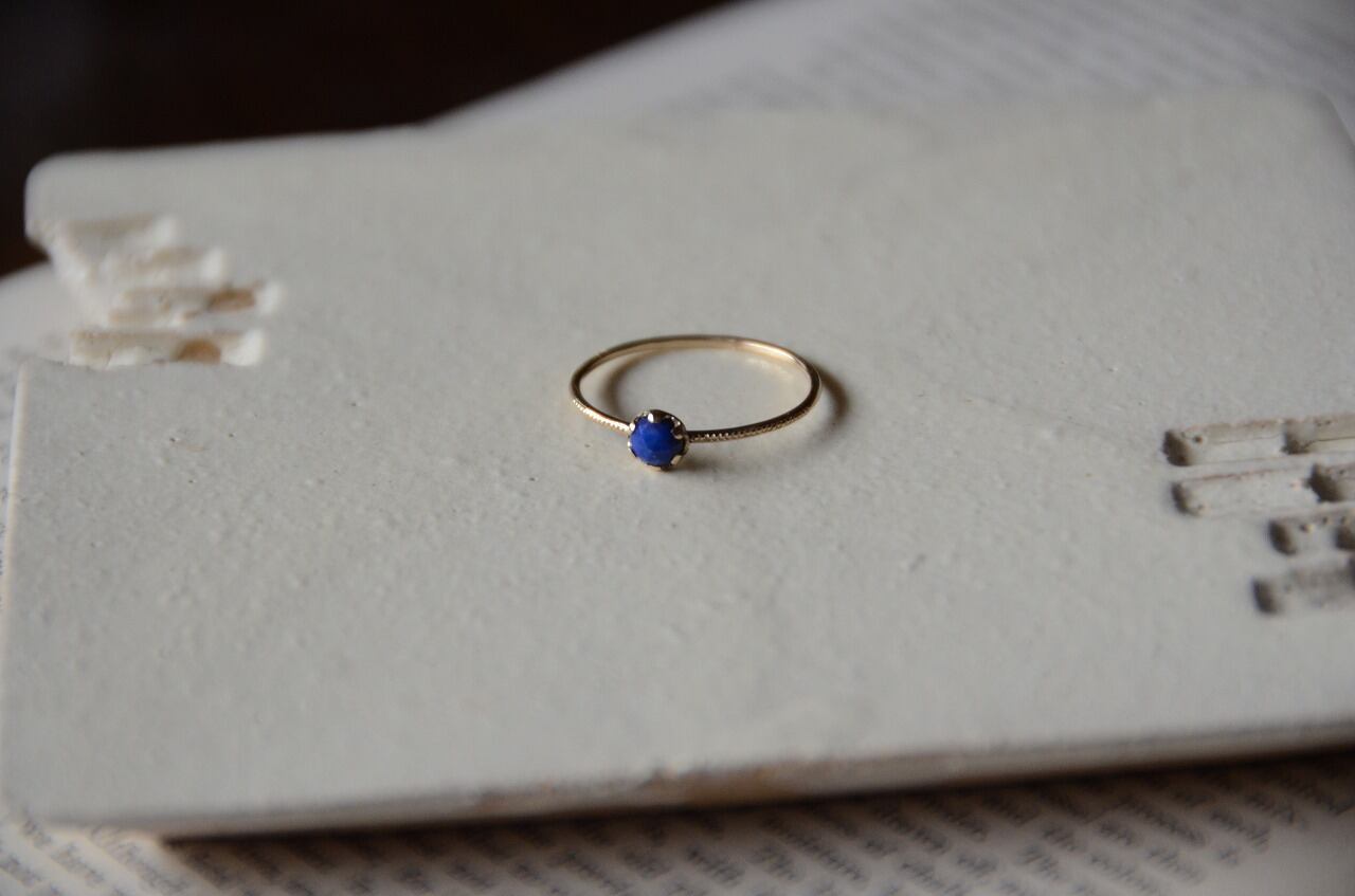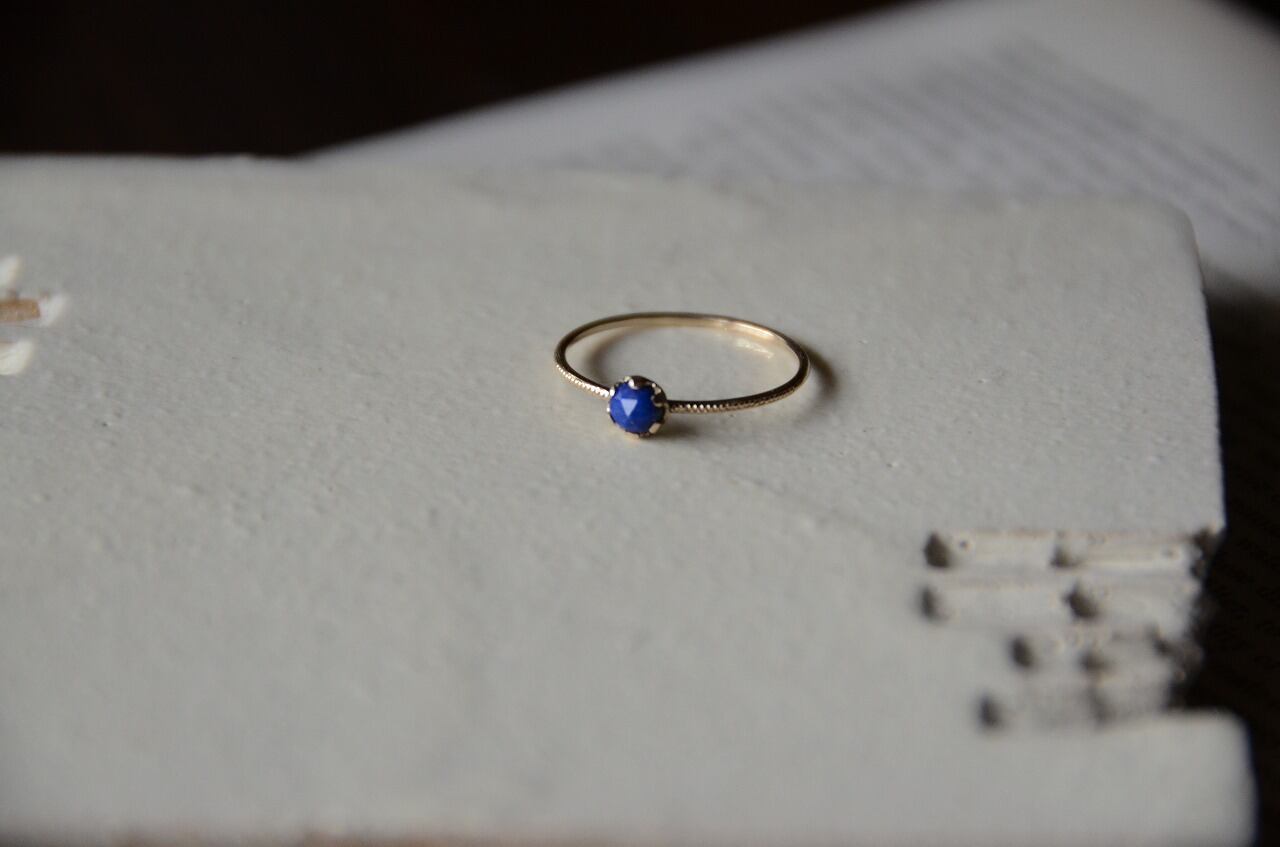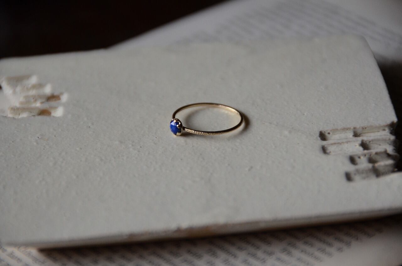 12月の誕生石の一つでもあるラピスラズリ、その美しい色はゴールドカラーと合わせても本当に美しく、ミル打ちを施したリングのおかげでより夜空に輝く星々の感じを演出できたと思っております。シンプルだけどその光は美しく上質で落ち着いた雰囲気を楽しんでもらえたらと思っております。