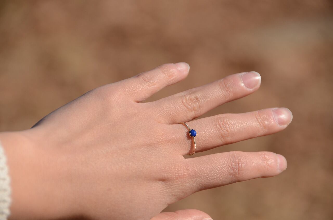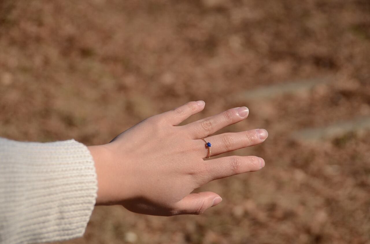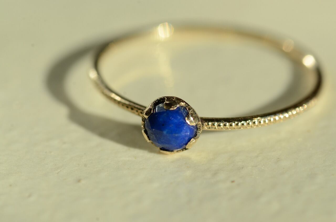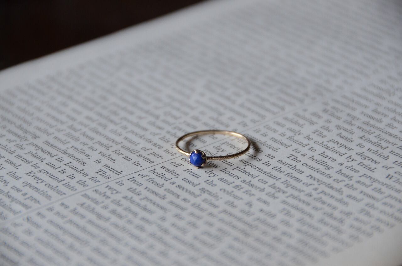 12月の誕生石の一つでもあるラピスラズリ、その美しい色はゴールドカラーと合わせても本当に美しく、ミル打ちを施したリングのおかげでより夜空に輝く星々の感じを演出できたと思っております。シンプルだけどその光は美しく上質で落ち着いた雰囲気を楽しんでもらえたらと思っております。