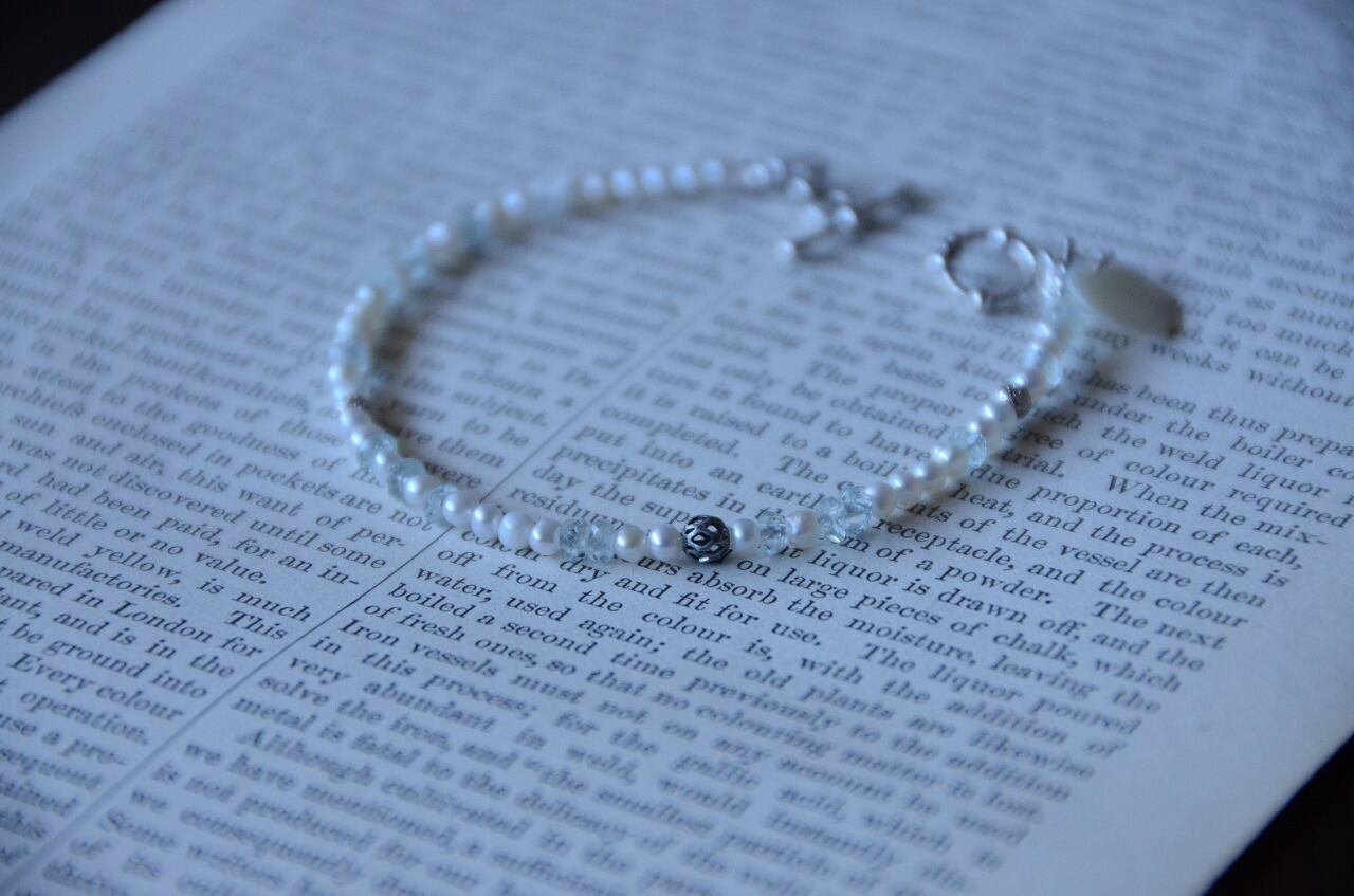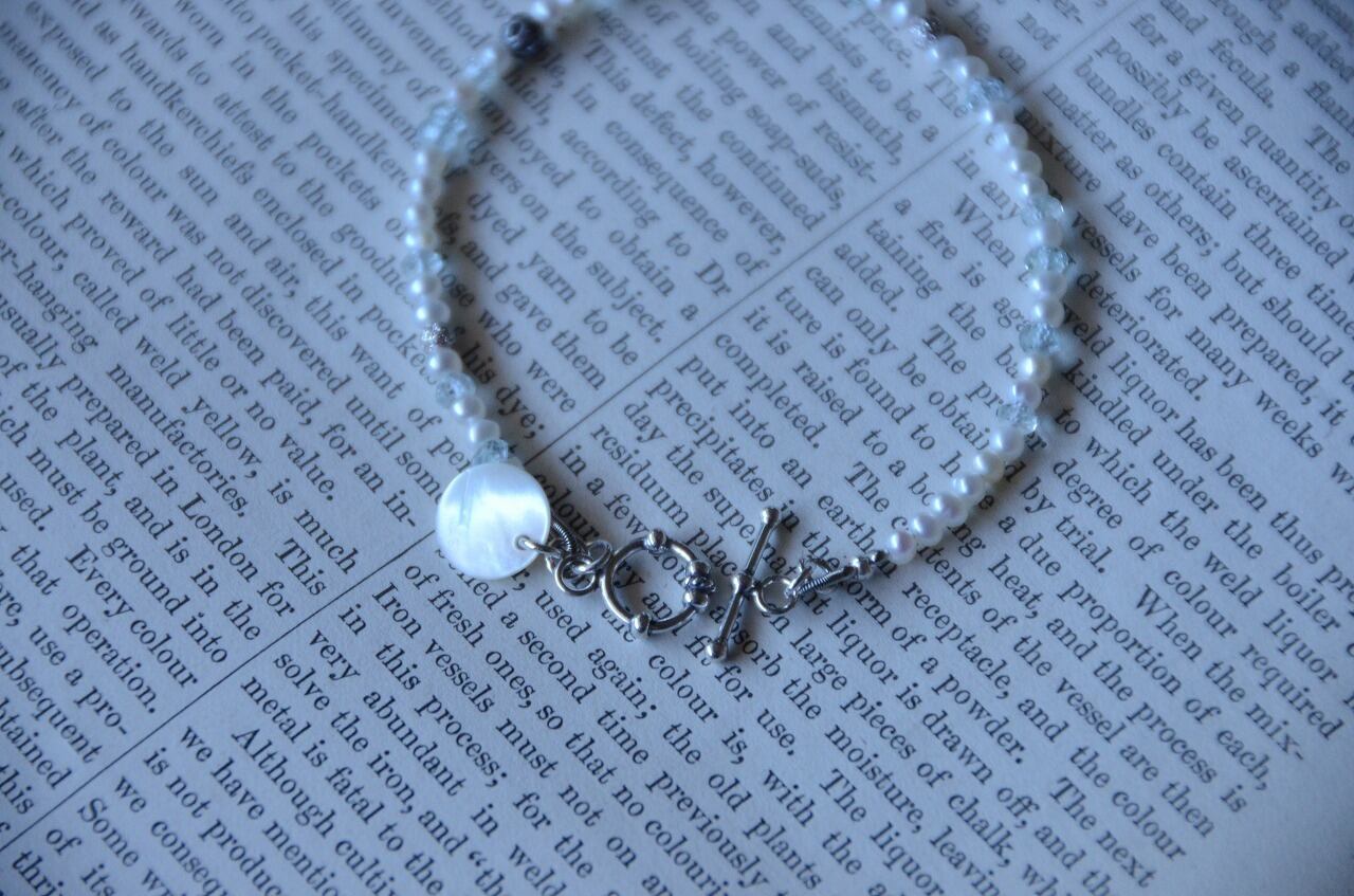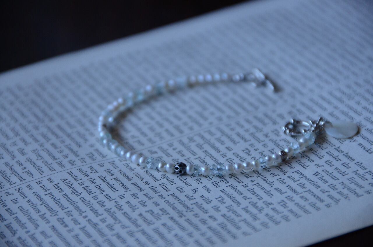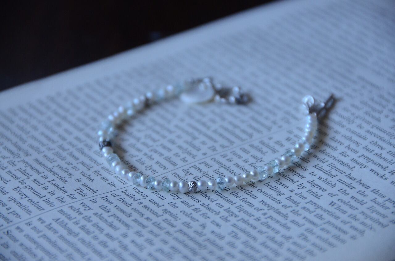 シンプルながら上質な淡水パールとアクアマリンのおかげで他にはない特別を感じられる作品に仕上がったと思っております。