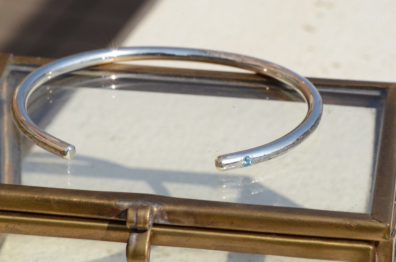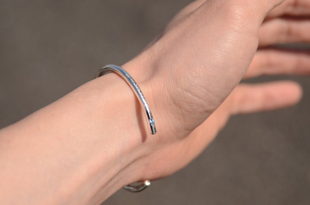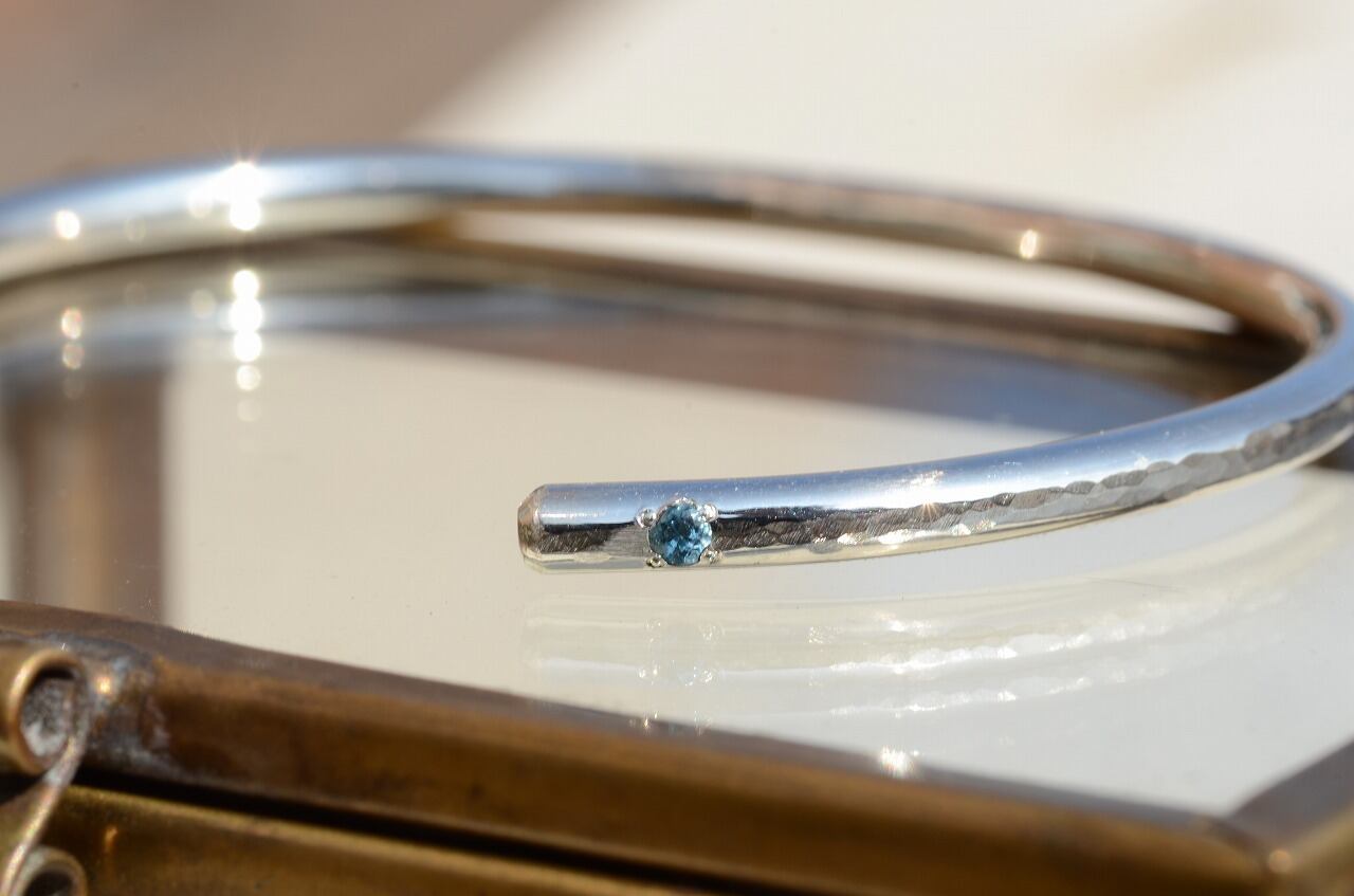 近頃金属に埋め込むように石を留めることが増えてきて今まで作ってきたバングルをベースに今回は丸みのあるバングルに石を留めてみました。