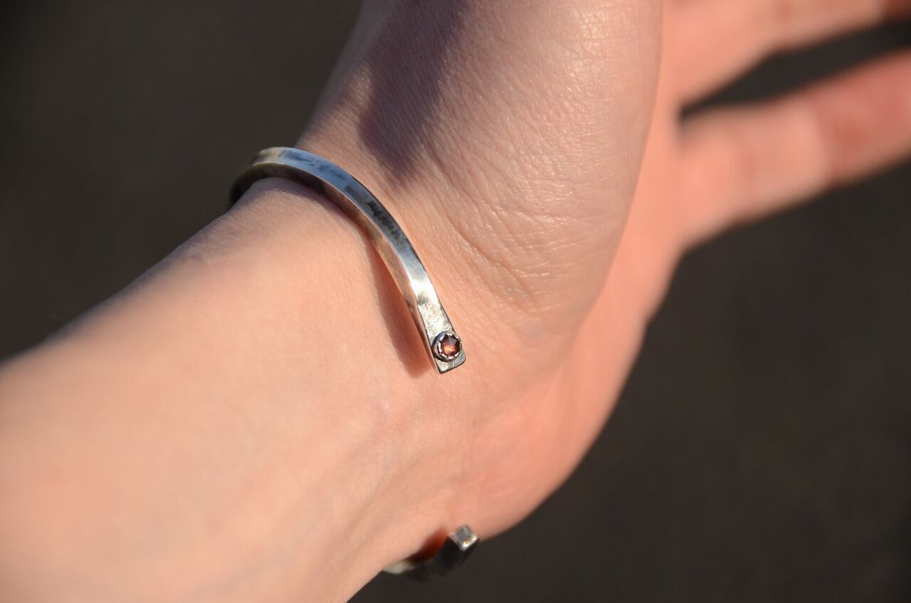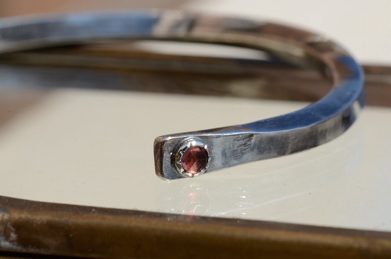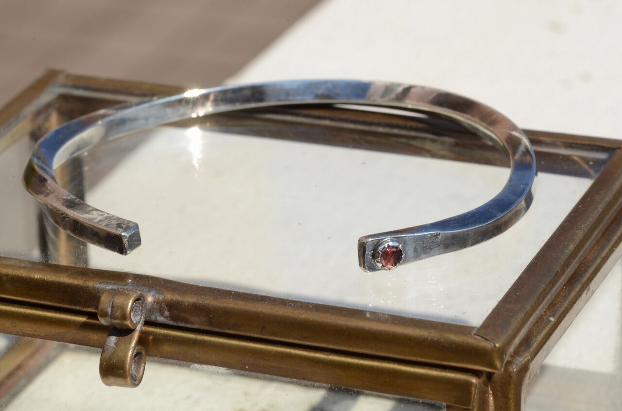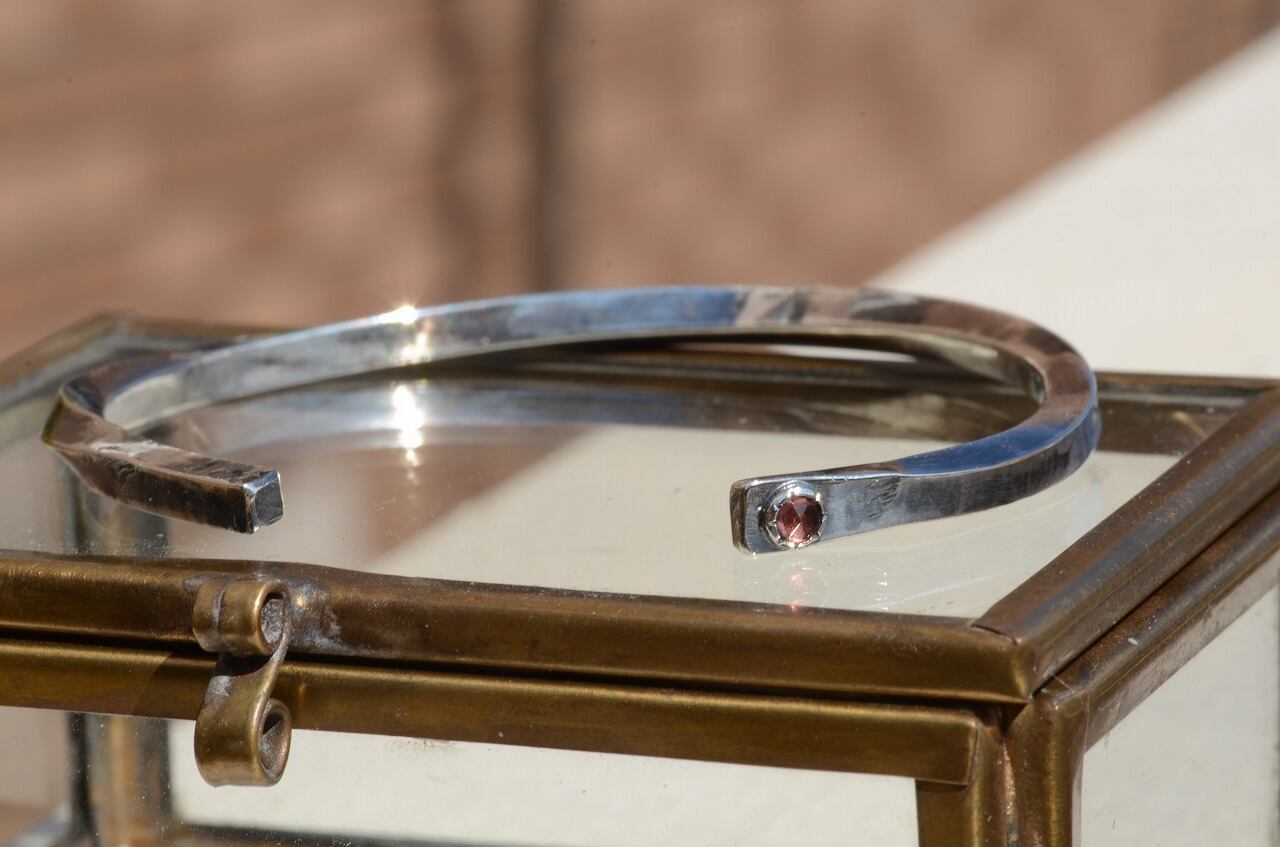 オーダーをいただき制作を行った今回の作品、シルバーのバングルをベースにそこに一粒の美しいローズカットのガーネットを留めてみました。ローズカットの石を見るとなんだかいつも天体や天をイメージするので今回の作品のタイトルに天という言葉が入っております。