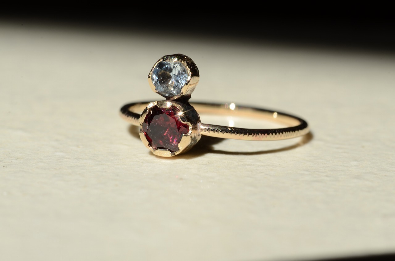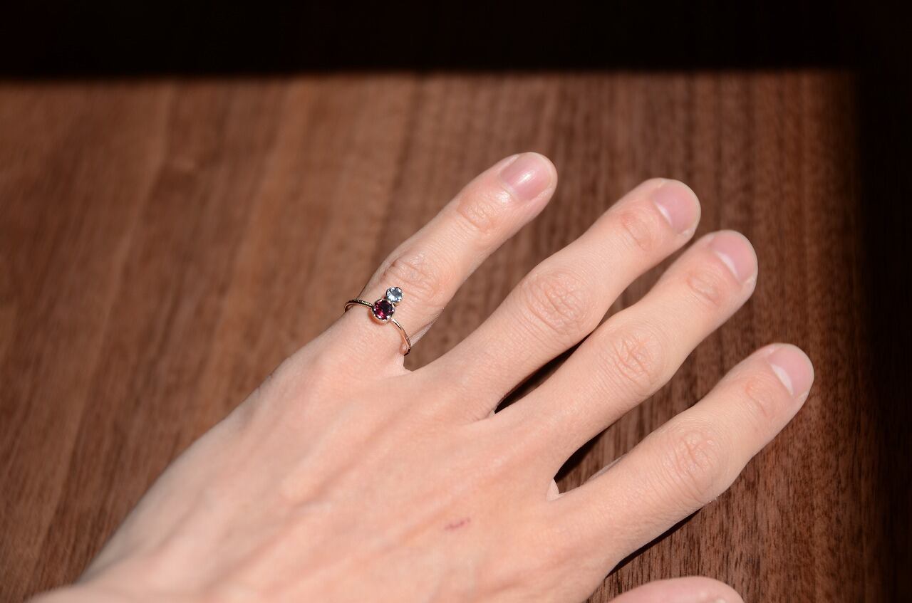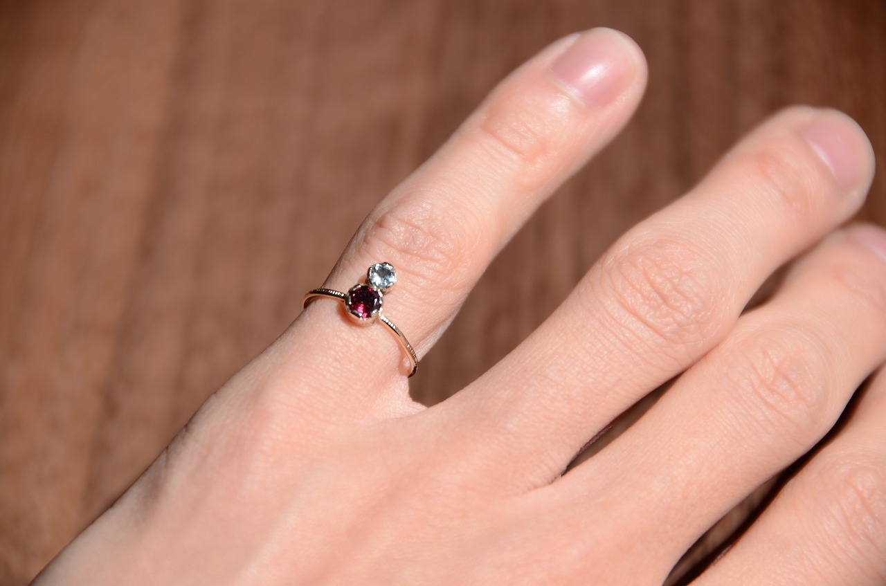 美しいロードライトガーネットの輝きとそこに合わせたのはアクアマリンの透き通ったような輝き、異なる色を持つ石ですがそれでも重なり合うことで一つの方向へ進んでいくようなそんな可能性を見せてくれる作品になりました。