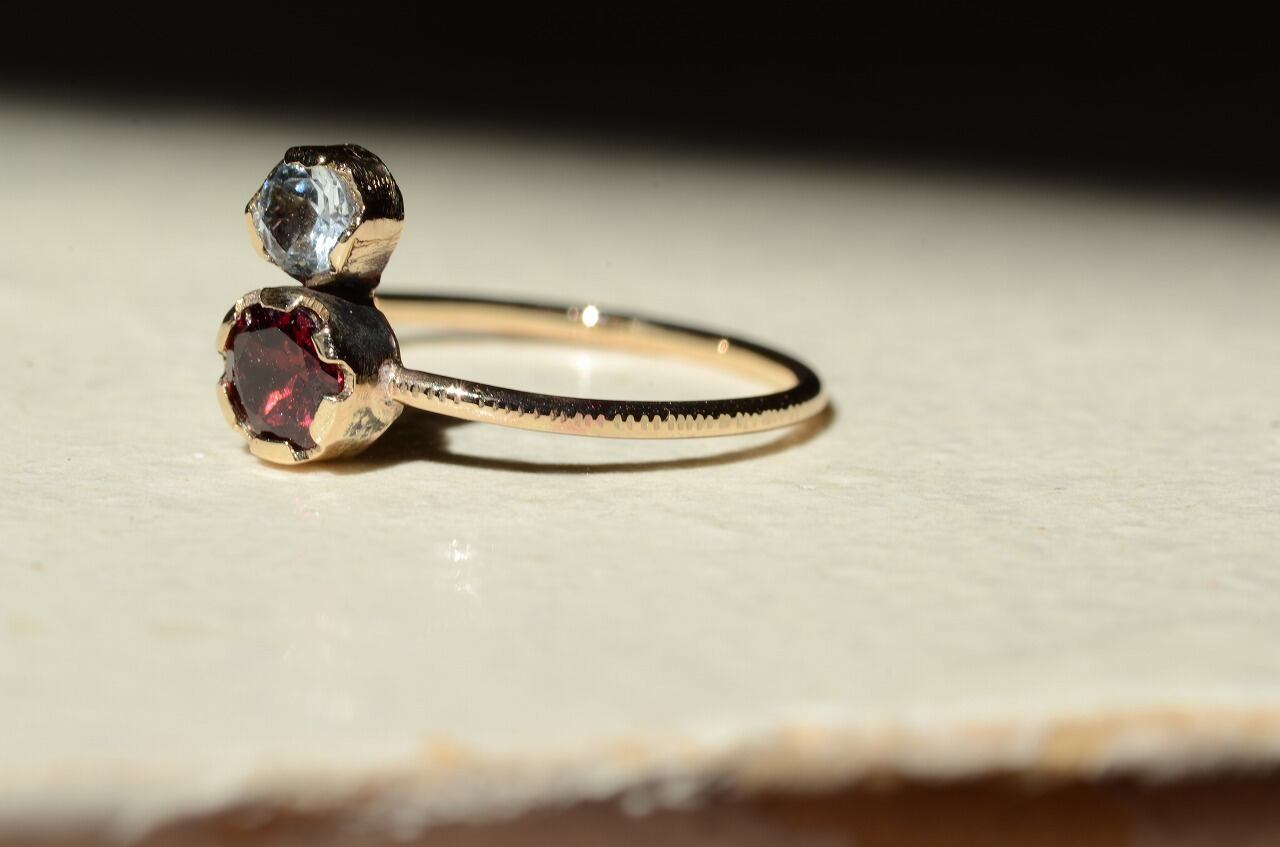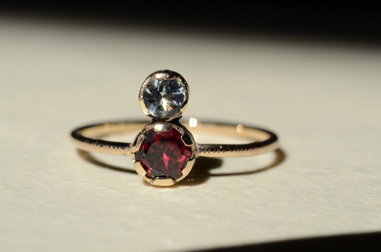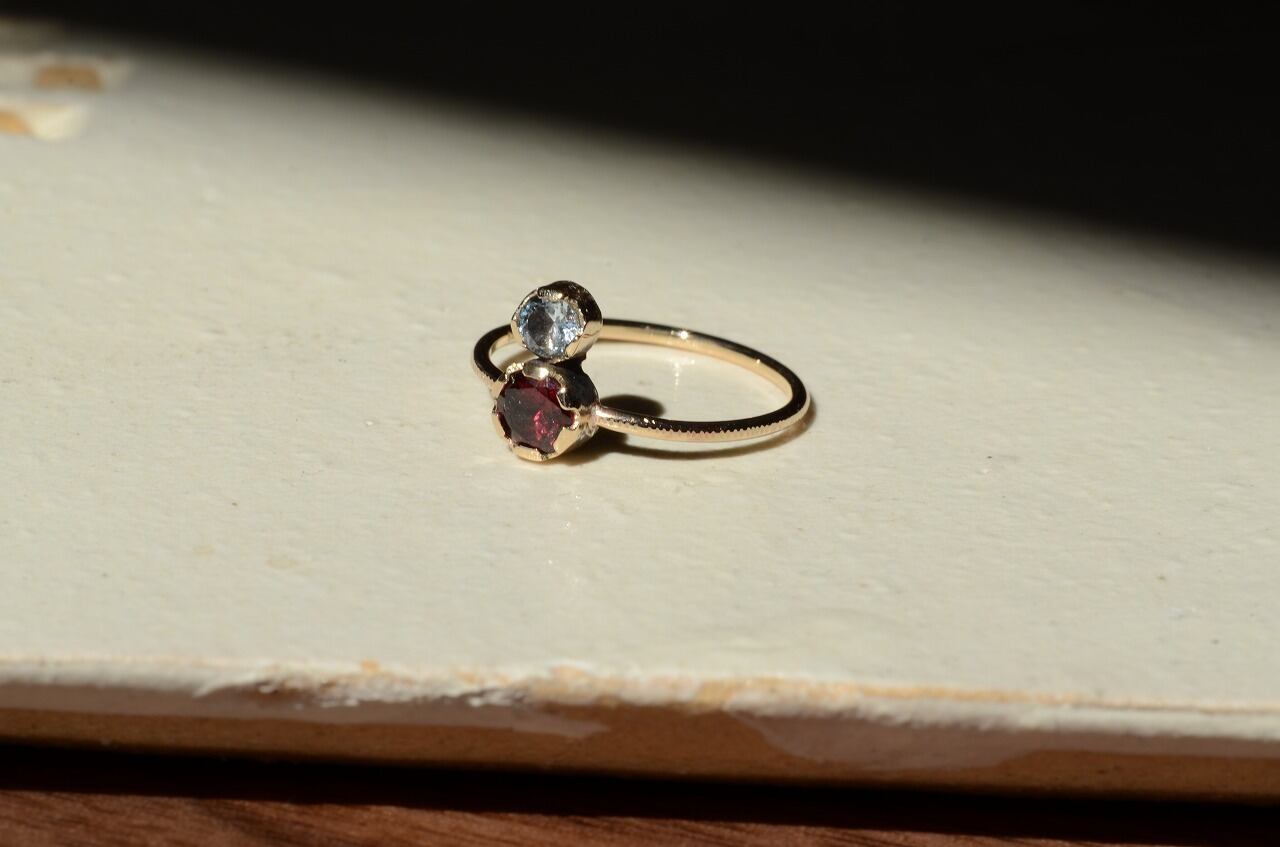 美しいロードライトガーネットの輝きとそこに合わせたのはアクアマリンの透き通ったような輝き、異なる色を持つ石ですがそれでも重なり合うことで一つの方向へ進んでいくようなそんな可能性を見せてくれる作品になりました。
