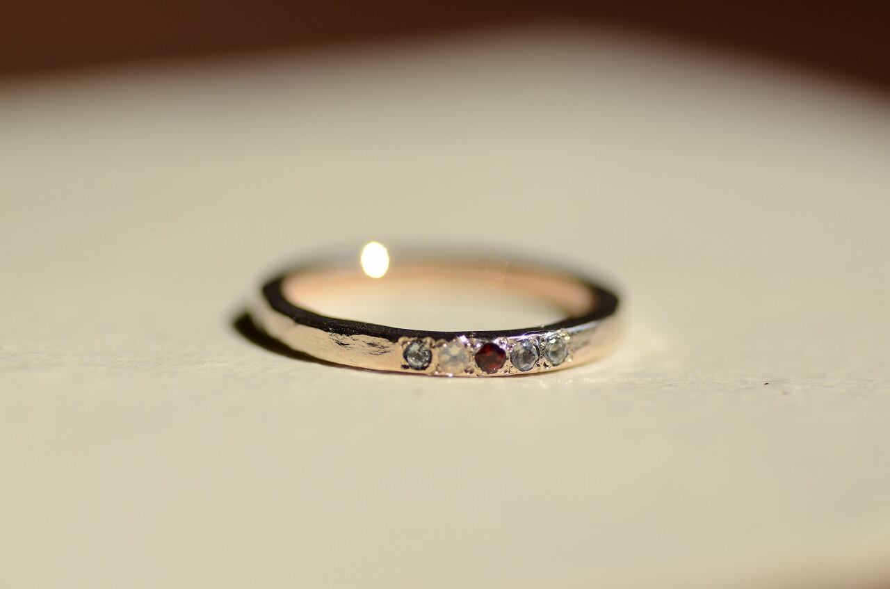 真ん中で存在感を放つのが深紅のガーネット、そのガーネットを囲むようにブルームーンストーンを配置して、一番外側には薄い水色のアクアマリン