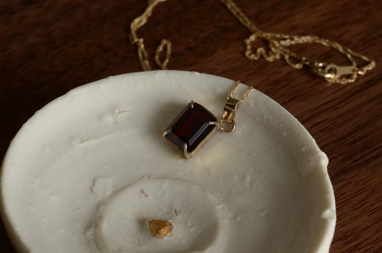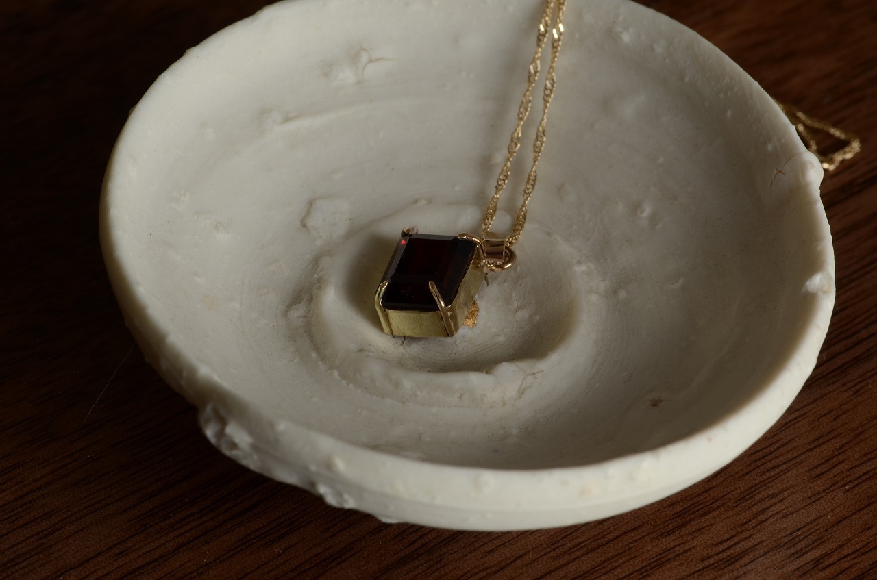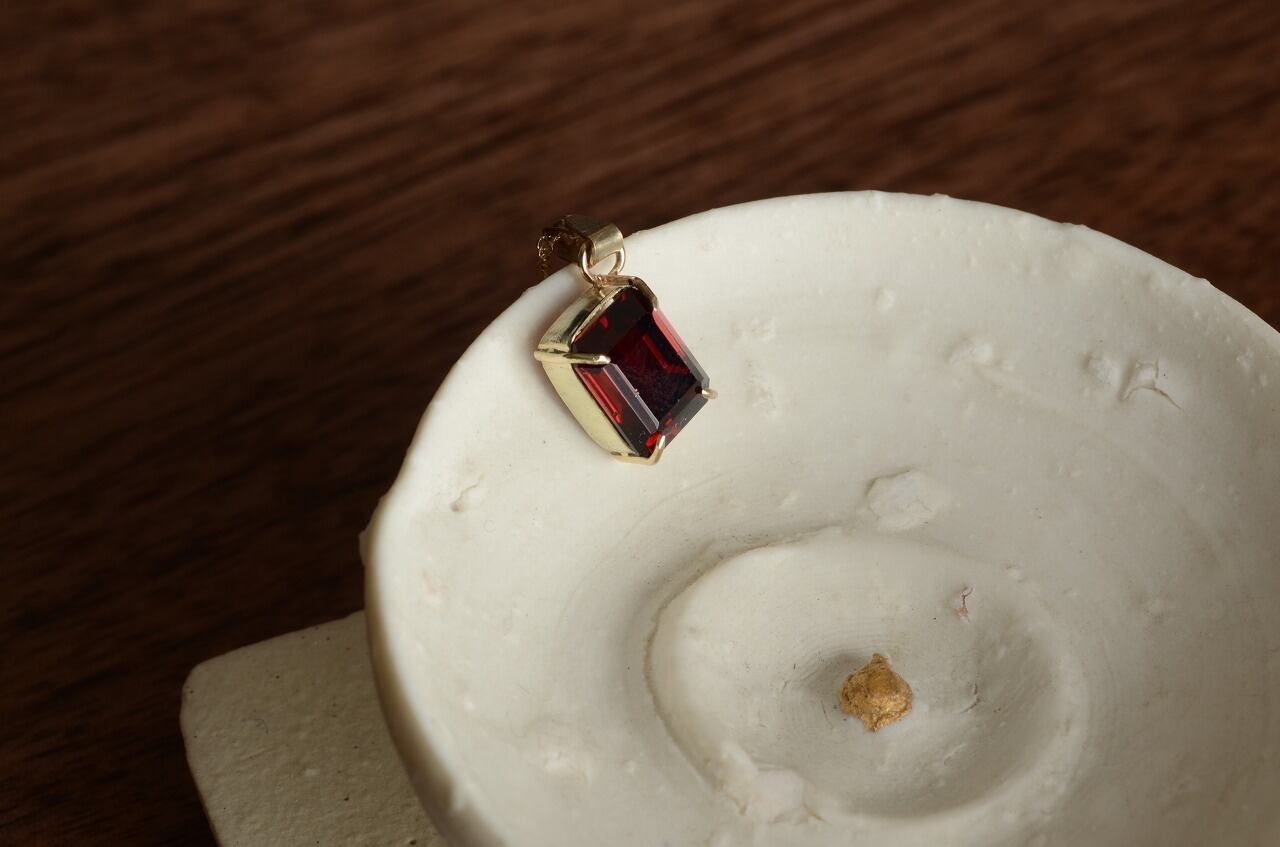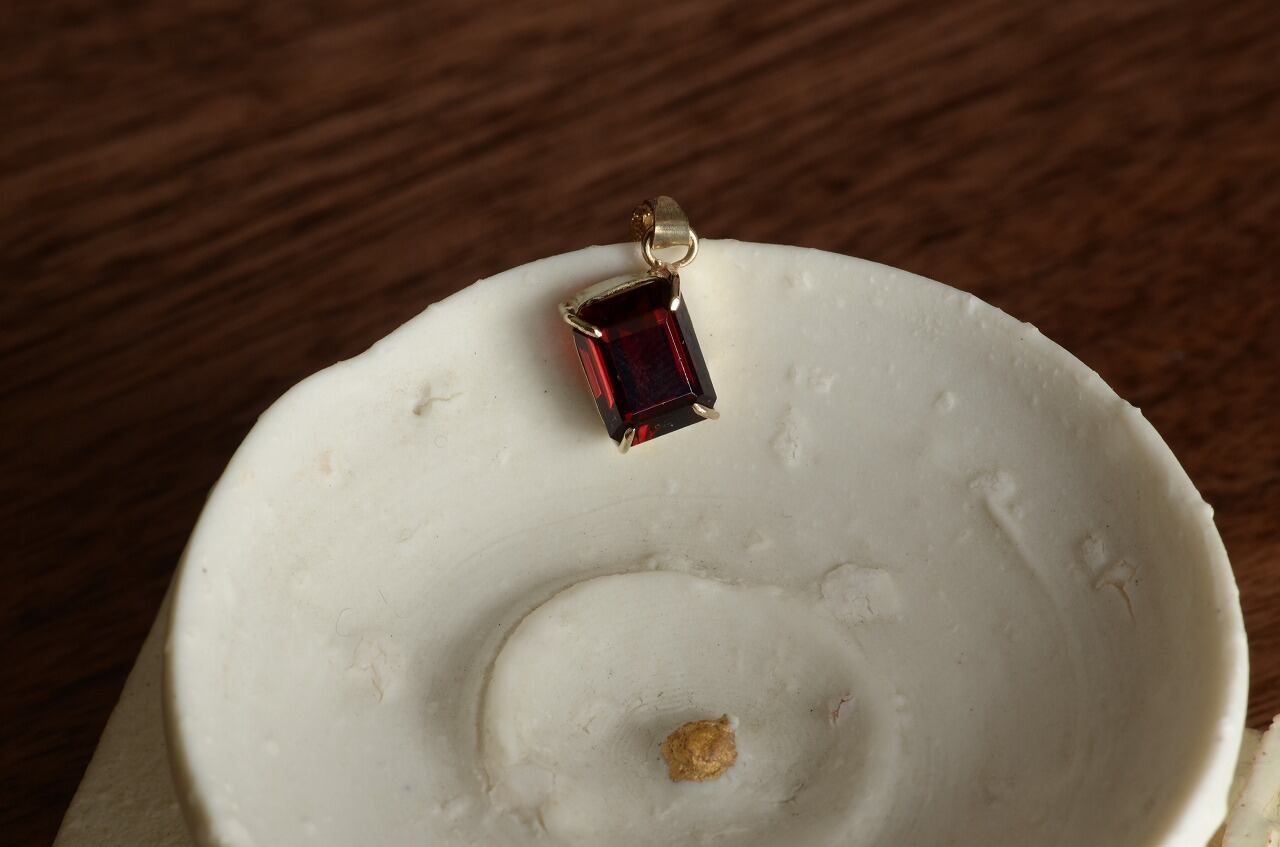 深くて美しいガーネットを10金で爪留めして制作を行いました