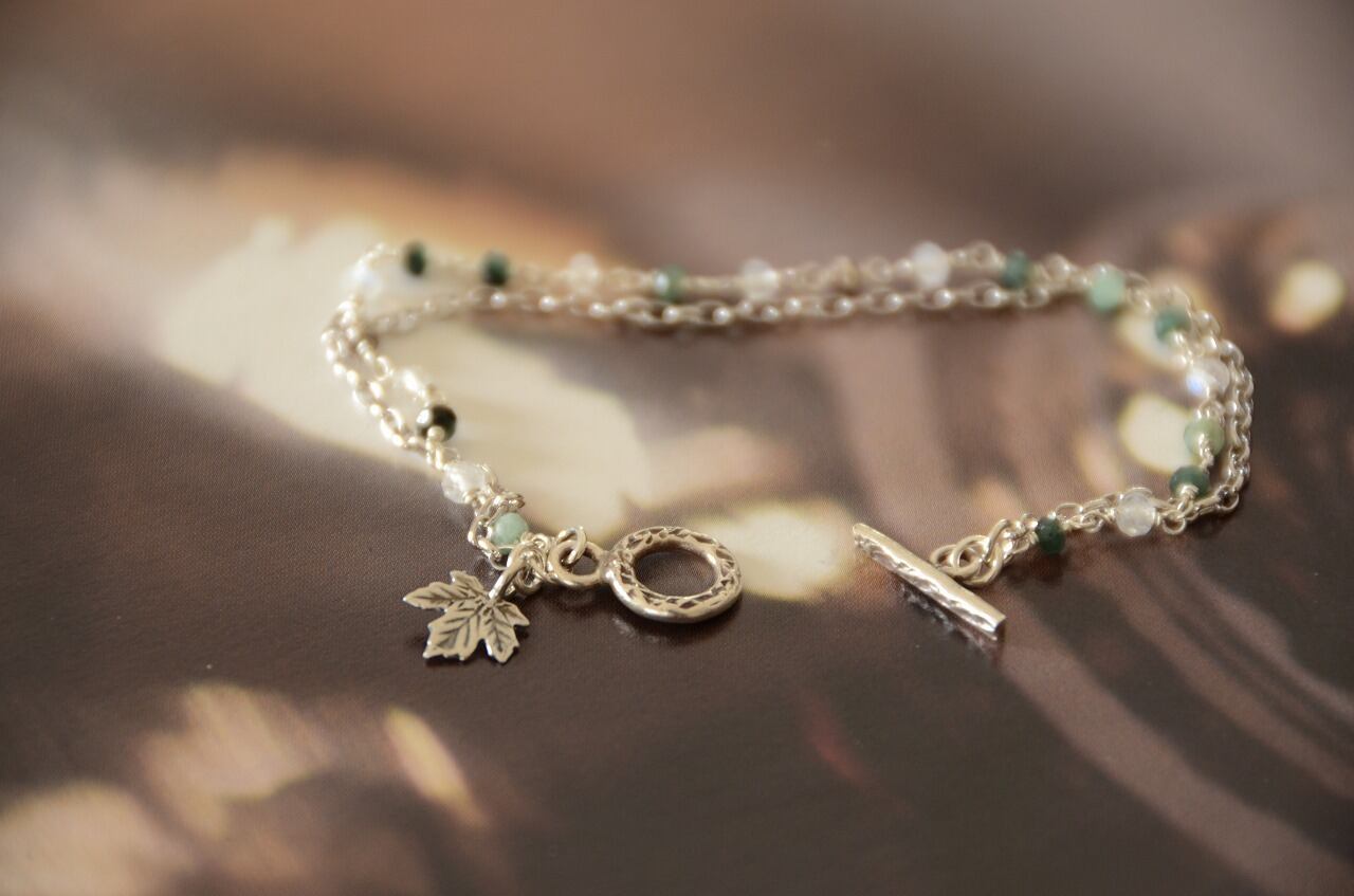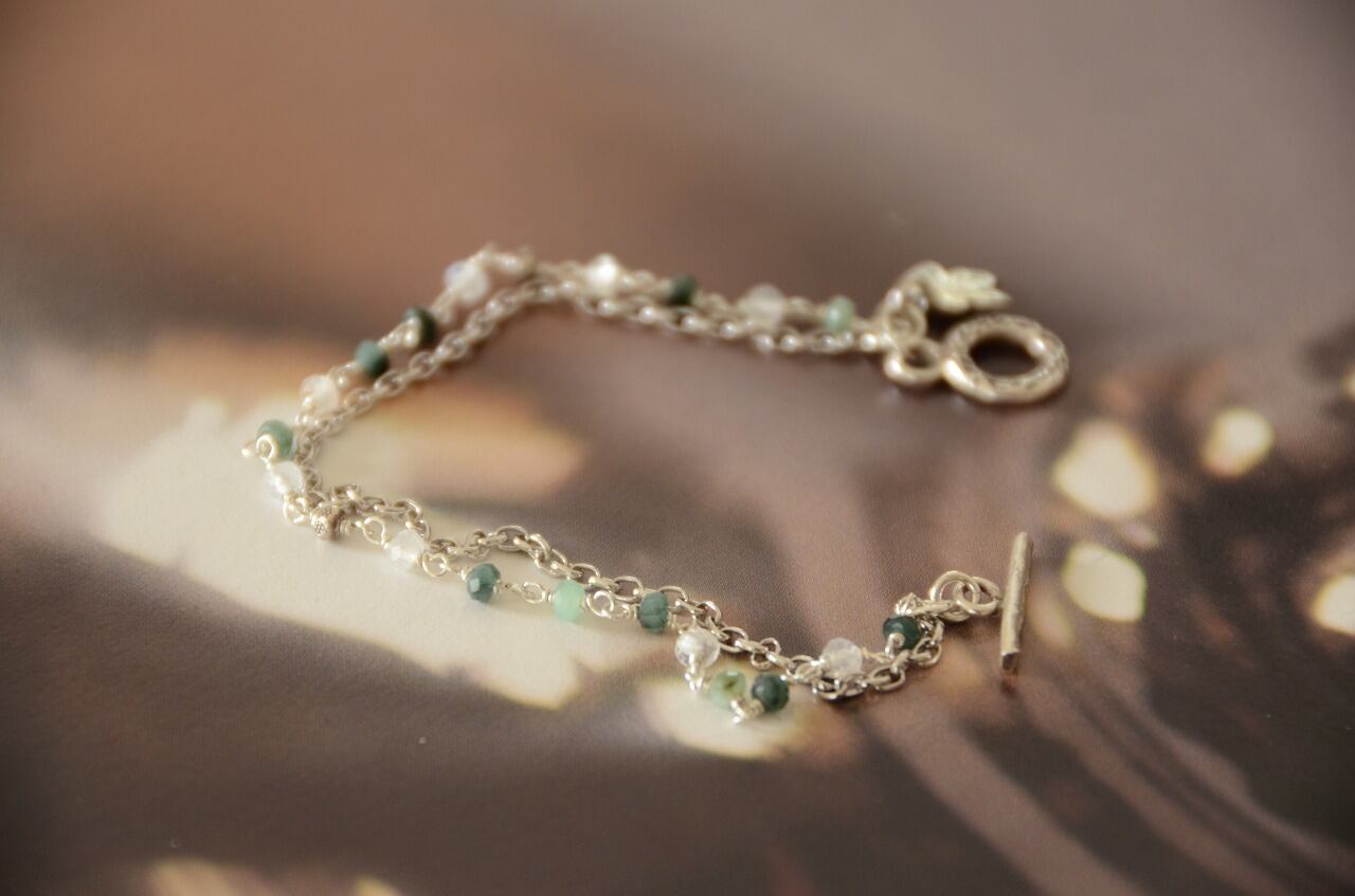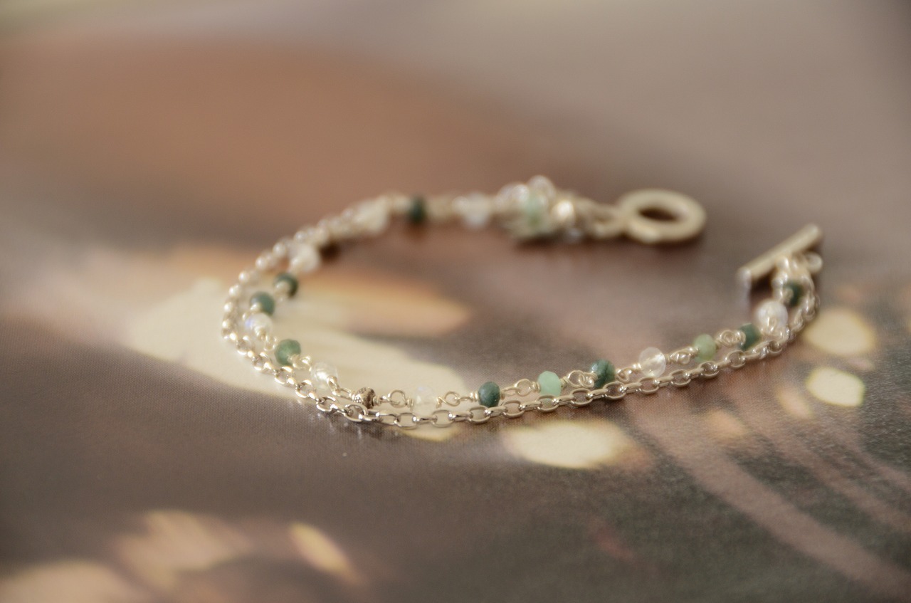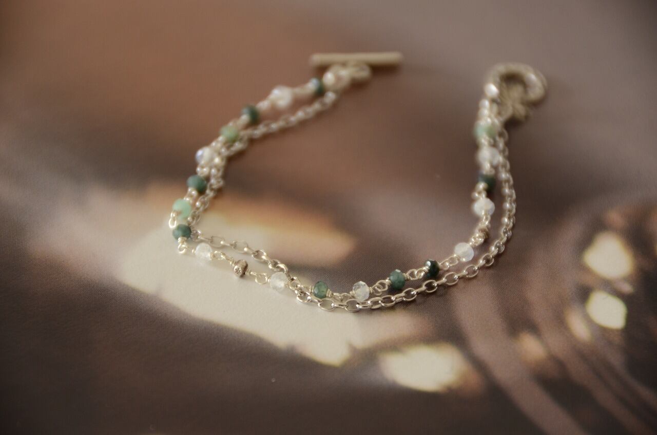5月ということもあり手に取りたくなるのはエメラルド、だけど暖かい日が続くと夏を感じることもしばしばということで明るい雰囲気ですっきりとした色を楽しめるように合わせるのはレインボームーンストーンとシルバーにしてみました。
