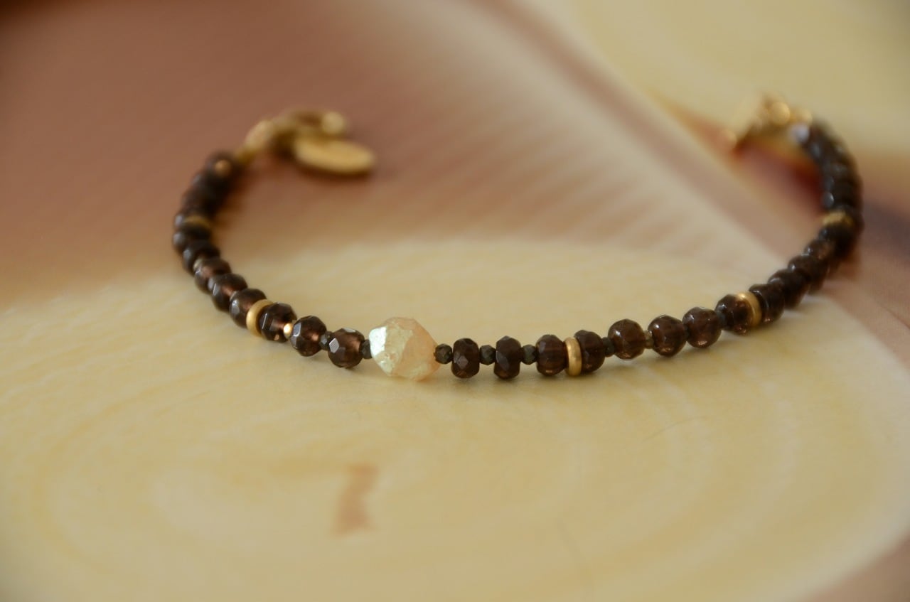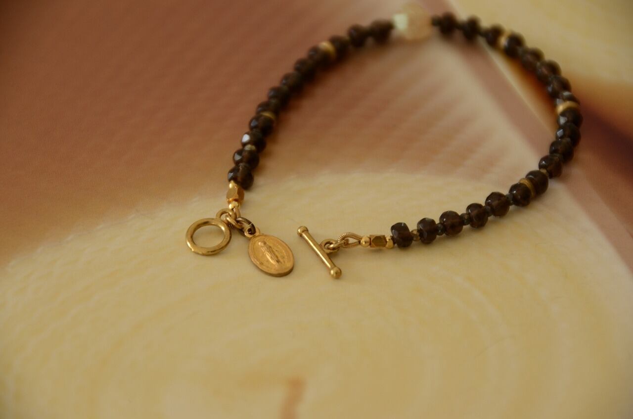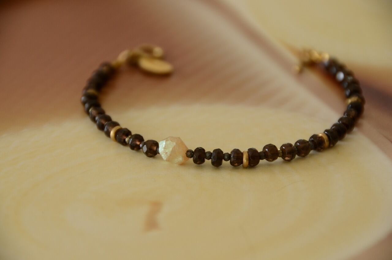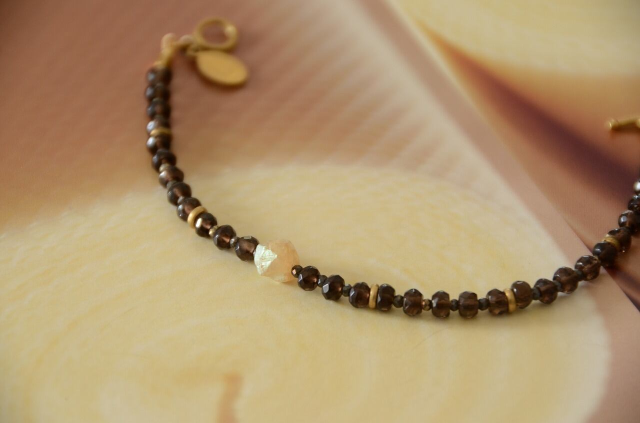 和名で「煙水晶」と呼ばれ、水晶中に含まれた微量のアルミニウムが自然の放射線を受けて茶色に発色したもので、古くから悪霊を追い払うお守り石として古代ローマ時代などでも使われていた天然石です。効力はクリスタルの仲間の中で最も大地と身体のエネルギーを繋げることに適した石で、心身の安定、恐怖や不安の解消、他人の悪想念や霊的、環境的なマイナスエネルギーから守ってくれる役割を持っています。