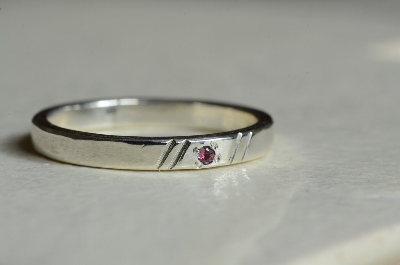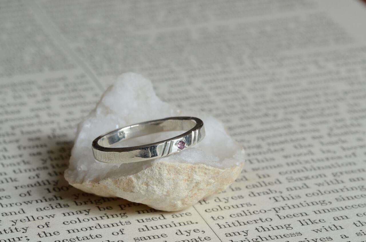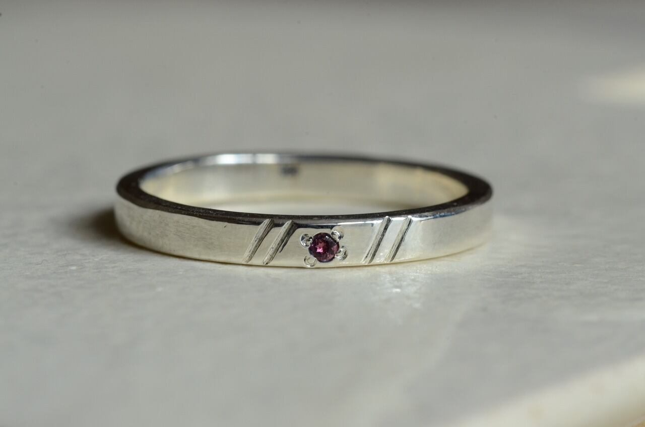 平打ちリングに手作業で線を入れて石を一粒留めてみる