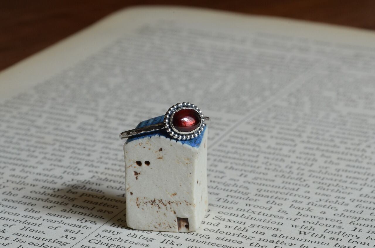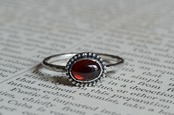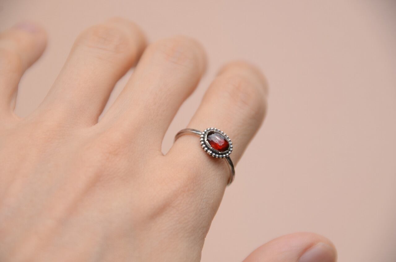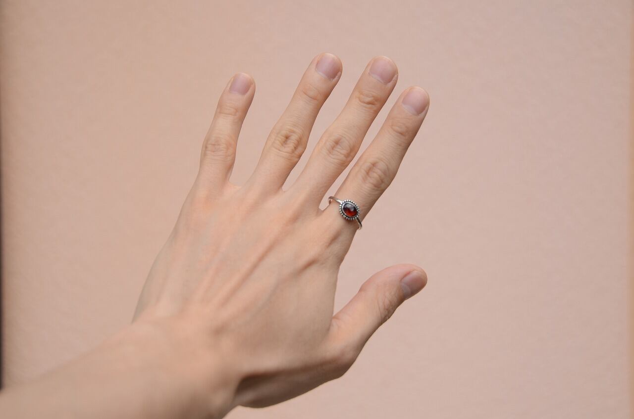 美しい深紅の石に落ち着いた雰囲気の銀色の縁取り