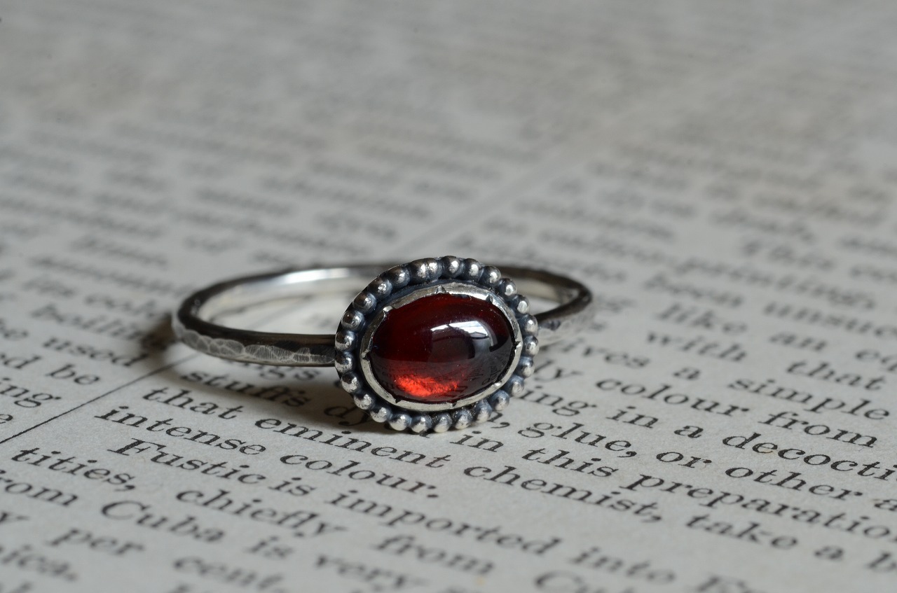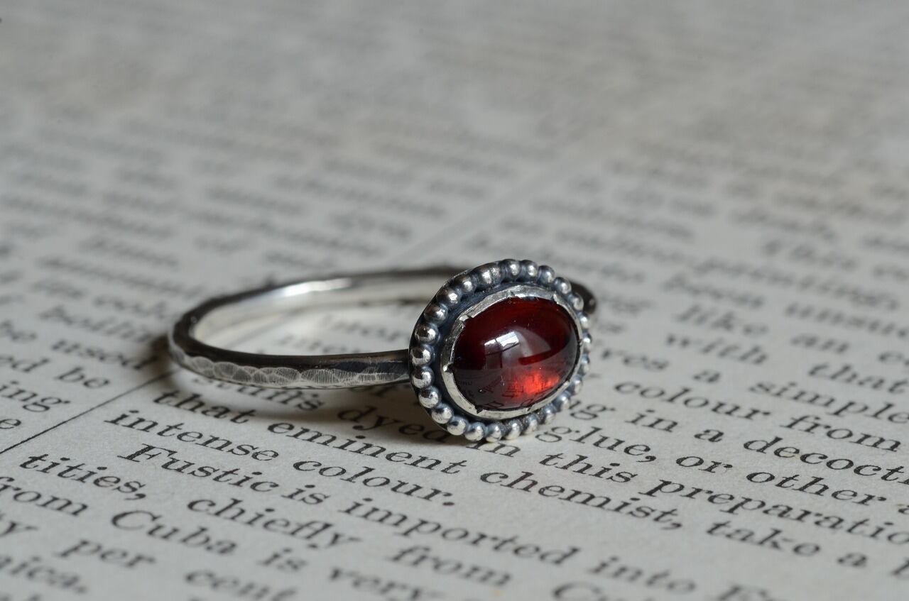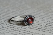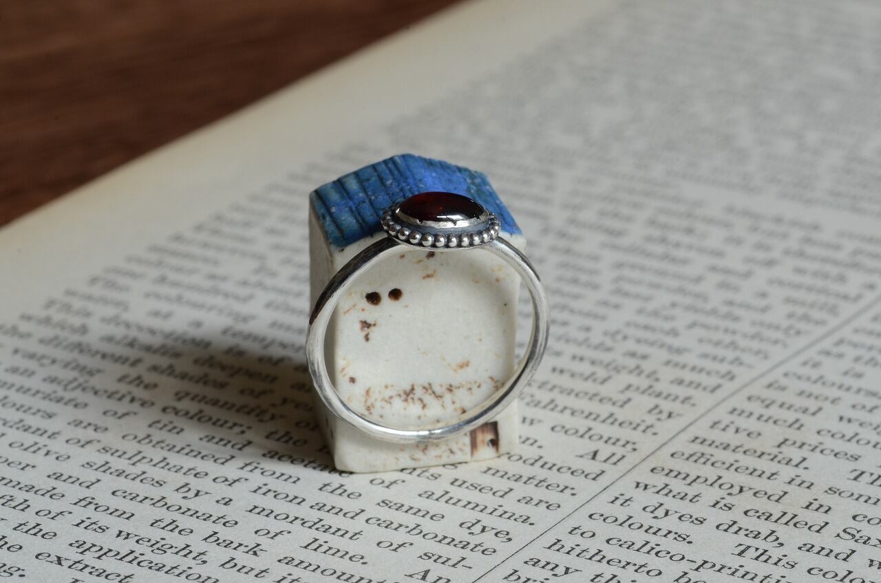 美しい深紅の石に落ち着いた雰囲気の銀色の縁取り