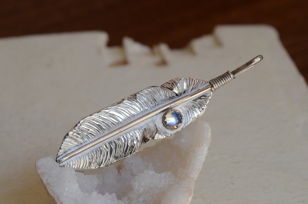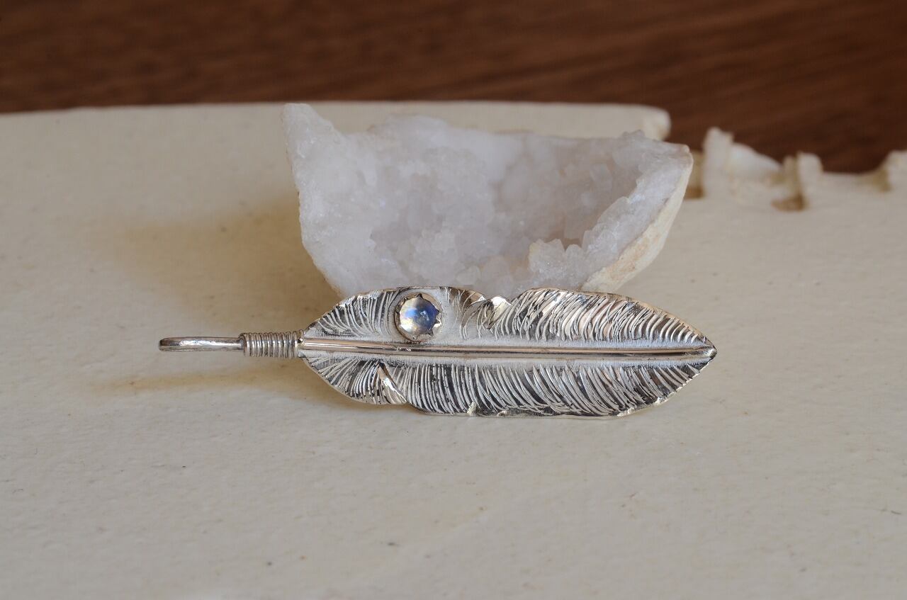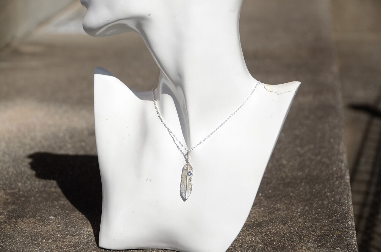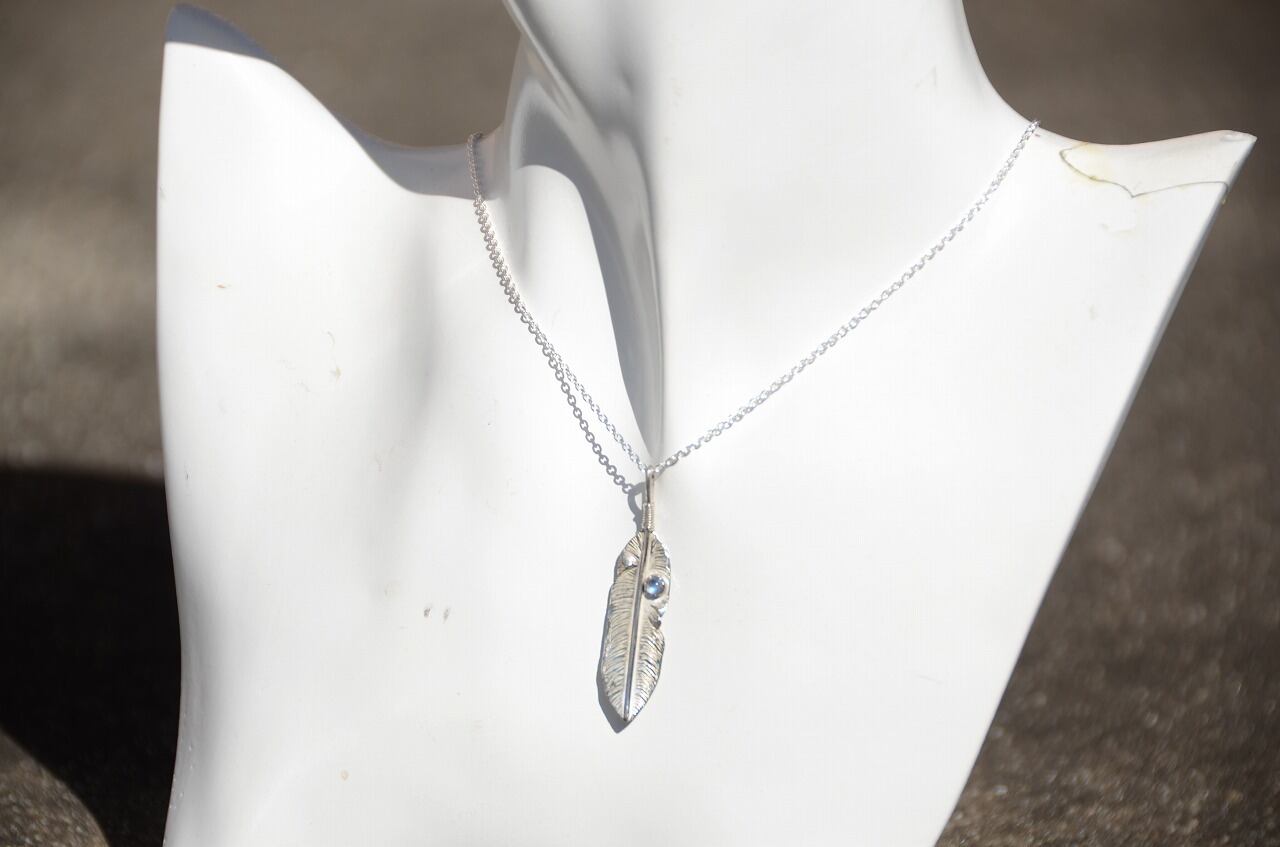 以前に制作を行った『青空と月』見た目はほぼ一緒ですが石をレインボームーンストーンに変えて制作を行いました。さらりとしたデザインのフェザーモチーフそこに一粒石を留めてみました。