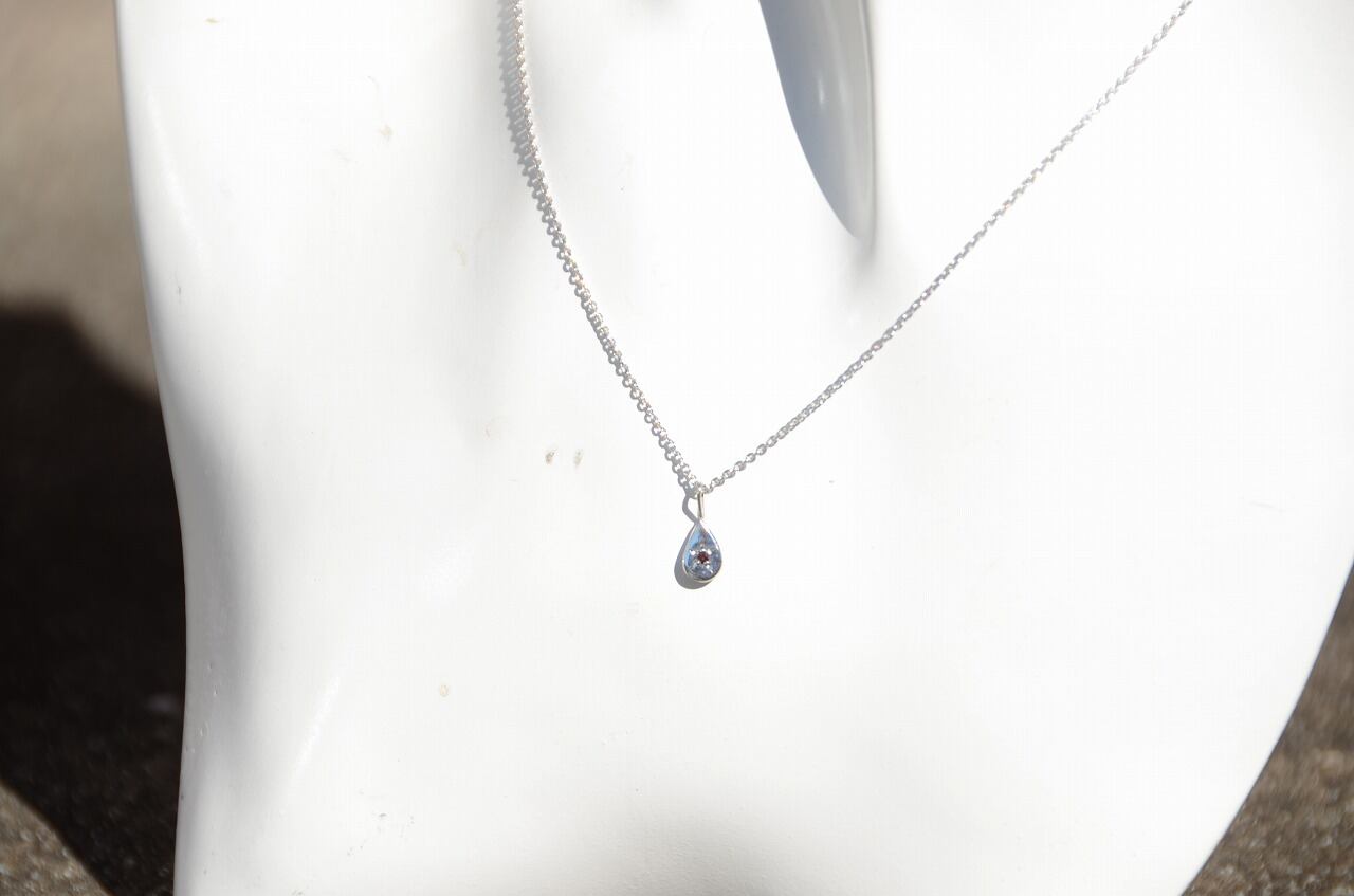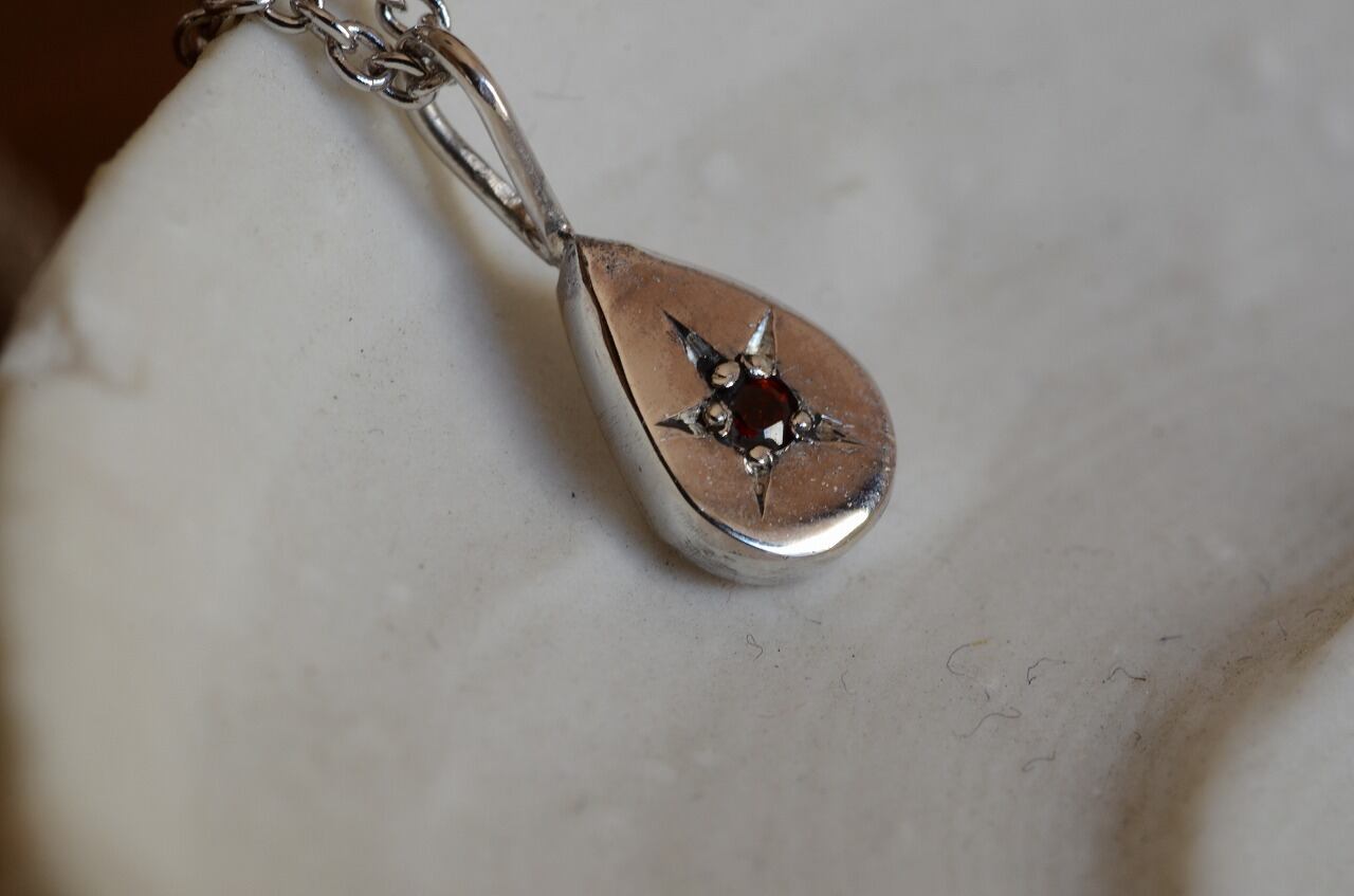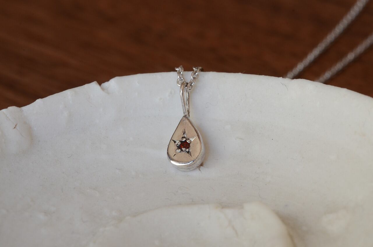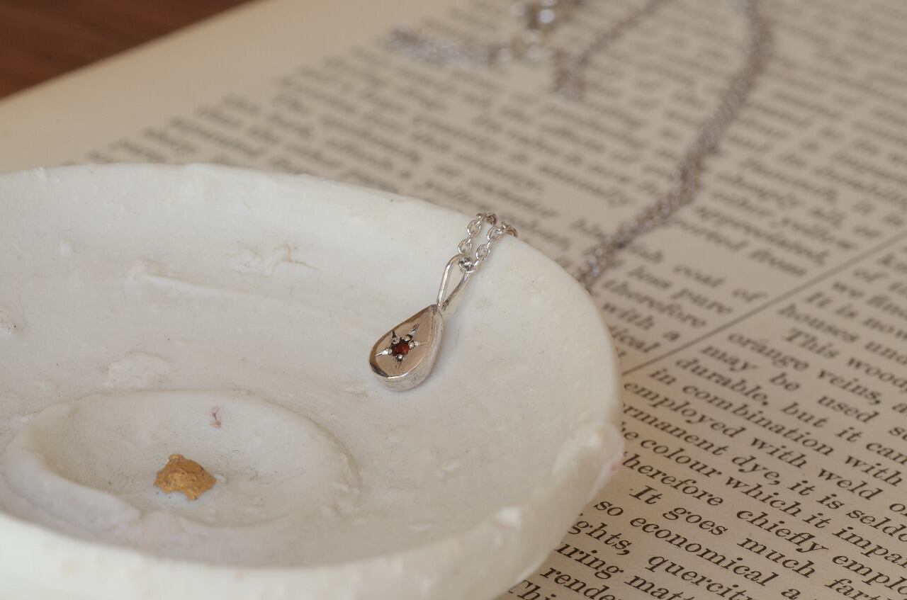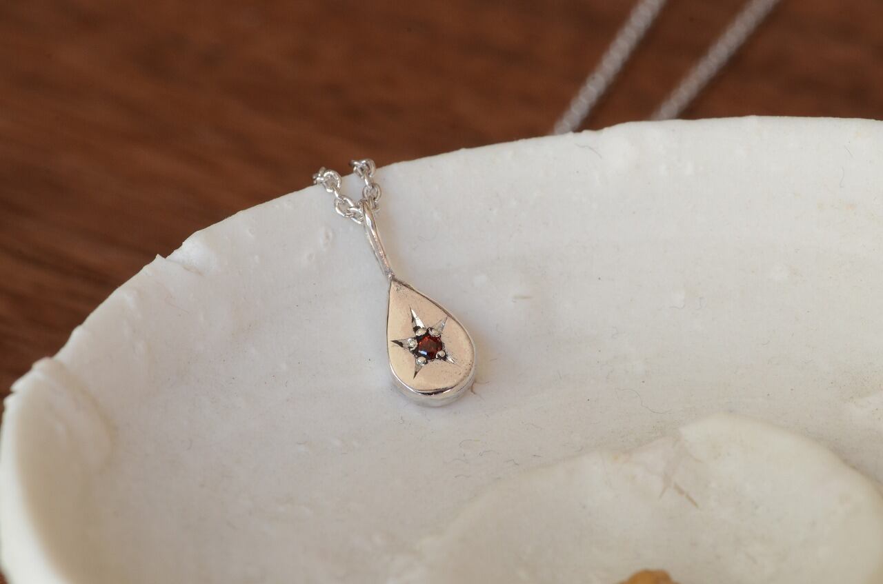 深い赤色のガーネットをシルバーに留めて、留めた感じが星の形になるようにしてみました。