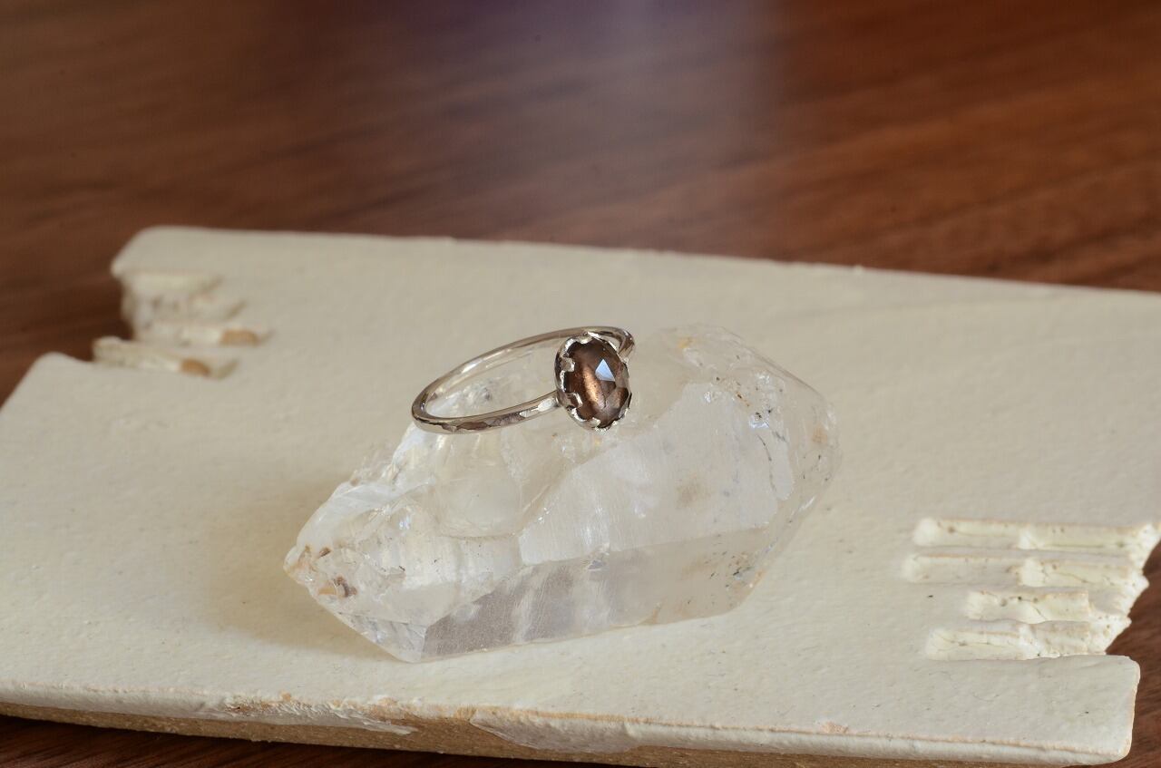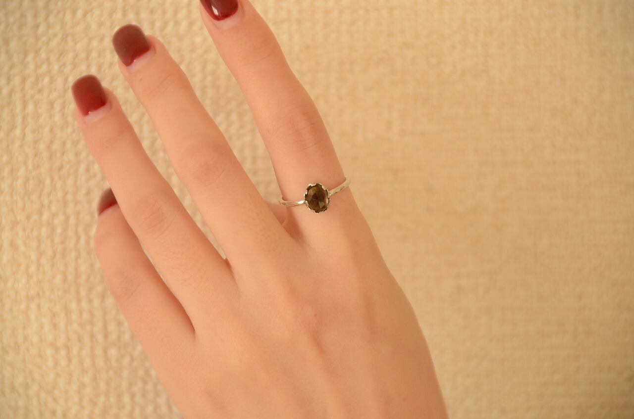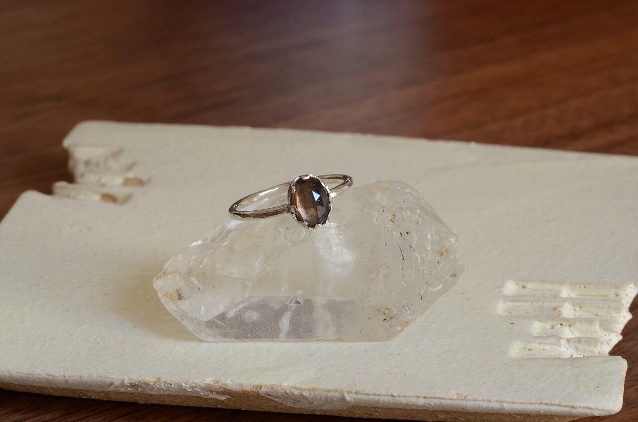 今回はとっても素敵なカットの入ったスモーキークォーツを手に入れることがで来たのでそれを使って制作を行いました。さらりと身につけられる作品でありながら石枠などにも個性を持たせてほんの少しアンティークのような雰囲気を味わえる大人色のリングに仕上げることができたと思っております。