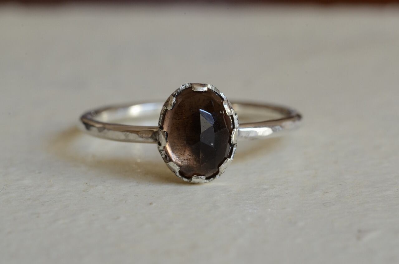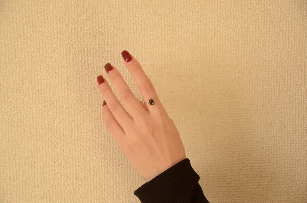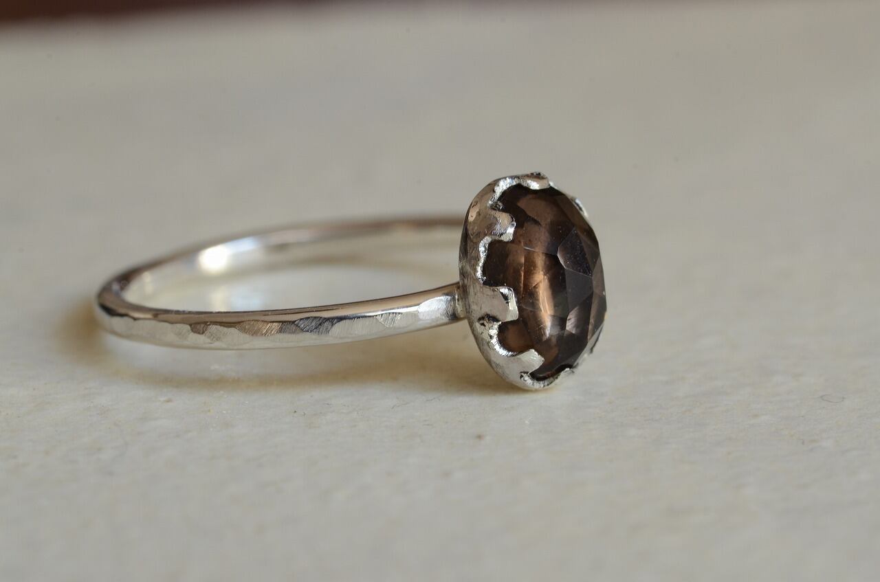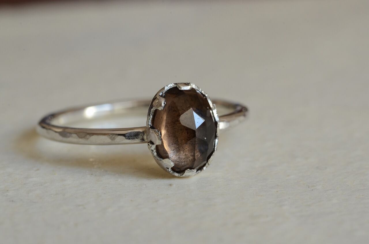 今回はとっても素敵なカットの入ったスモーキークォーツを手に入れることがで来たのでそれを使って制作を行いました。さらりと身につけられる作品でありながら石枠などにも個性を持たせてほんの少しアンティークのような雰囲気を味わえる大人色のリングに仕上げることができたと思っております。