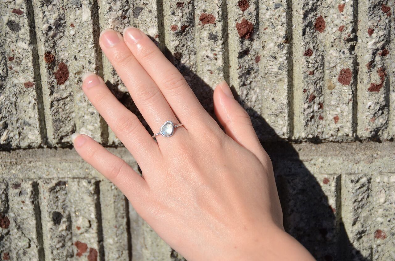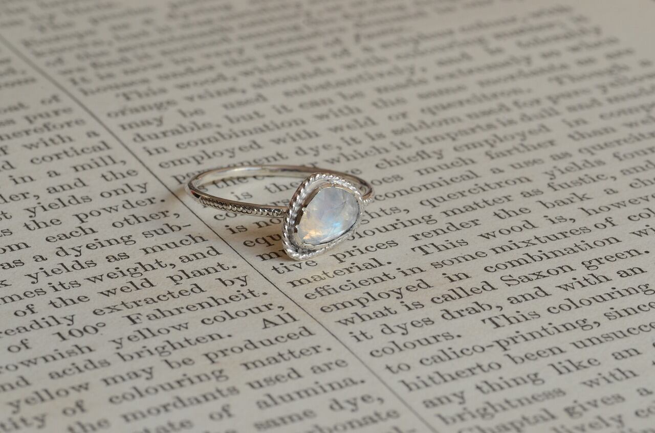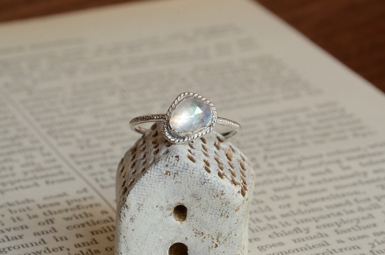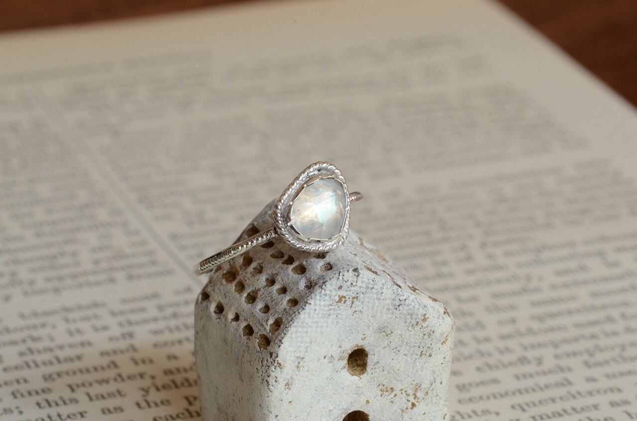 先日から販売を行っている『聖なる物語』シリーズの作品、今回は買い付けに行った先で出会ったとっても素敵なレインボームーンストーンとシルバーの組み合わせのリングです。