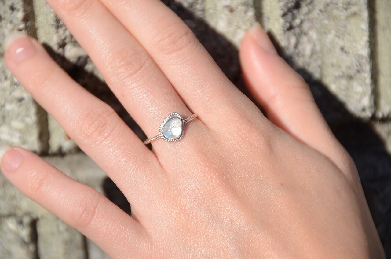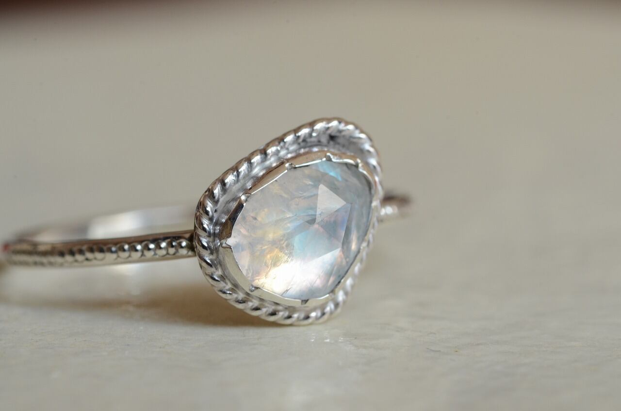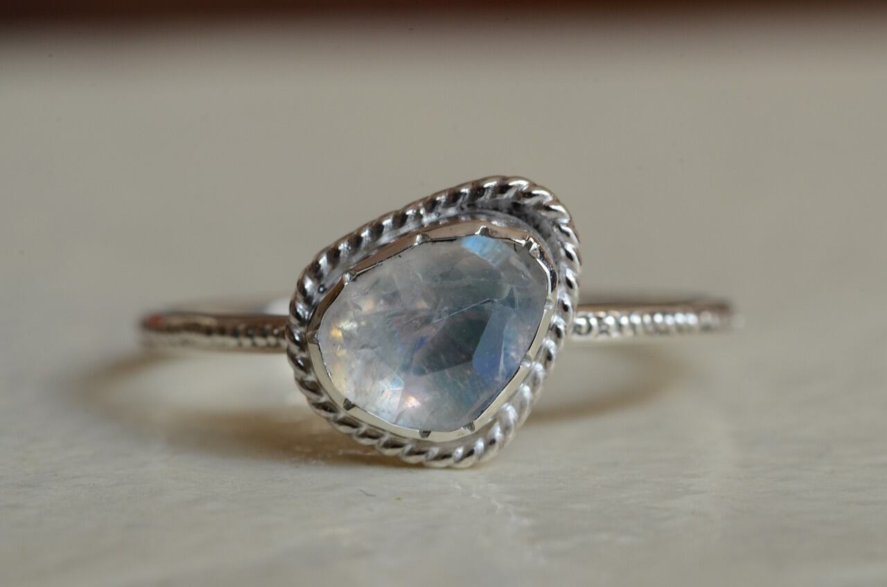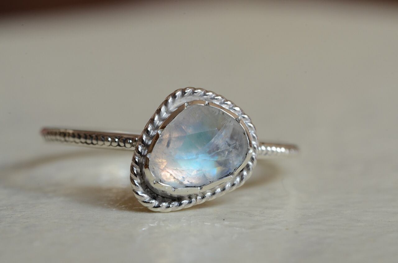 先日から販売を行っている『聖なる物語』シリーズの作品、今回は買い付けに行った先で出会ったとっても素敵なレインボームーンストーンとシルバーの組み合わせのリングです。