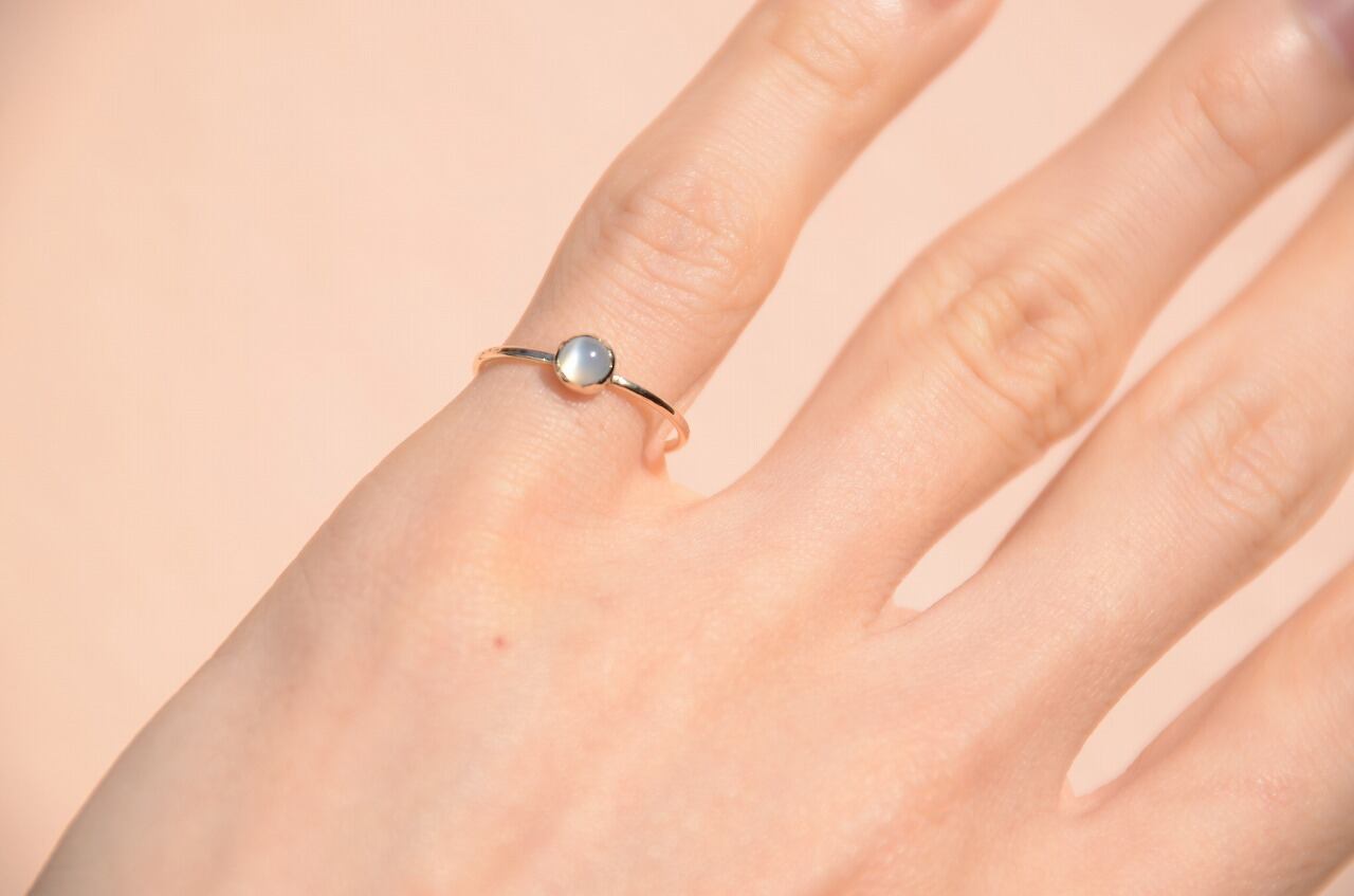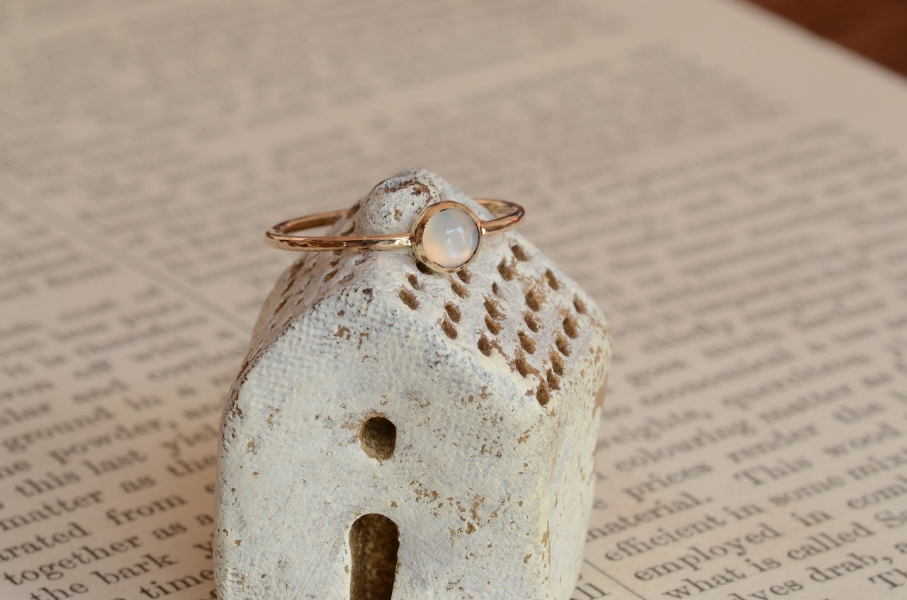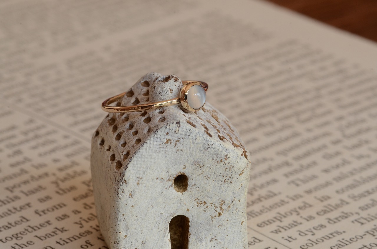 今回はオーソドックスなデザインの作品ということでムーンストーンと10金の組み合わせで制作を行いました、キラキラと優しく輝く10金の輝きとムーンストーンの落ち着きつつも優しい色合いをじっくりと楽しんでもらえら幸いです
