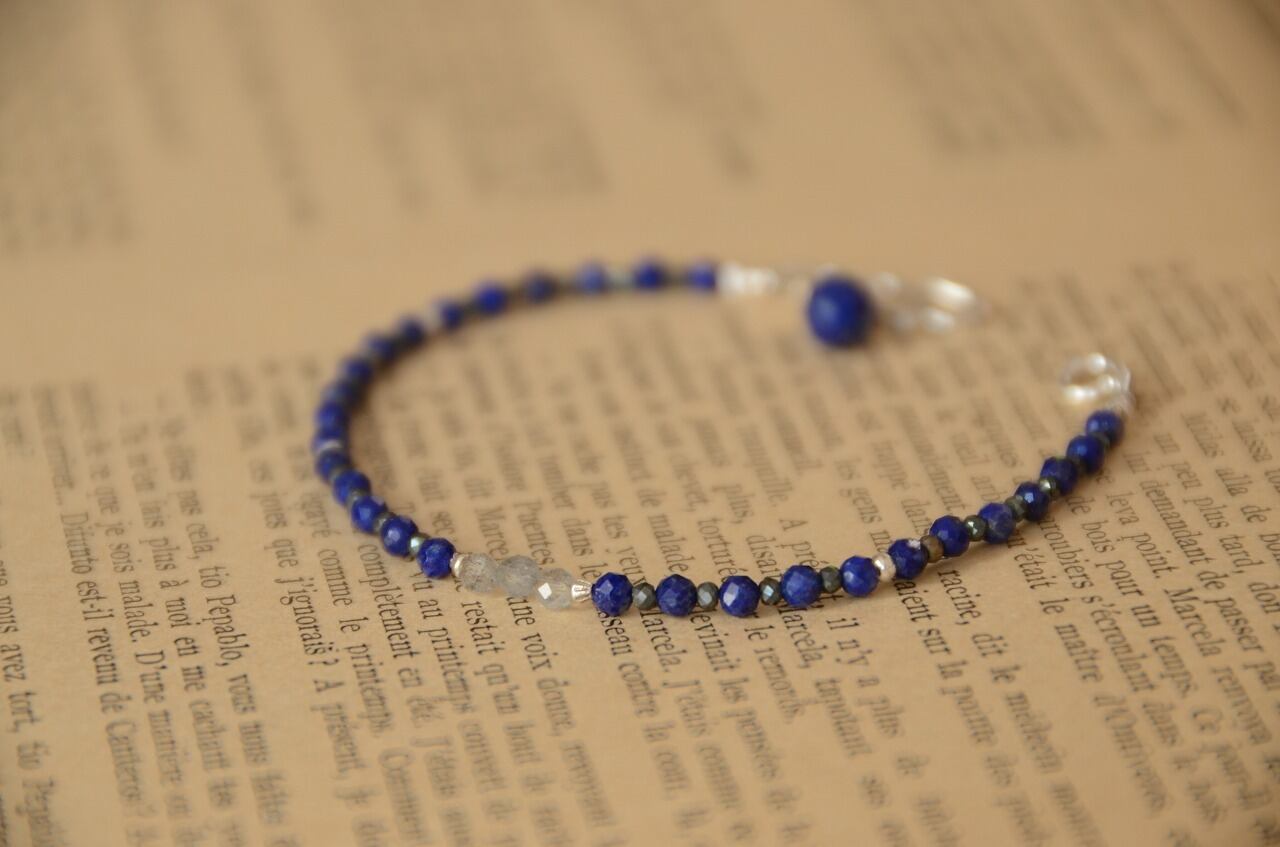空のような青という名前の由来をもつラピスラズリは、アフガニスタンからシルクロードを通り、ヨーロッパや各国に海を越えて伝わった石です。古くから幸運の象徴とされているほか、物事の本質を見抜く力や、人格的な成長を促す効果もある石です。ちなみに日本でいう群青色という色はこのラピスラズリの色を表す色なんです。