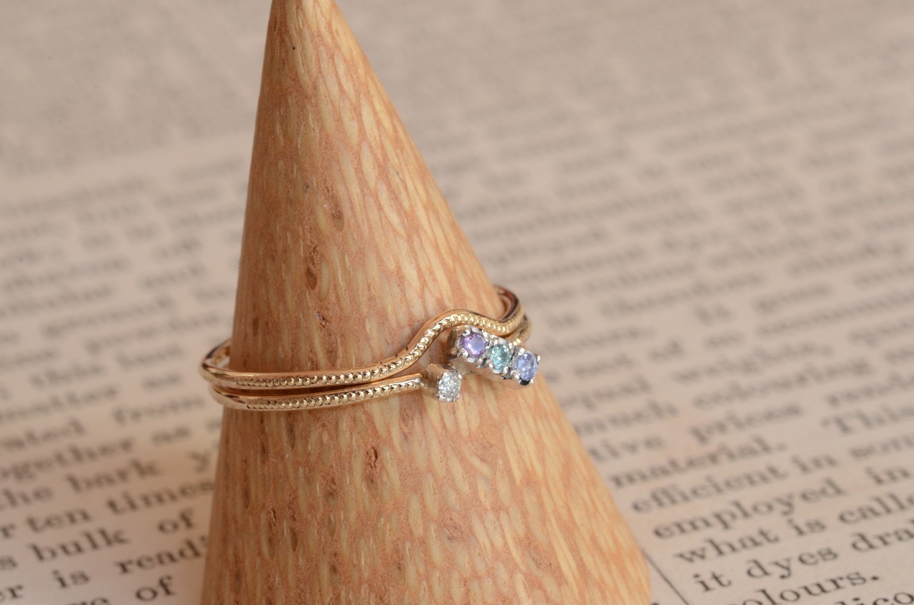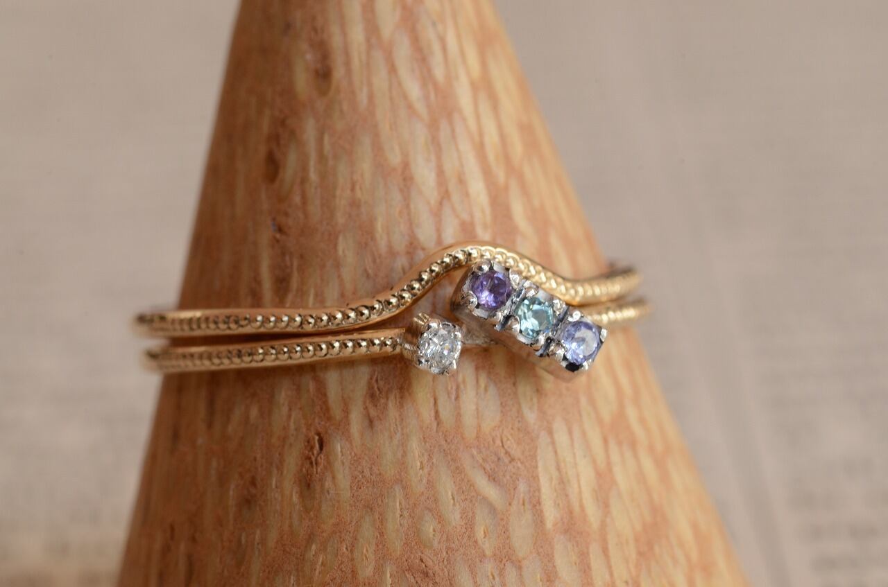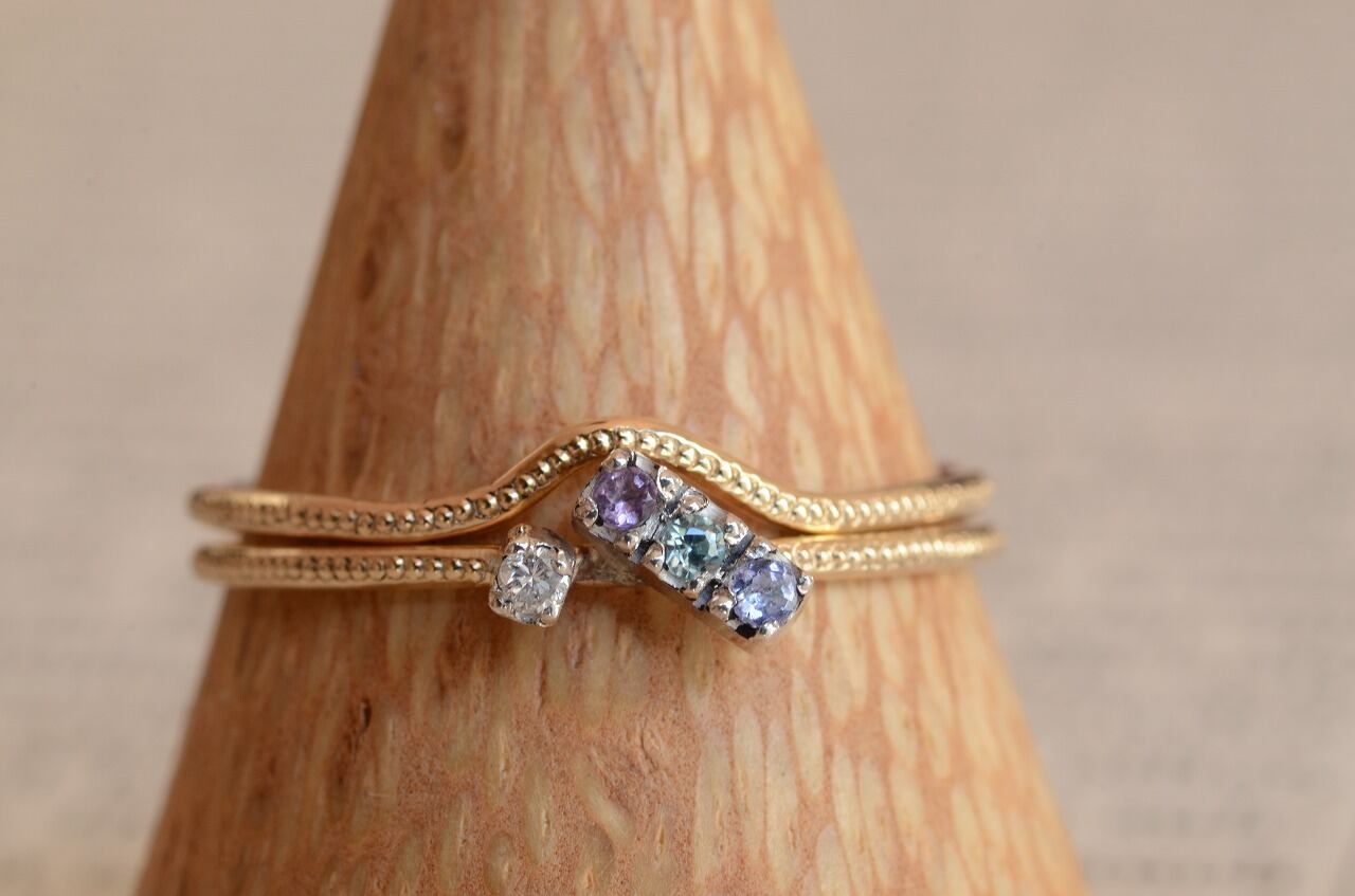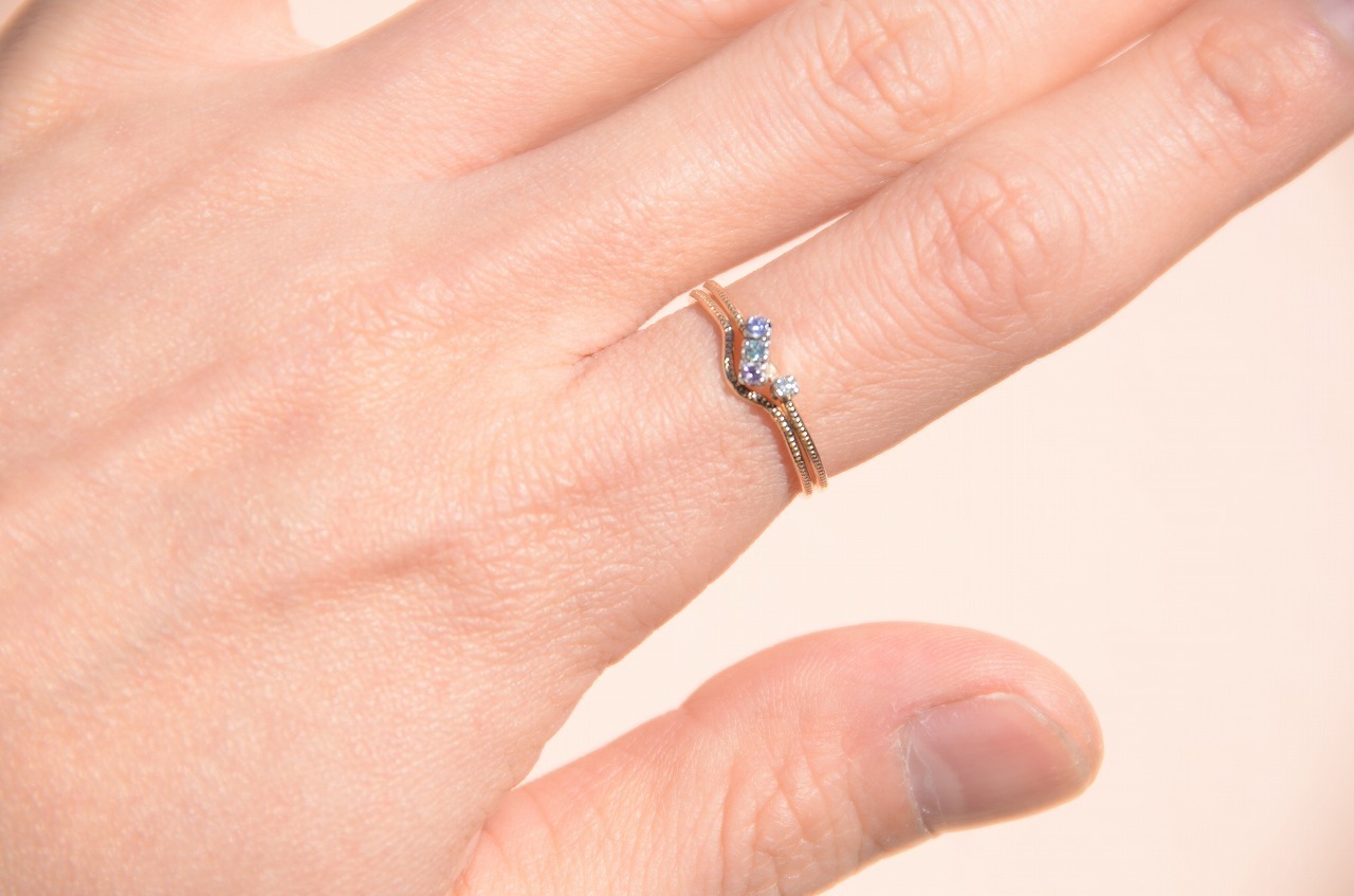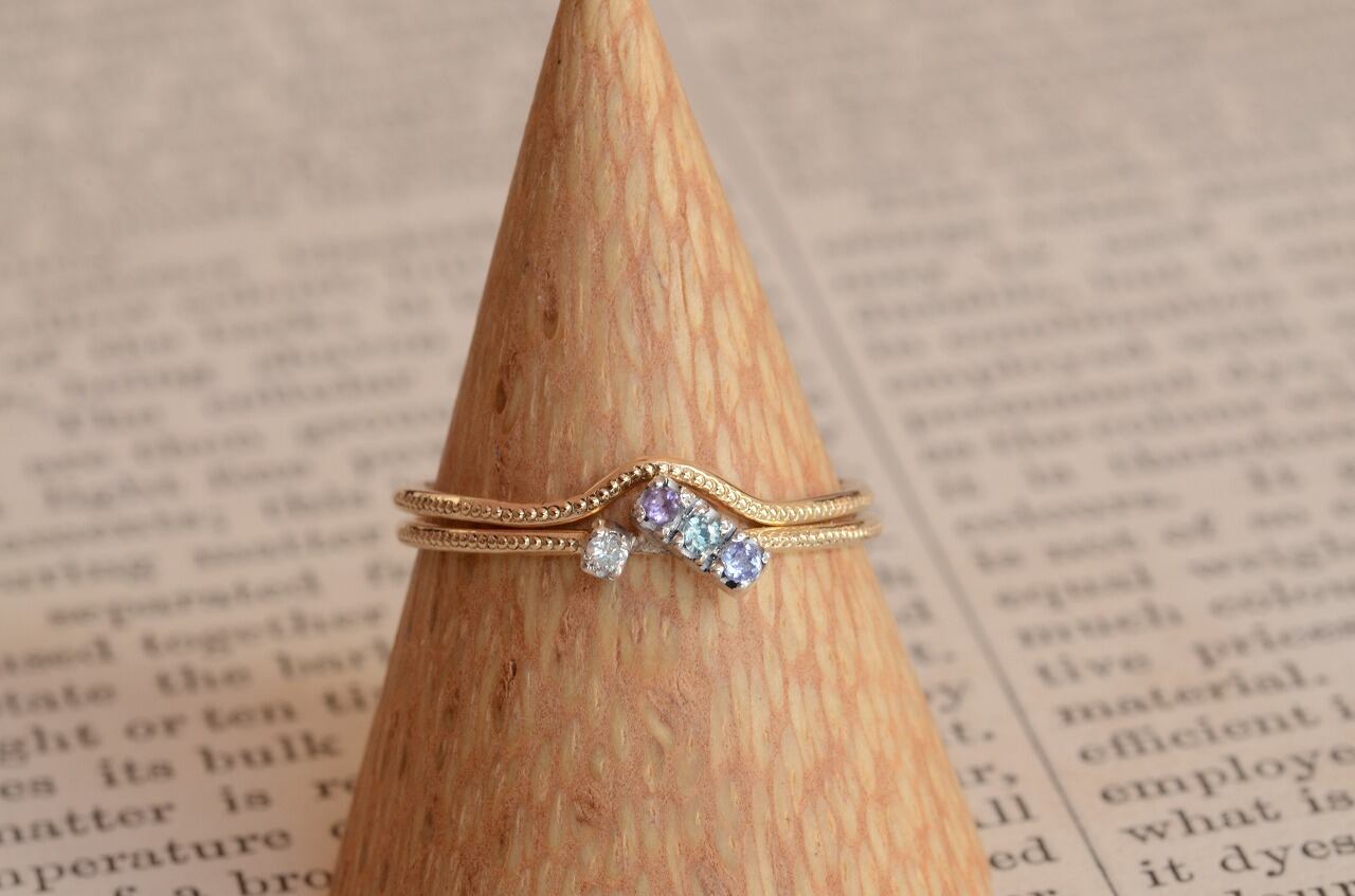 一本は石を3連と一粒留めた一本で、石の留まっているリングに合わせて制作を行ったミル打ちのリングの2本構成となります。