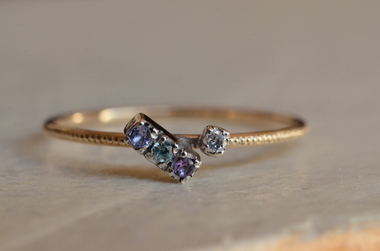 今回はタンザナイト、ブルージルコン、アメジスト、ダイヤモンドの4つの石を使って制作を行いました。