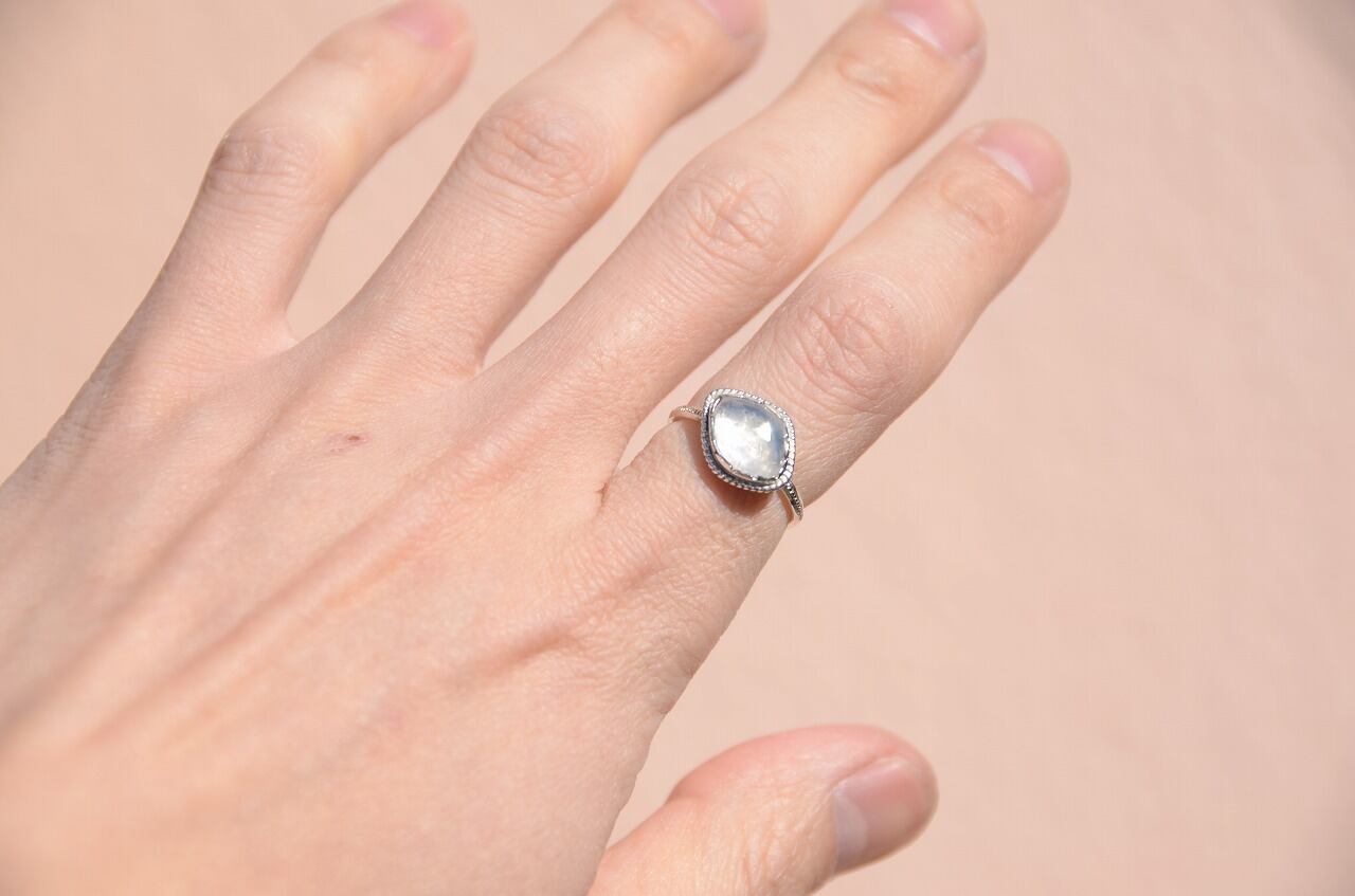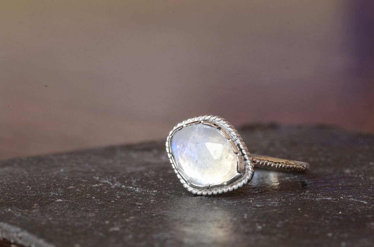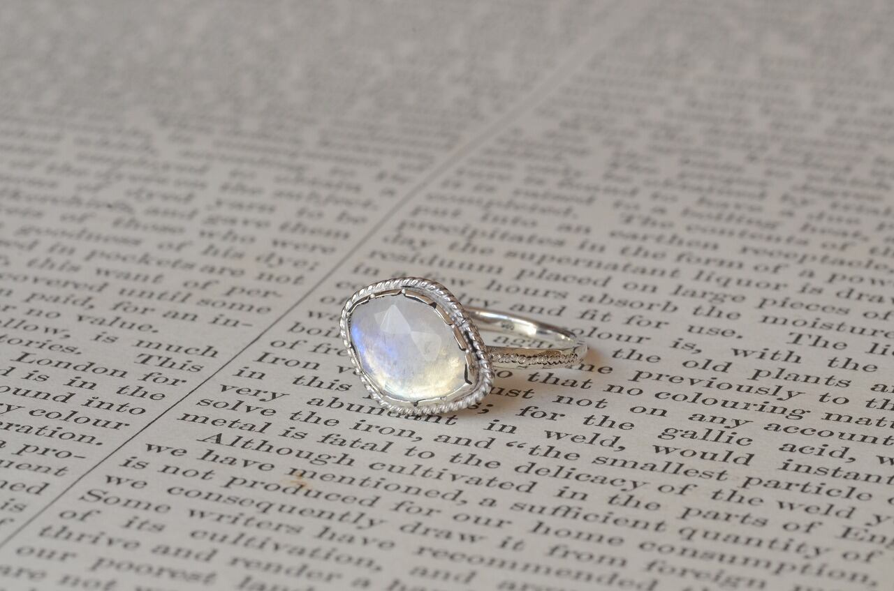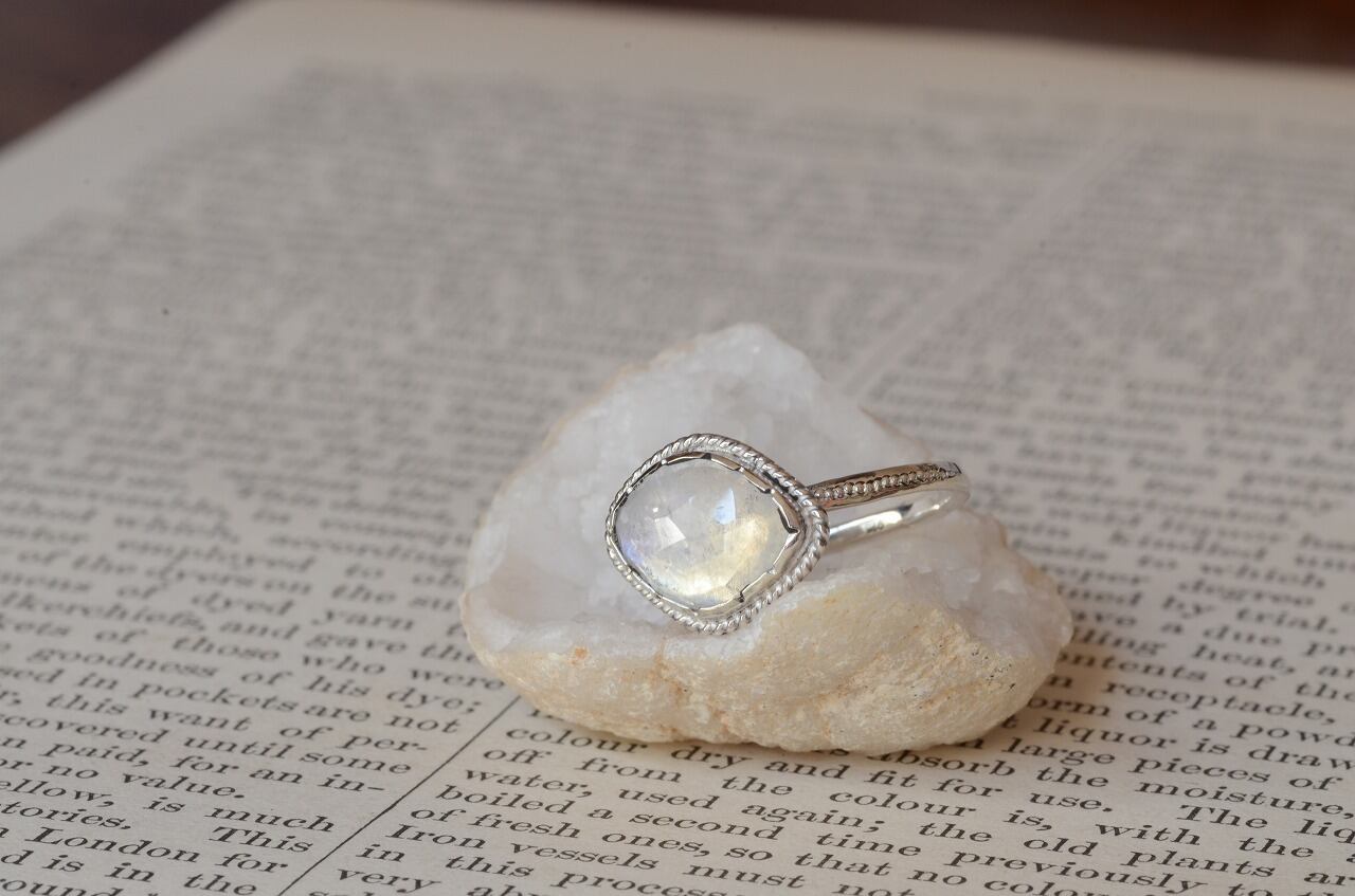 クリスマス時期に限定作品として制作を行った『聖なる物語』をベースにオーダーを頂き今回の制作を行わせてもらいました。美しい一点物のレインボームーンストーンとシルバーの組み合わせ、他にはない質感や表情をじっくりと楽しんでもらえたら幸いです