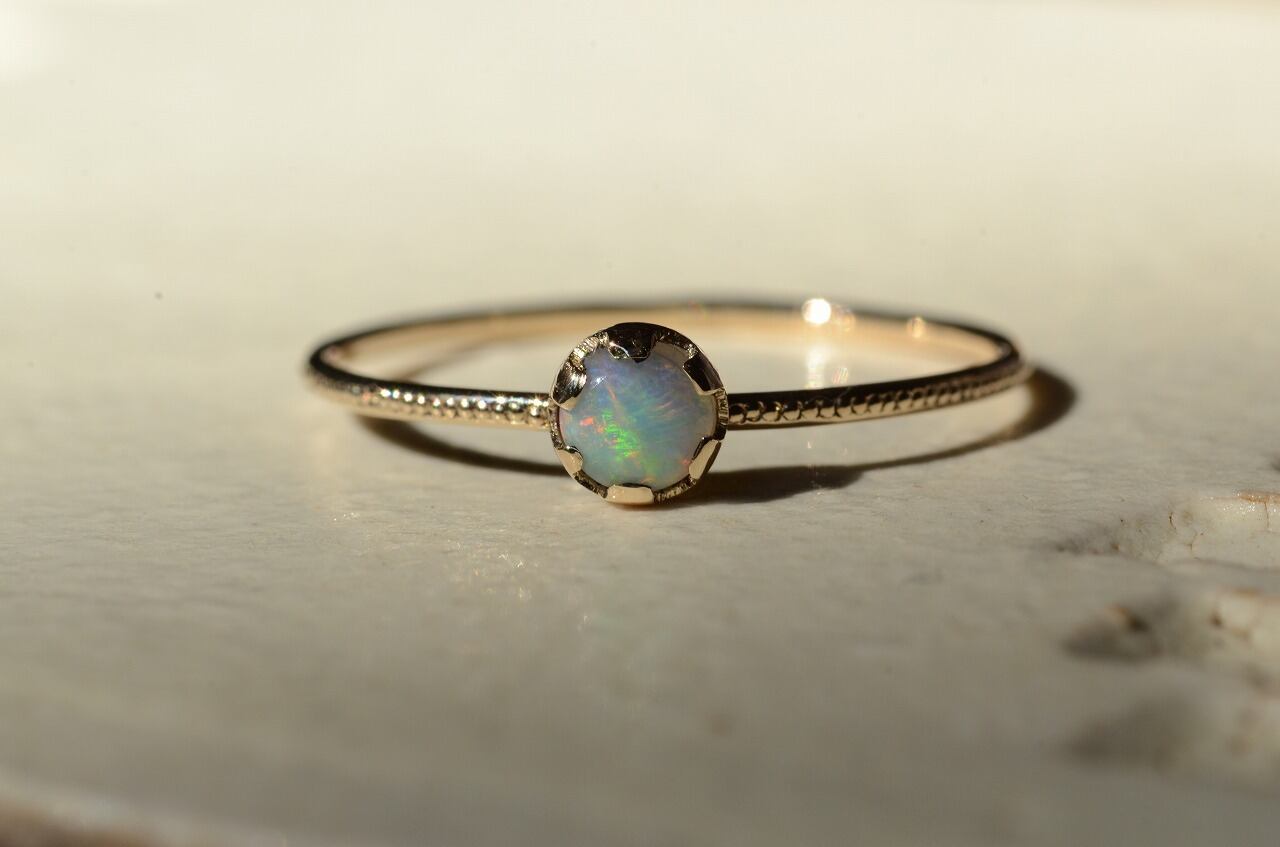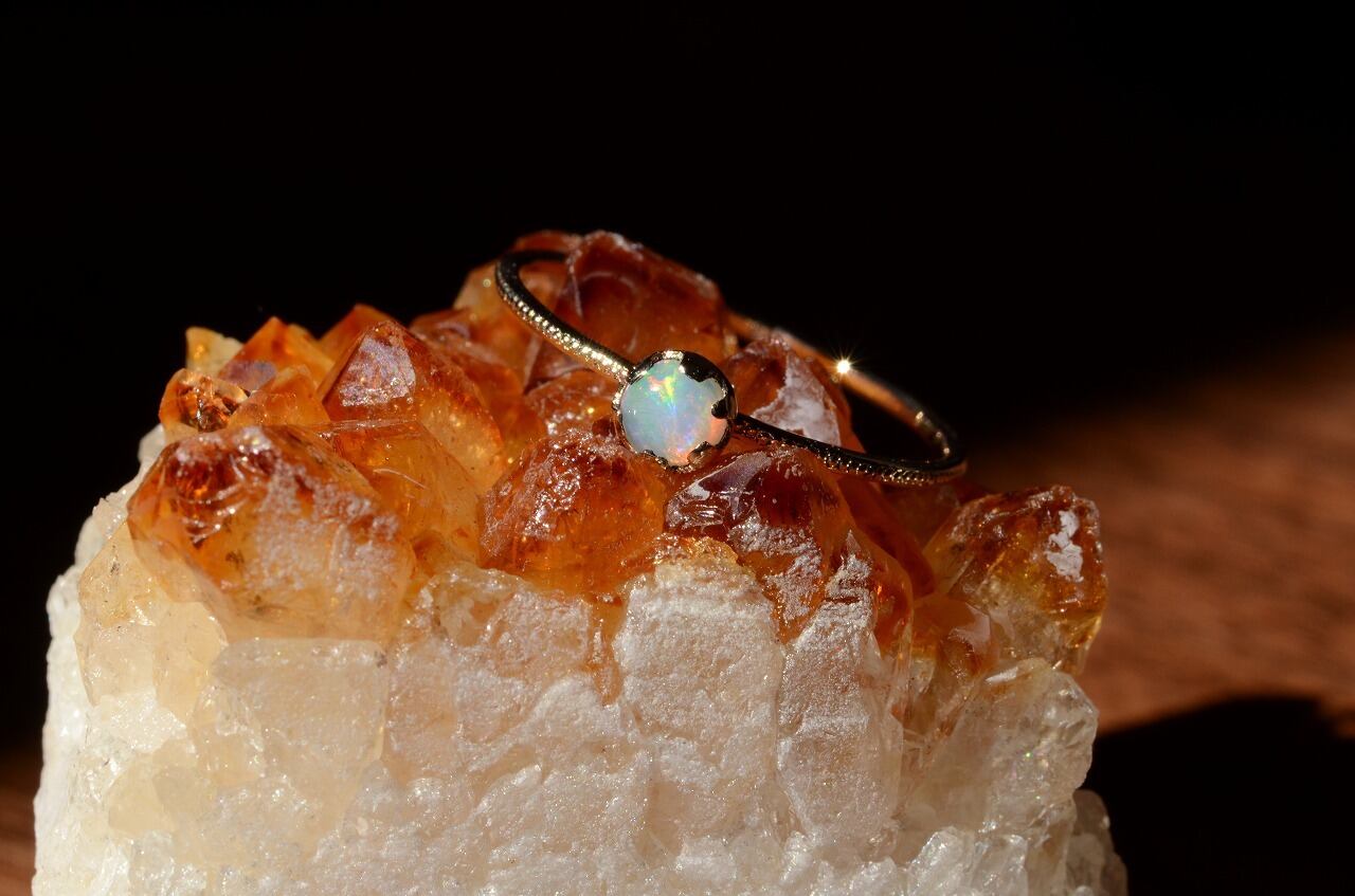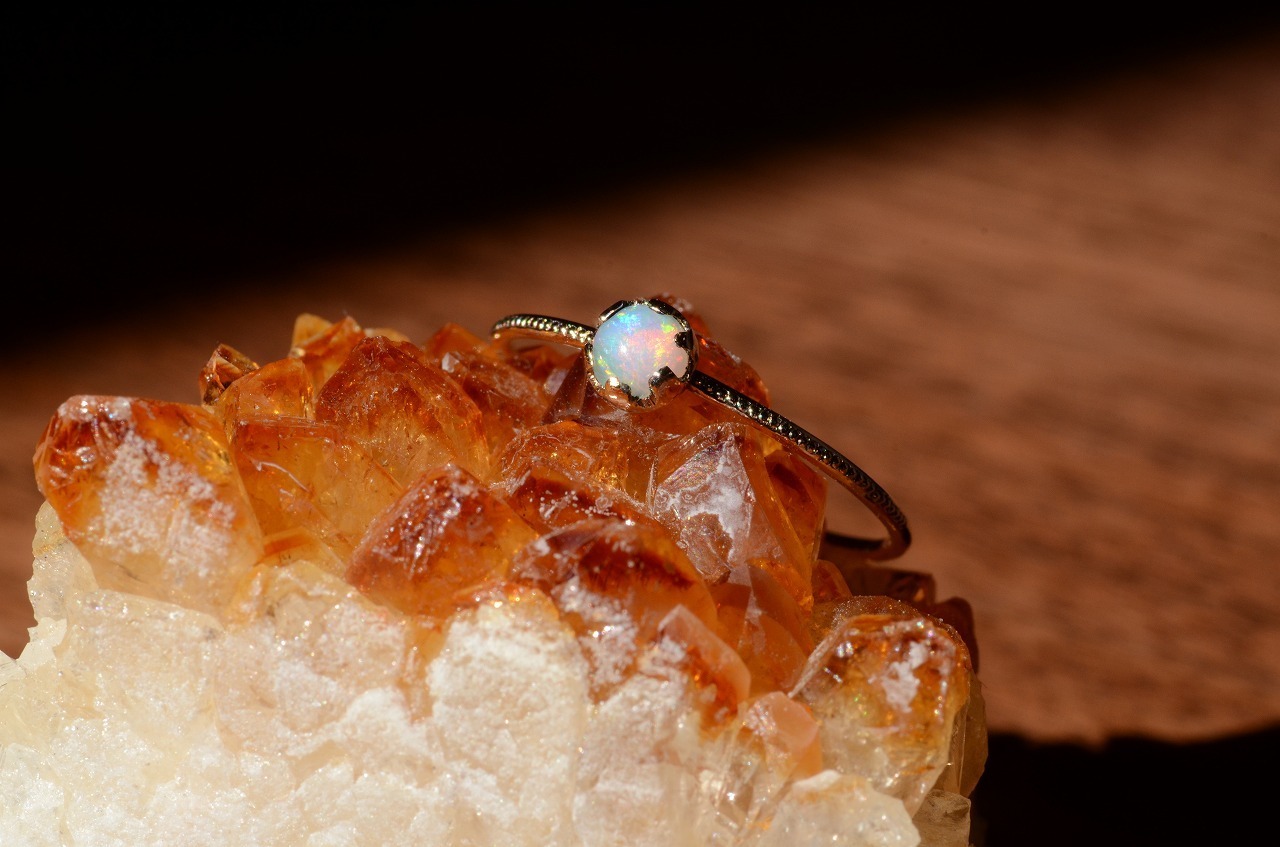 水晶と同じケイ素をメインとする鉱物でその成り立ちから水分が多く高度の柔らかい石です。見る角度によって虹色に輝く遊色効果のあるものをプレシャスオパール、きらめかないものをコモンオパールと呼んでいます。数ある石の中でもとくに明るいエネルギーを持つ石といわれ、自由なエネルギーを象徴し、想像力を高め、内面の隠れた才能を引き出す効果もあるようです。直射日光に弱いので取扱いに少しだけ注意が必要です。