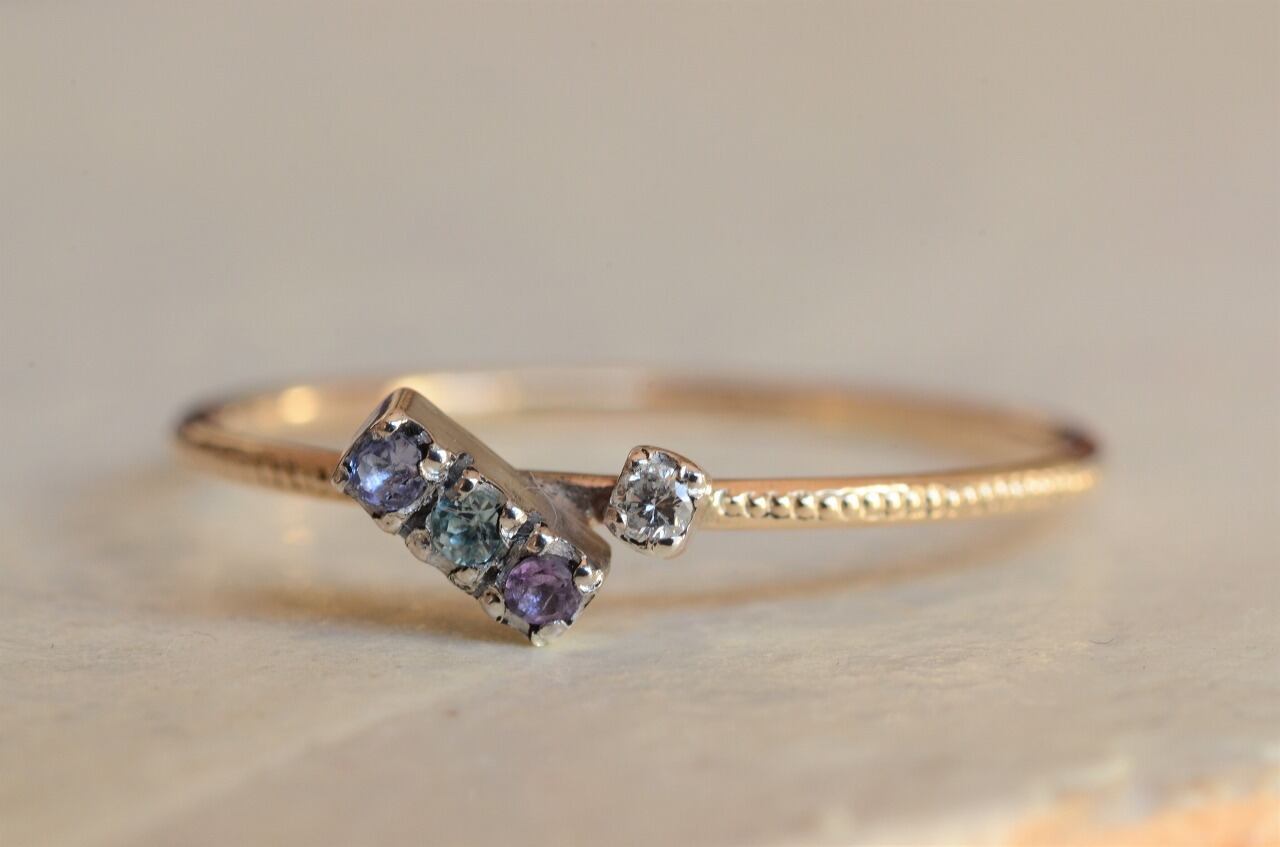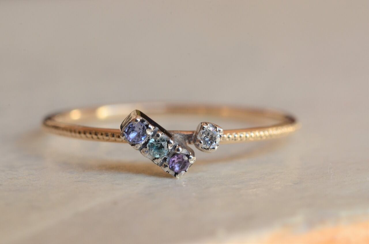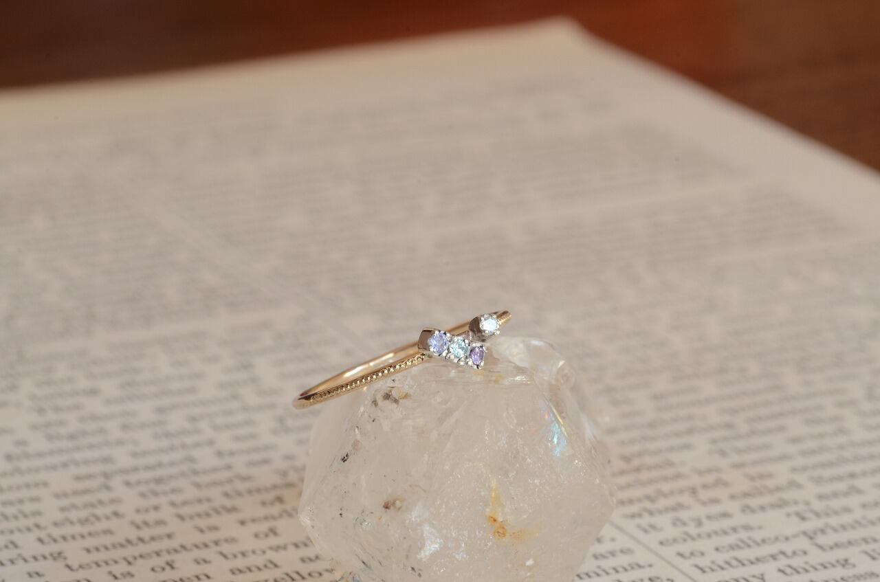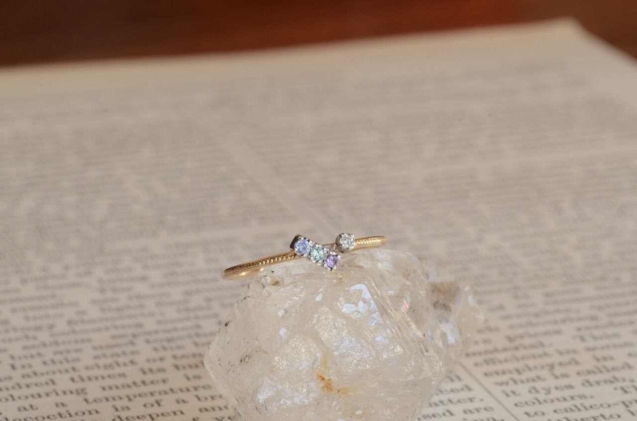 タンザナイト、ブルージルコン、アメジスト、ダイヤモンドの4つの石を使って制作を行いました。