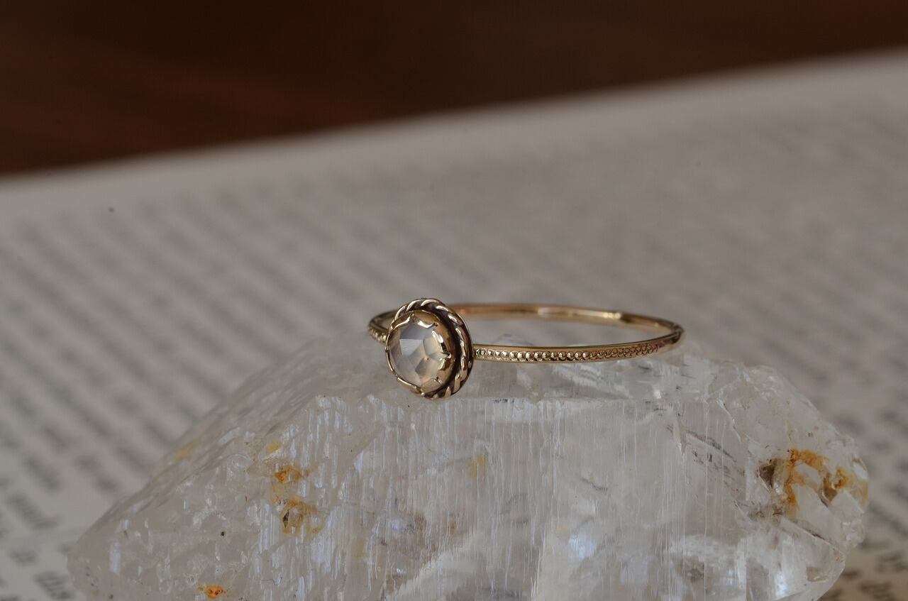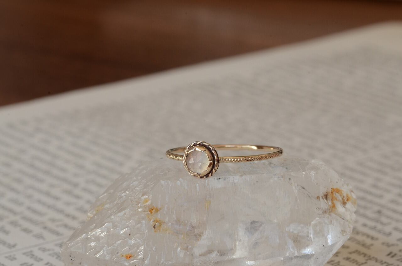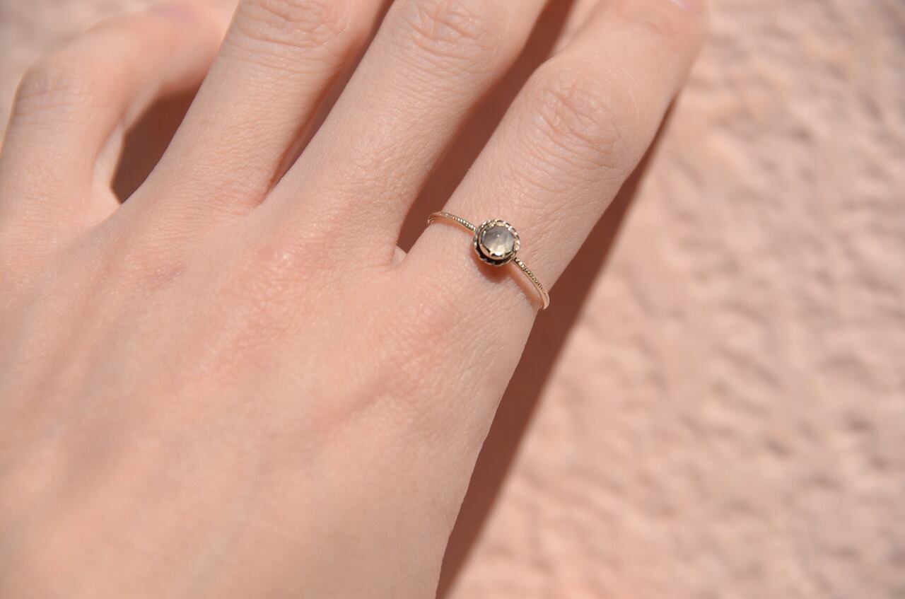 今回はムーンストーンとK10の組み合わせで制作を行いました、ローズカットの美しくも優しい色のムーンストーンの組み合わせが本当に素敵な作品だと思っております。