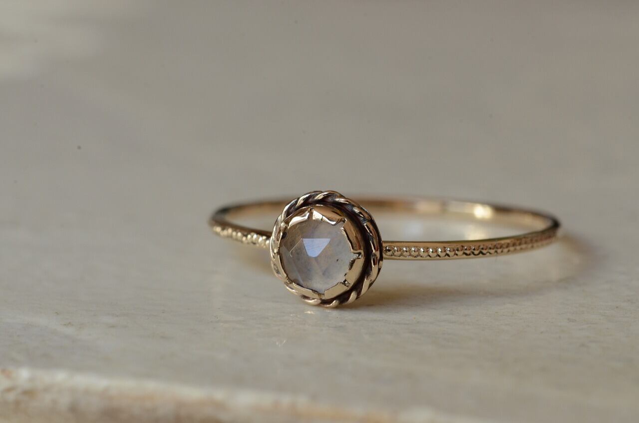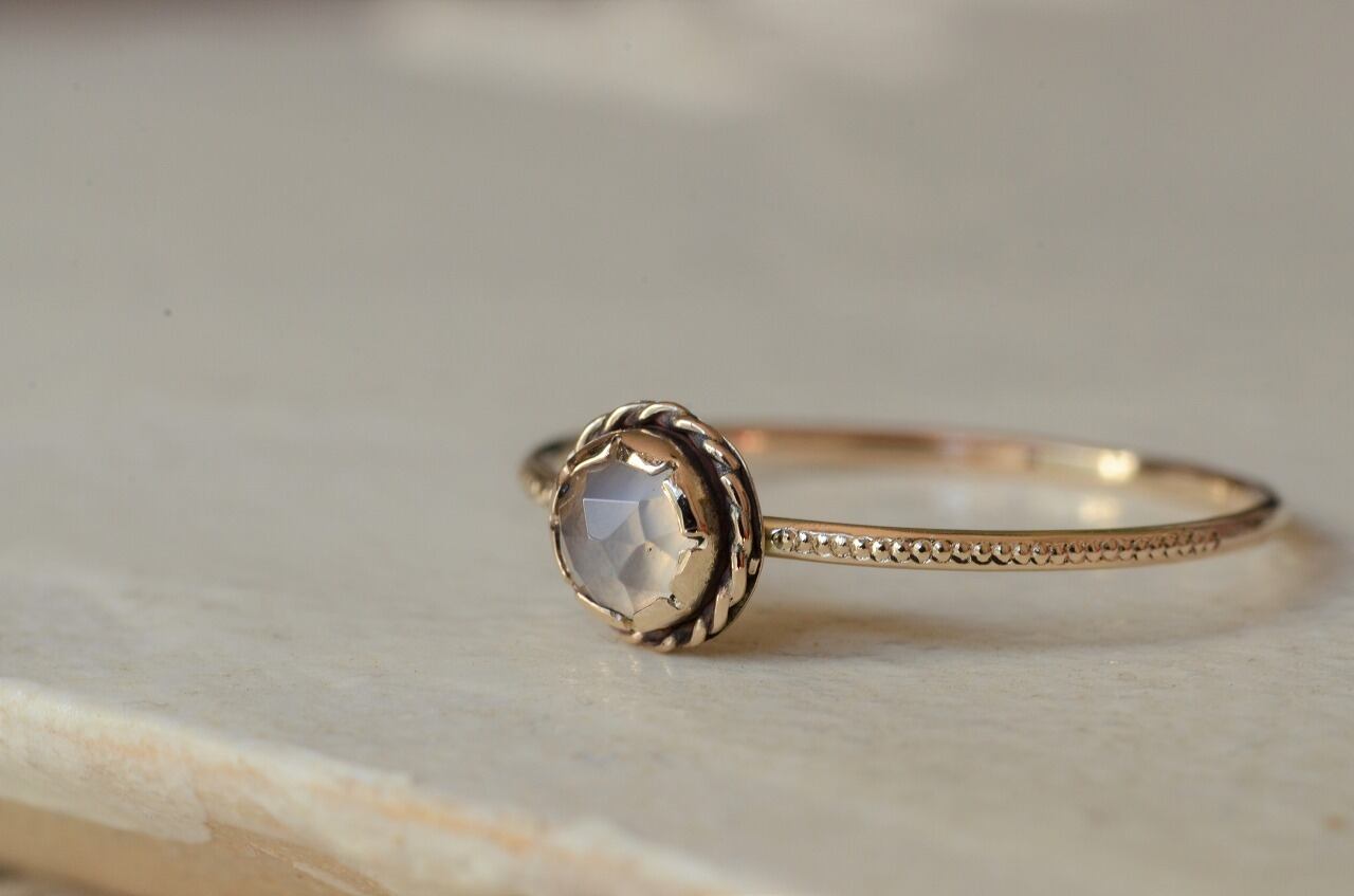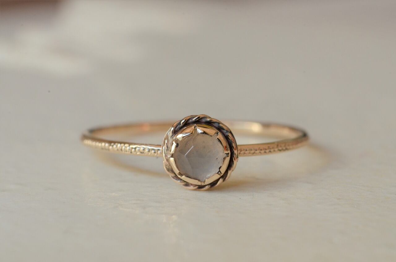 今回はムーンストーンとK10の組み合わせで制作を行いました、ローズカットの美しくも優しい色のムーンストーンの組み合わせが本当に素敵な作品だと思っております。