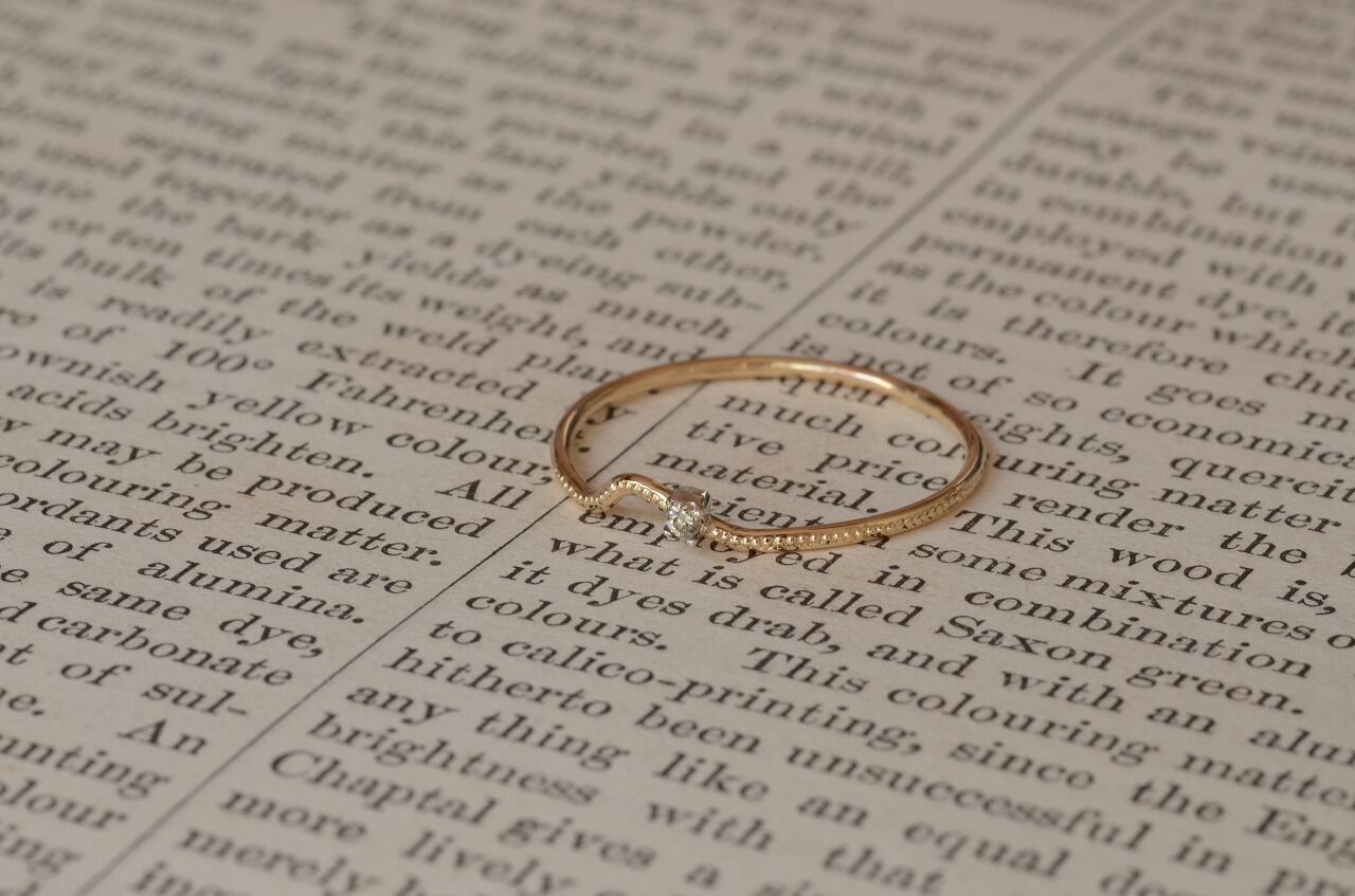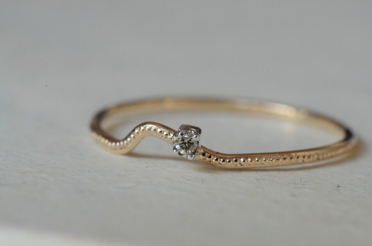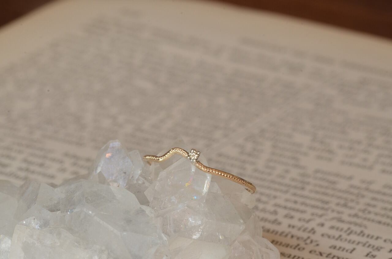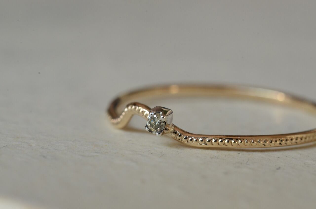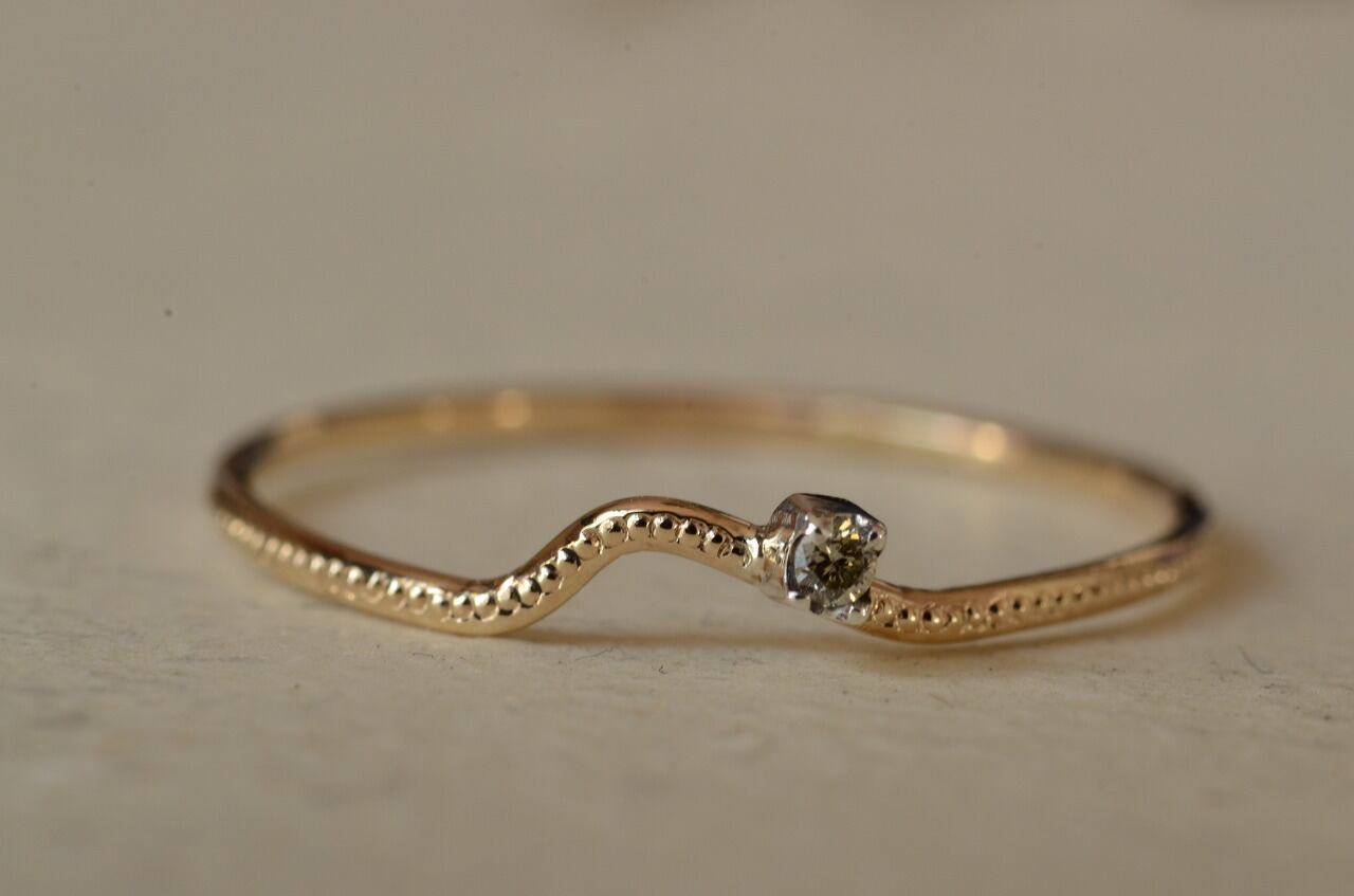 曲げたリングにミルを打って、シルバーの石枠に一粒ブラウンダイヤモンドをセットしてみました。重ね着けにもいいですが単独でも身につけられる大人のためのシンプルジュエリーです。