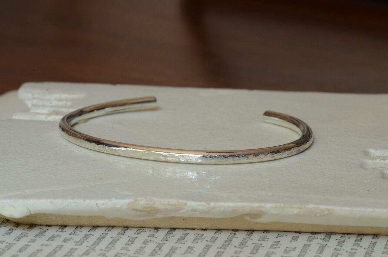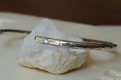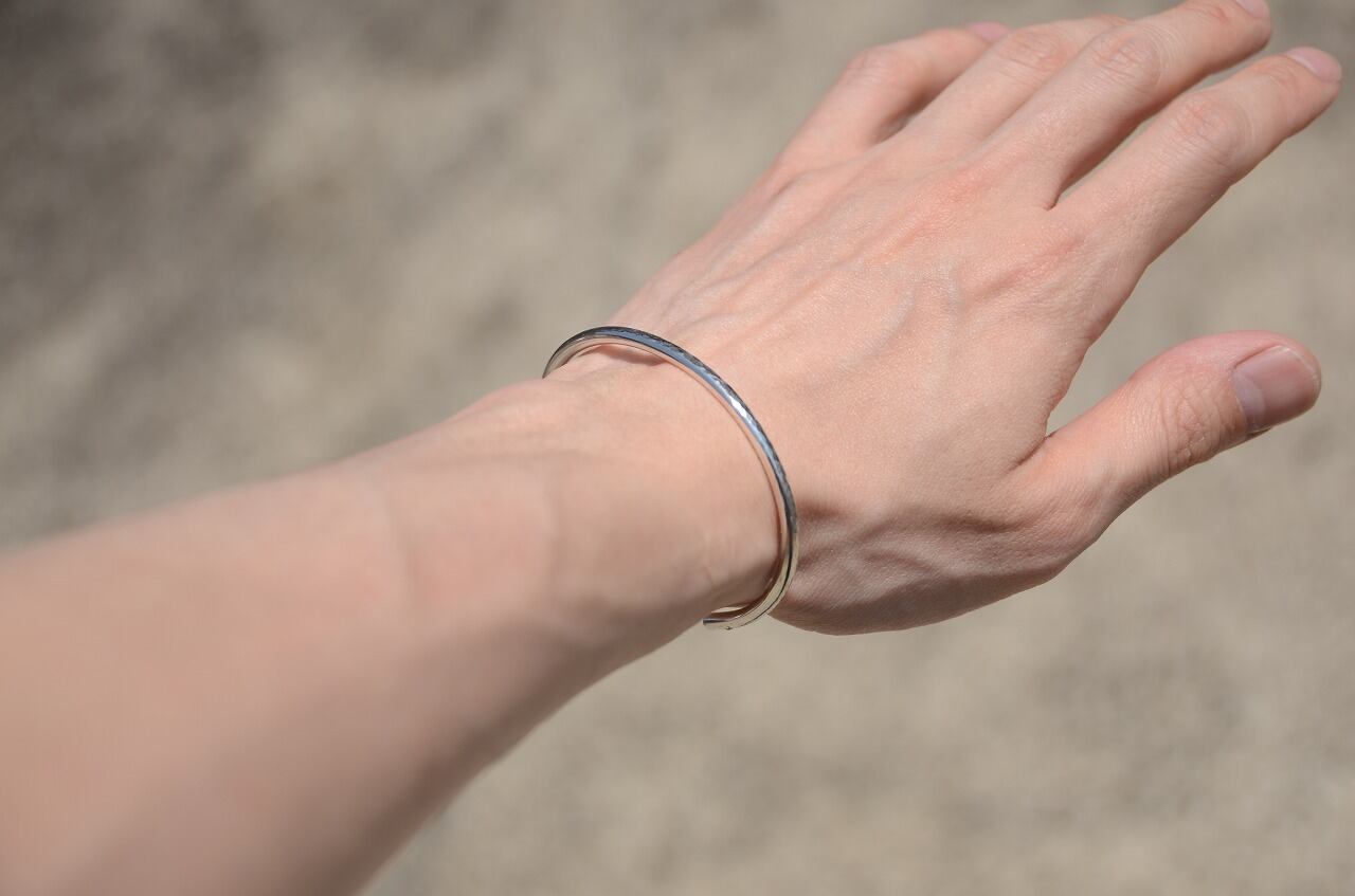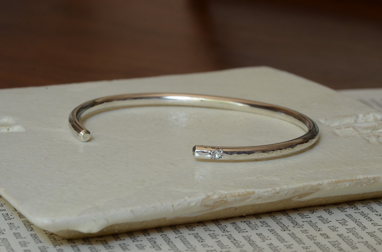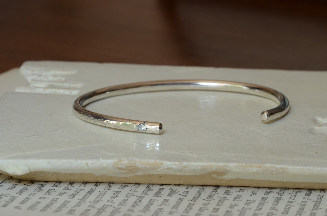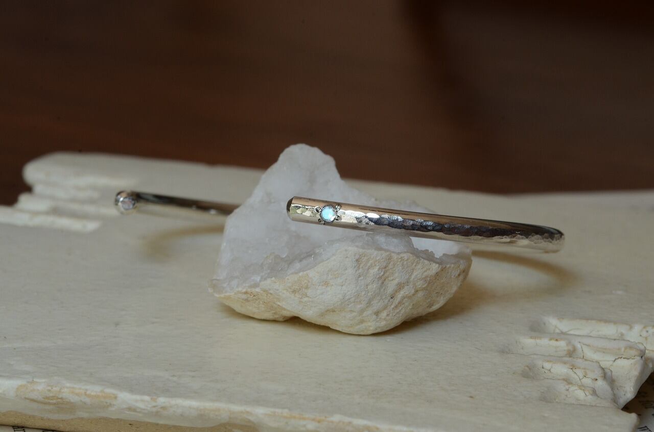シンプルなデザインのシルバーのバングルに一粒石を埋め込むように留めて制作を行いました。槌目を打ったシルバーと美しいブルームーンストーンの輝きは自然でありながら手首を見たときにきらりと輝く光の色を感じられます。