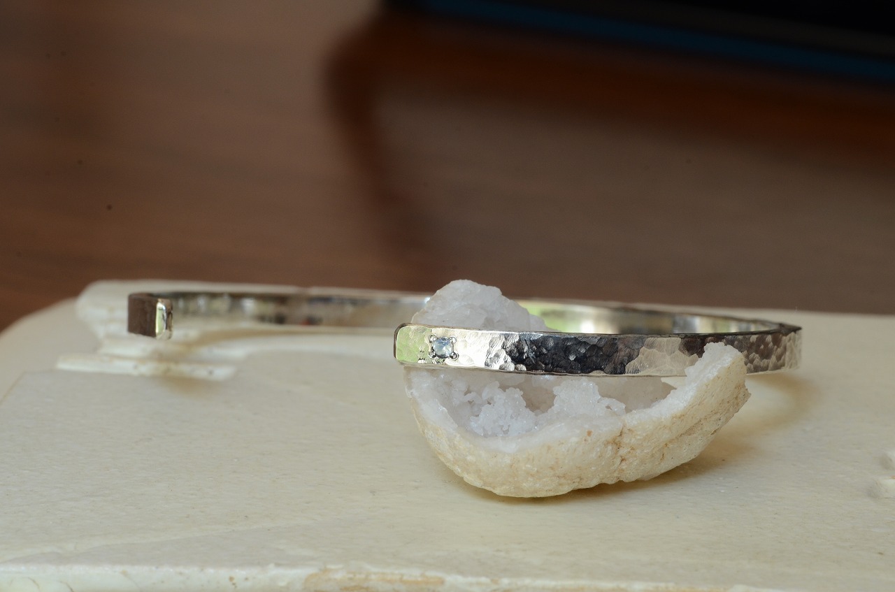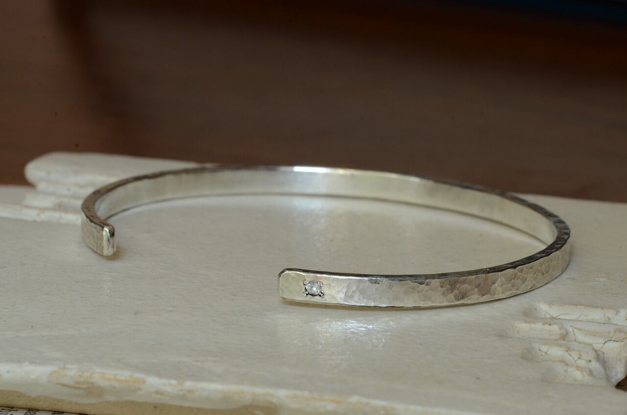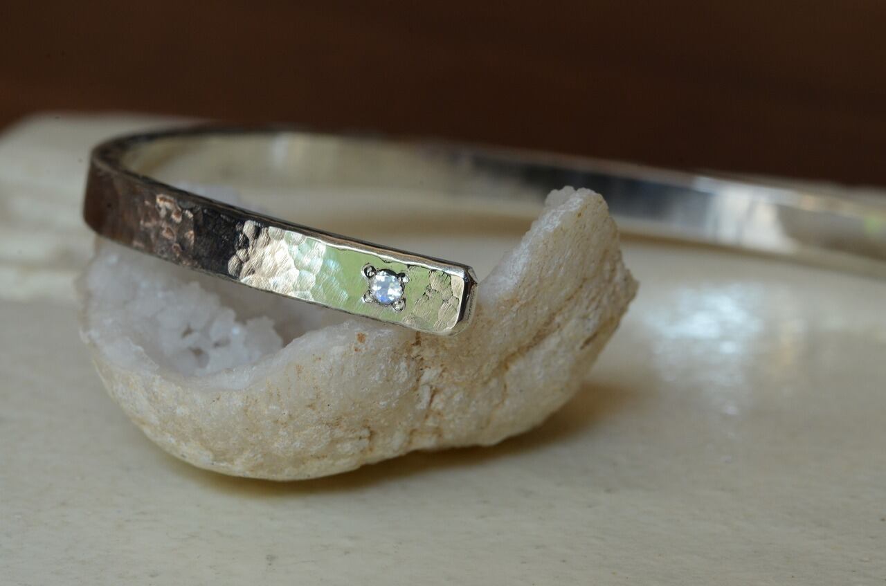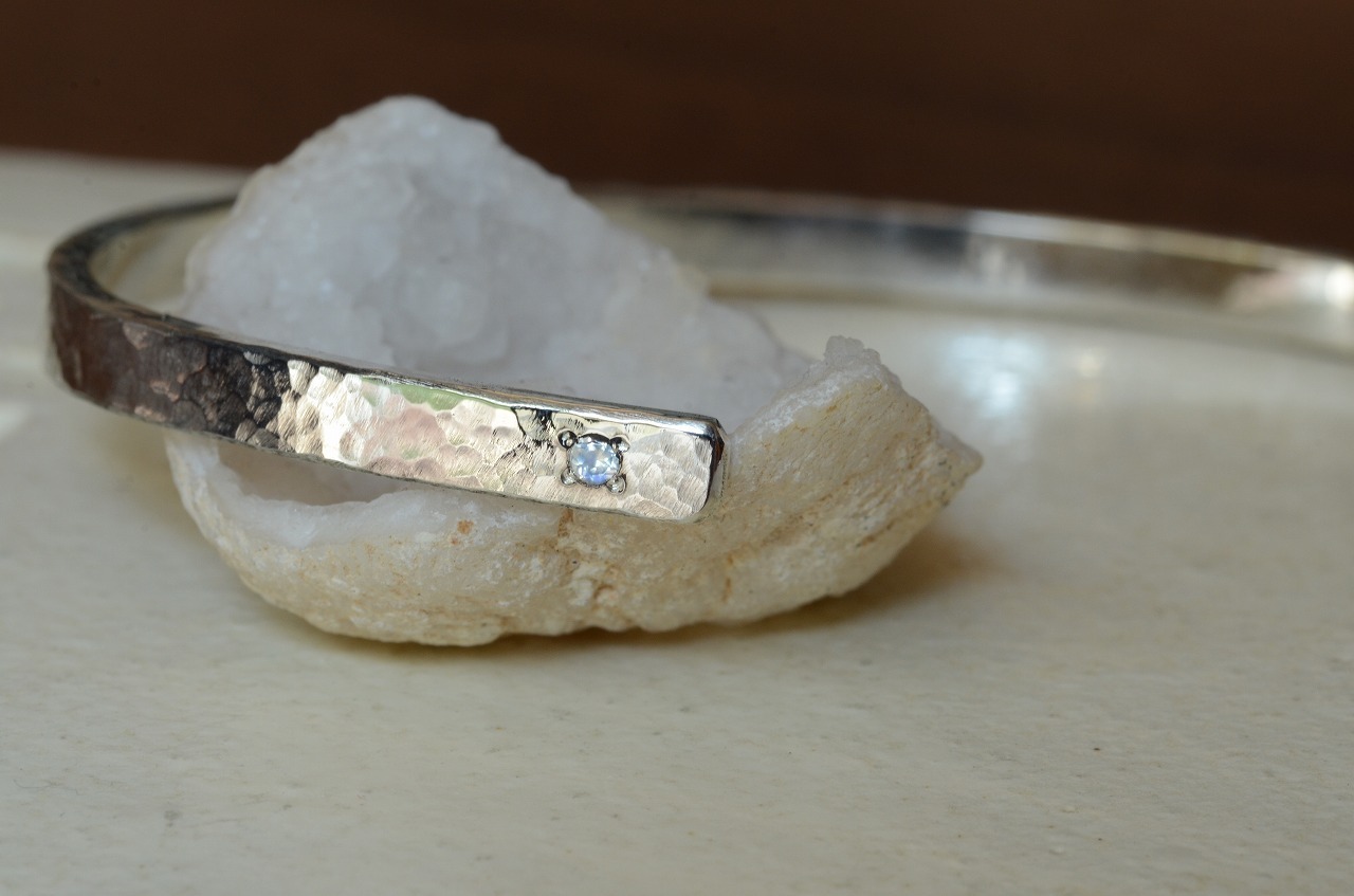 シンプルなデザインの平打ちのバングルに一粒ブルームーンストーンを留めて制作を行いました。性別を問わず身に着けやすい作品であり石のおかげでしっかりと個性も感じられるそんな作品に仕上がったと思っております。
