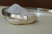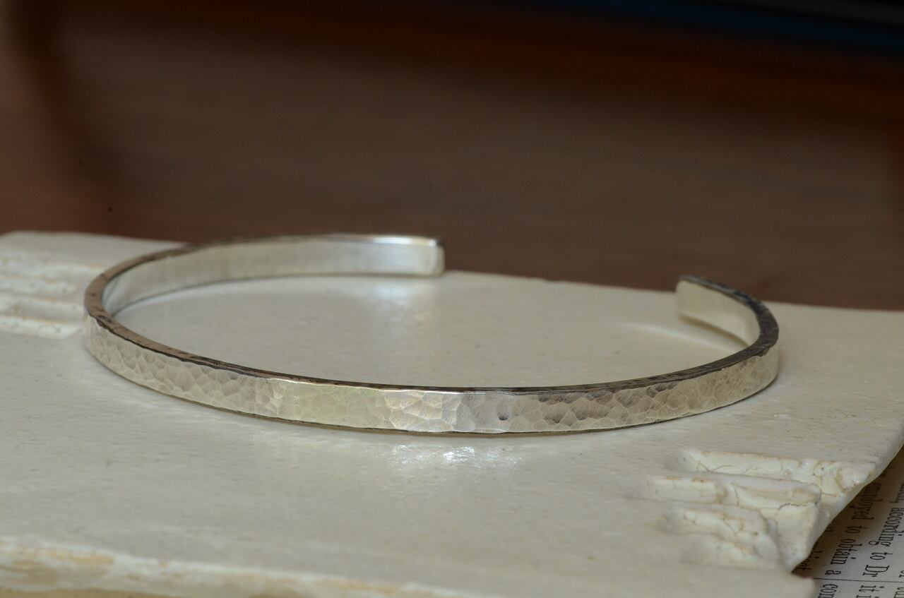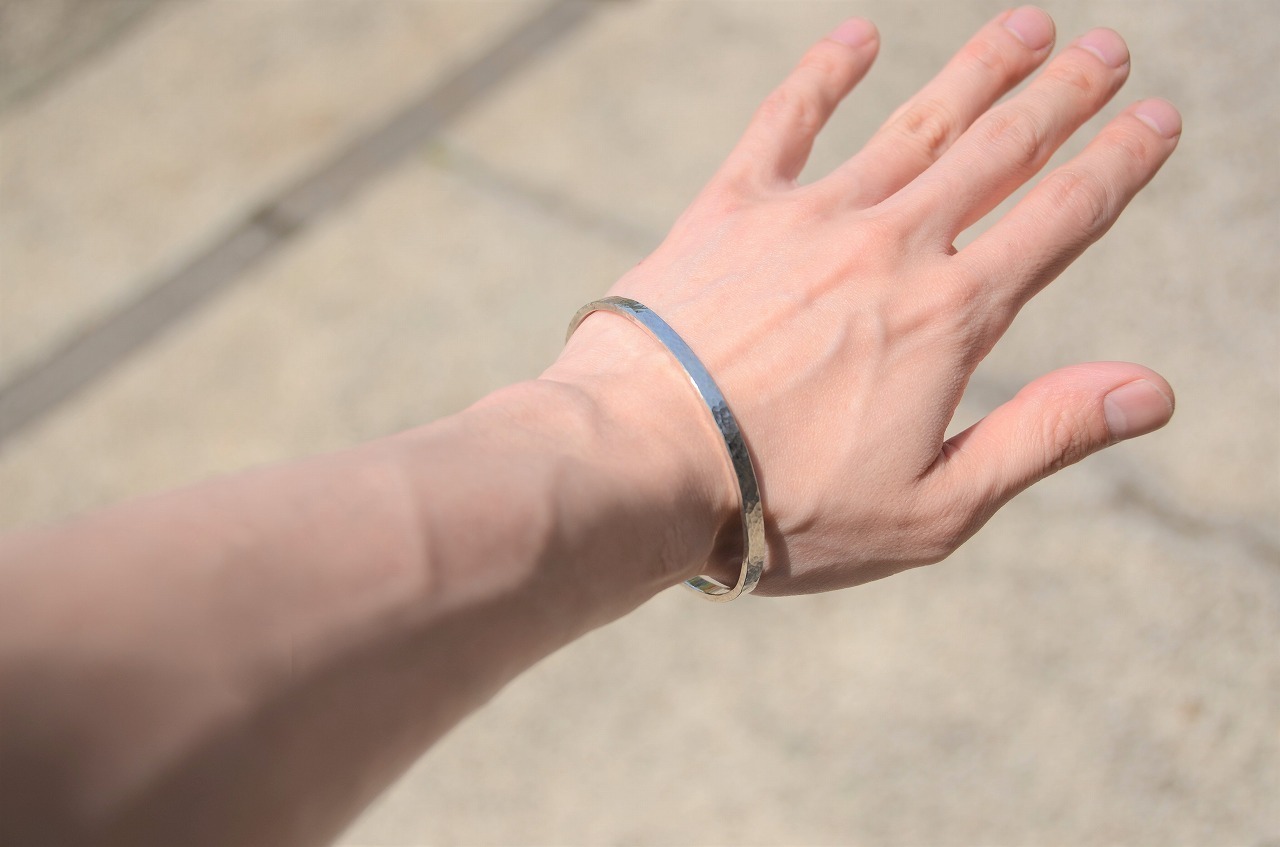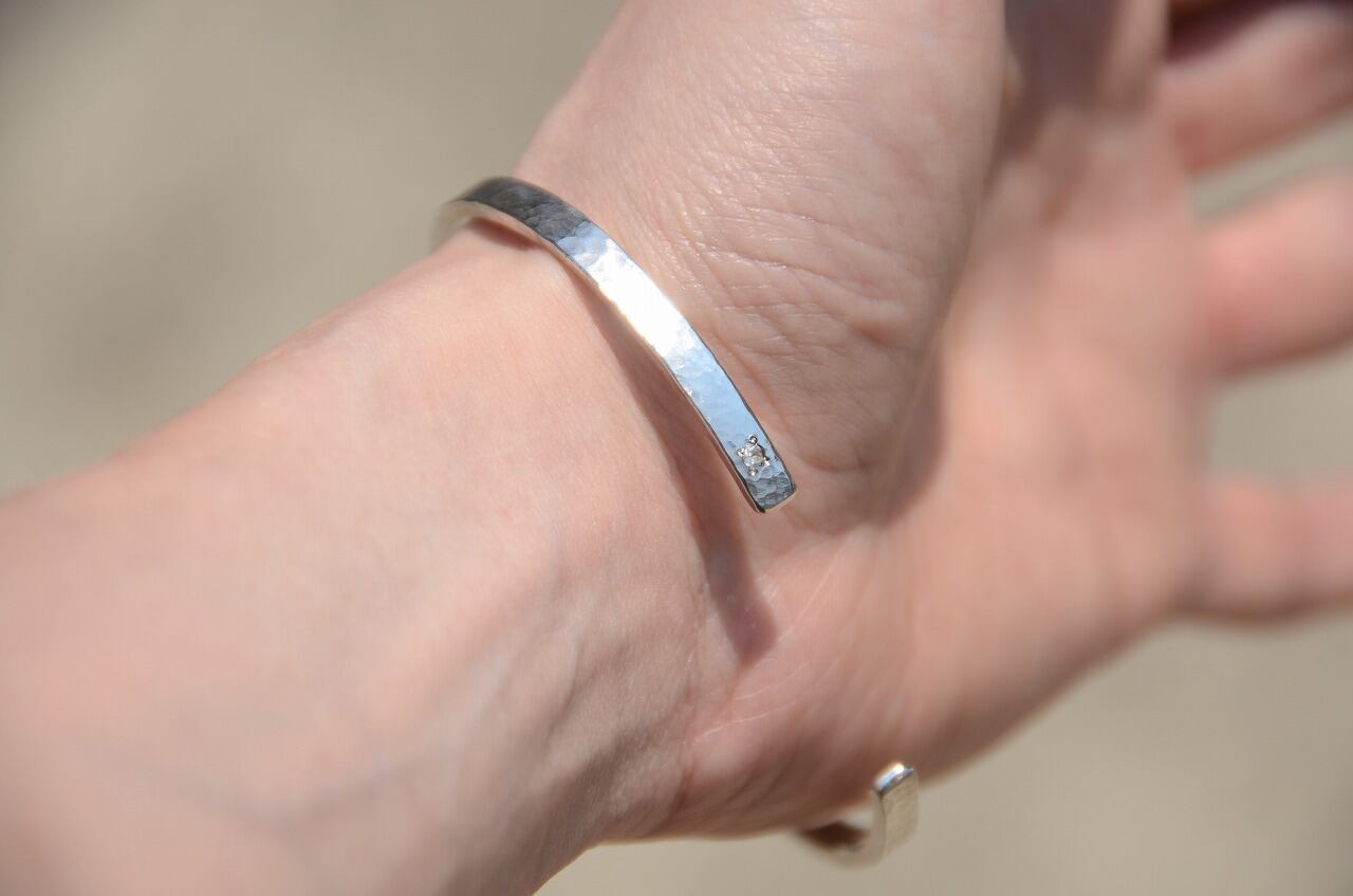 シンプルなデザインの平打ちのバングルに一粒ブルームーンストーンを留めて制作を行いました。性別を問わず身に着けやすい作品であり石のおかげでしっかりと個性も感じられるそんな作品に仕上がったと思っております。