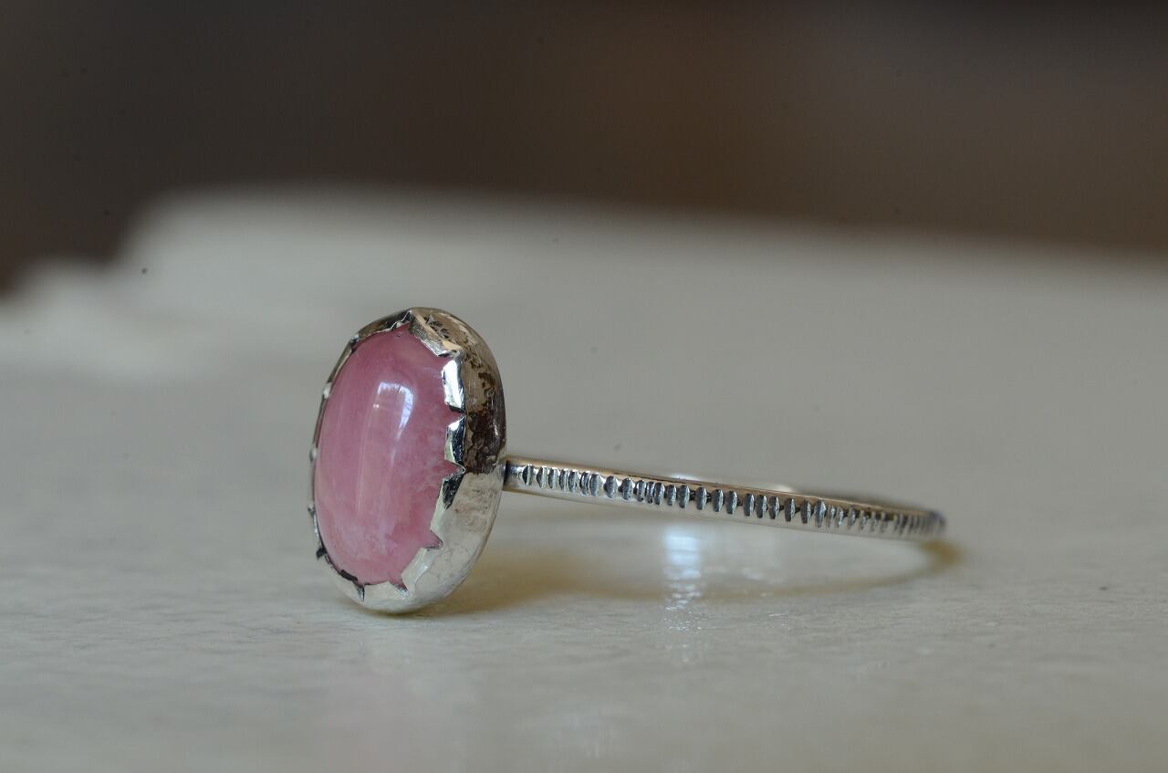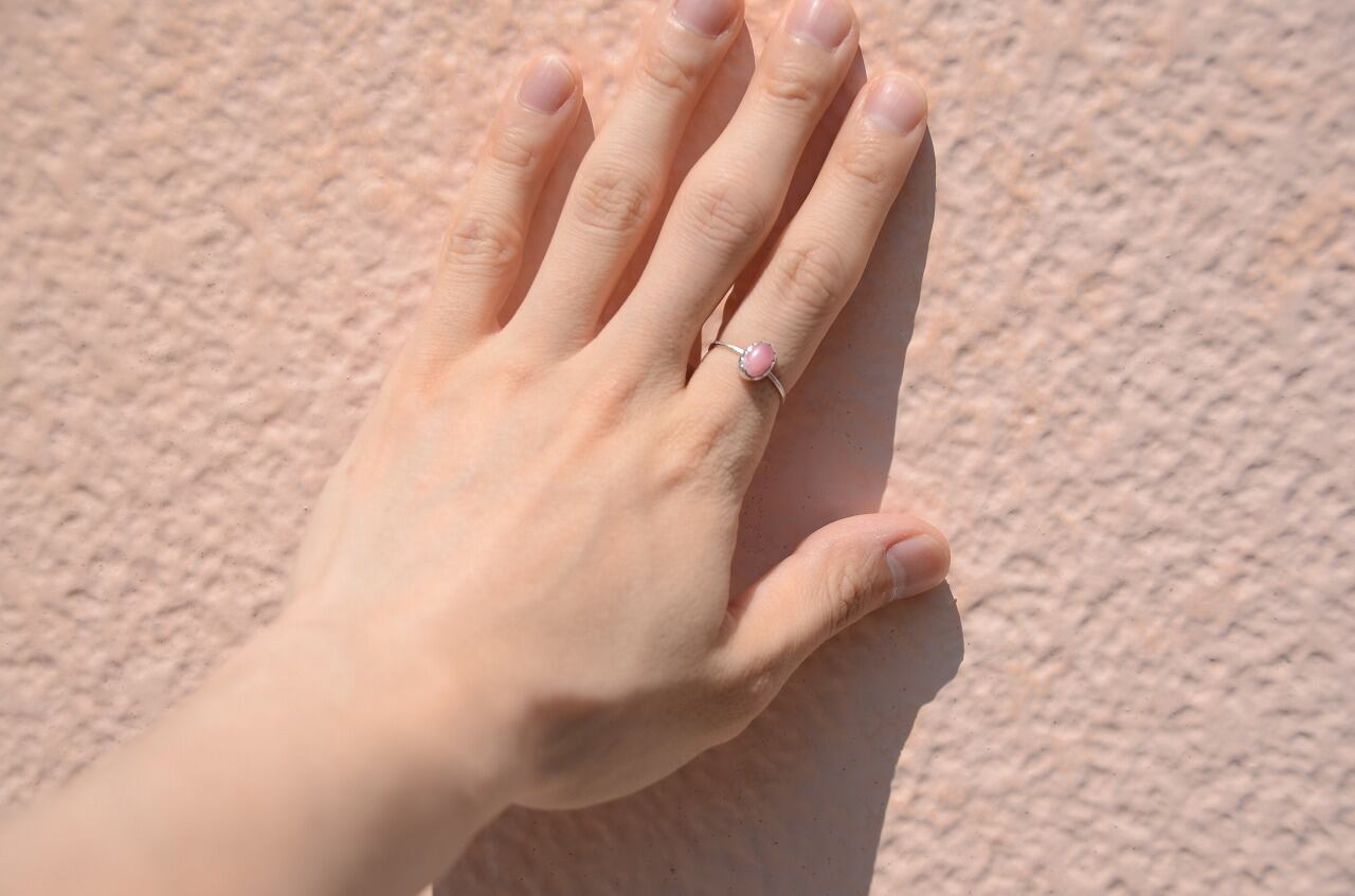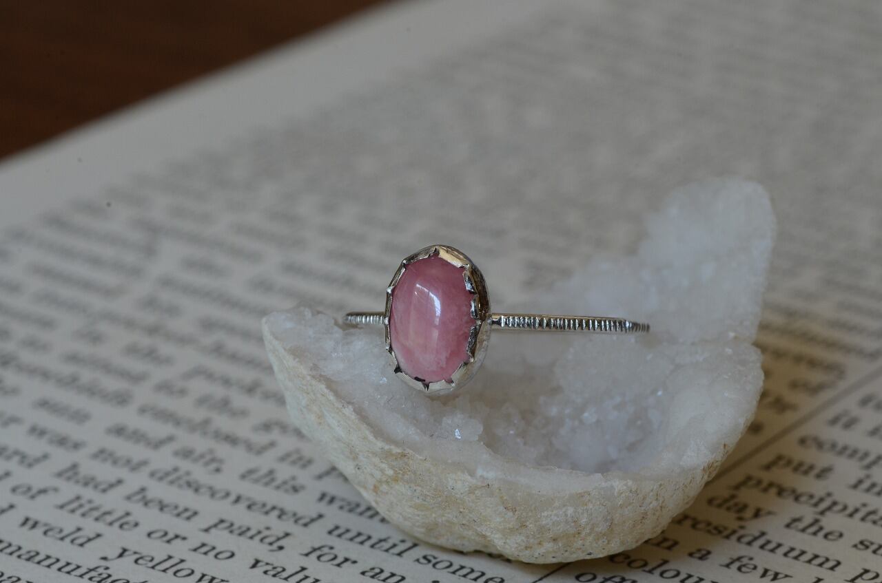 今回はインカローズとシルバーの組み合わせのリングで前作よりリングの幅を細身にして、ミルを打たずに刻みを入れてより繊細で華奢な印象に仕上げることができました。