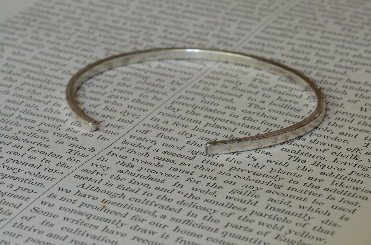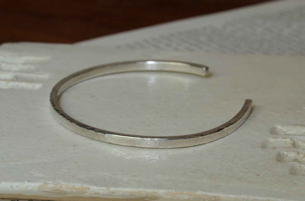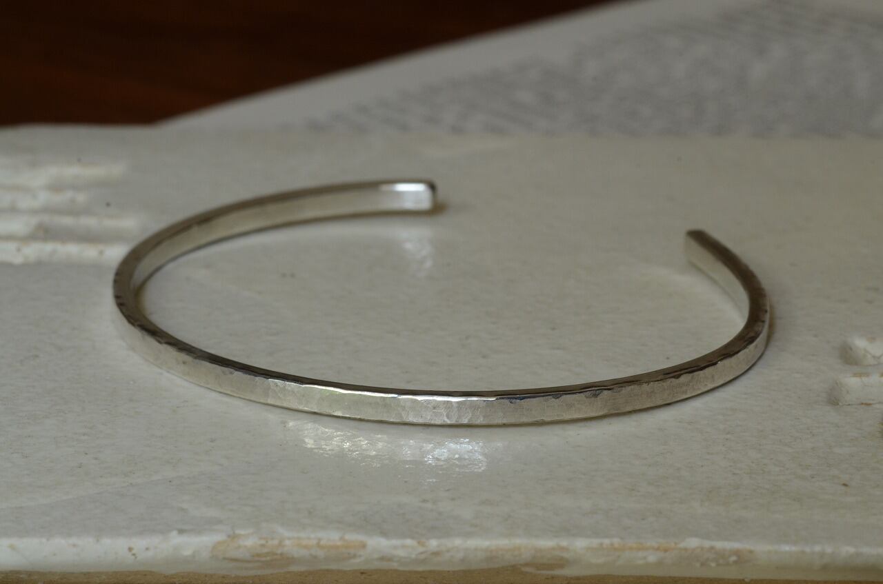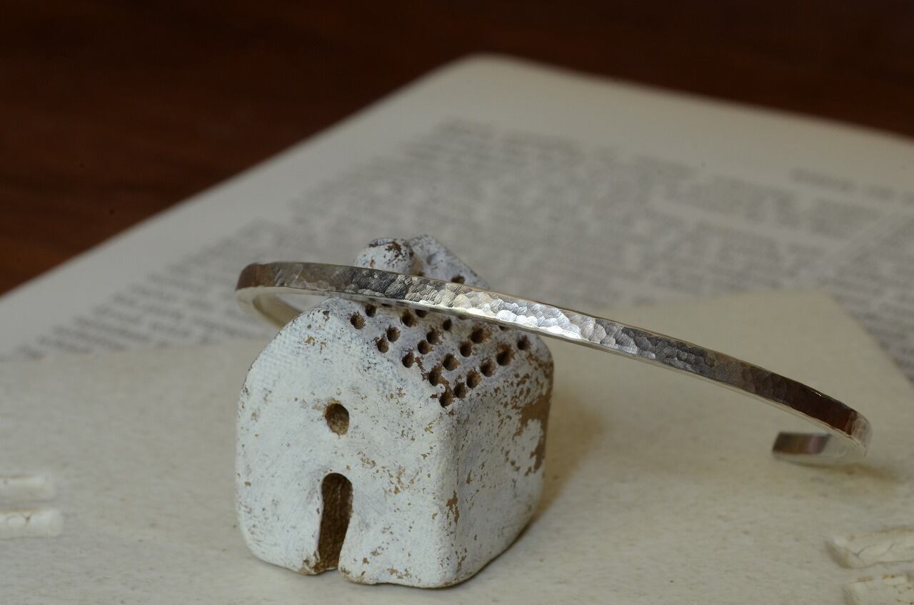 前作に形はすごく似ておりますが、少し細めになって、すこし厚みが増したというような作品です。シルバーに槌目を一つ一つ打っていき制作を行っております。