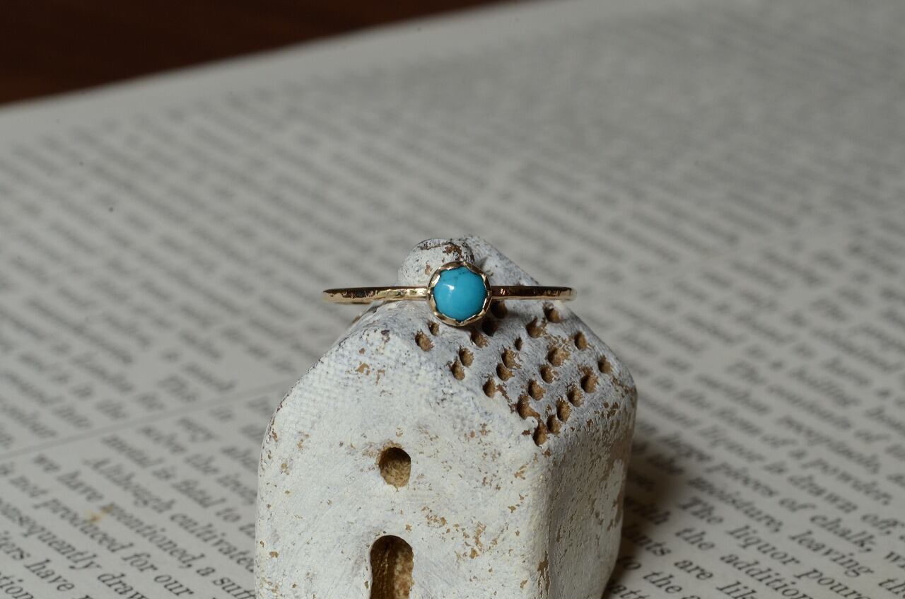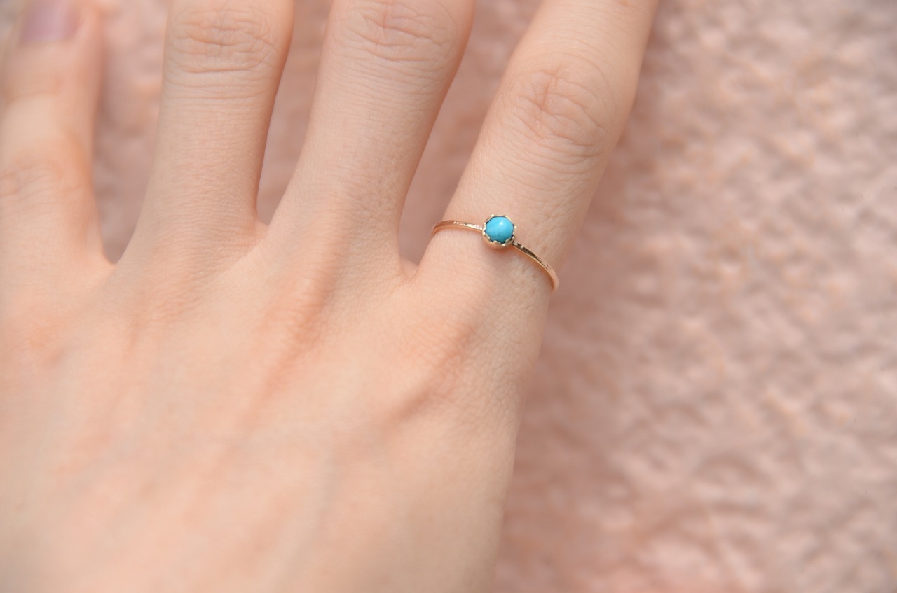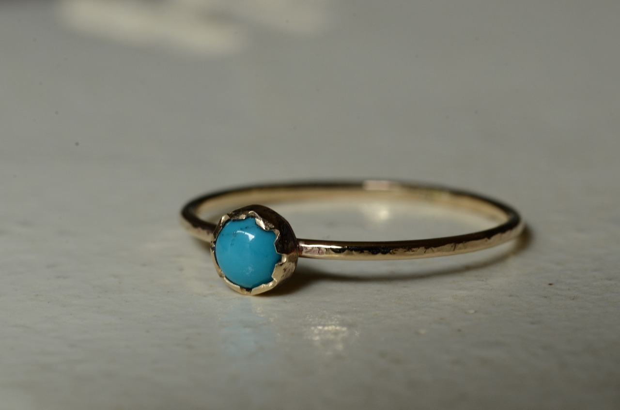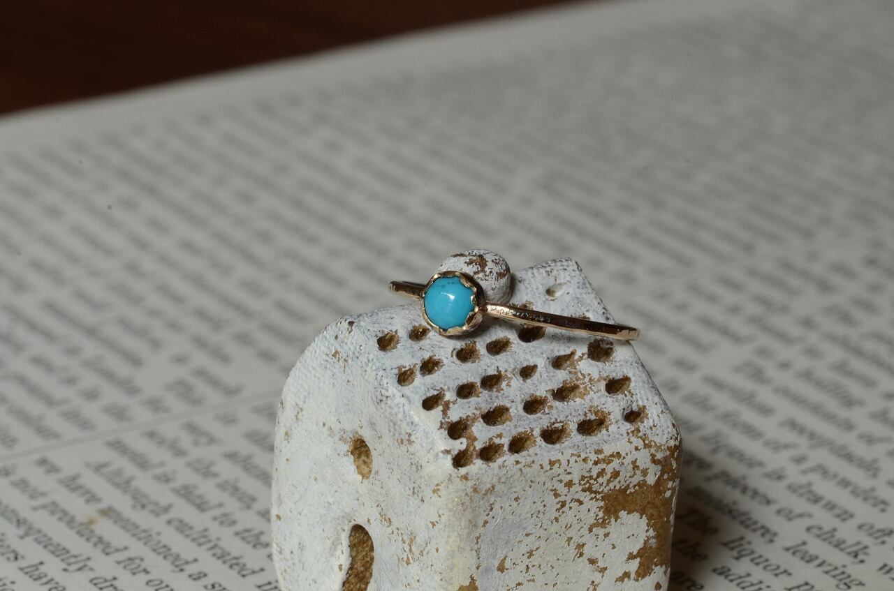 本来は12月のお誕生石であるターコイズですが印象的には夏の印象が強い石でもあります。美しいターコイズブルーは海や空を思わせてくれてそれだけで気分がなんだか明るくなります。明るい輝きの10金と合わせた今回の作品をじっくりと楽しんでもらえたら幸いです