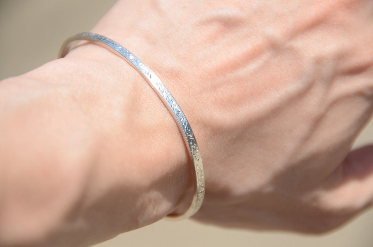 前作の『光景~波~』より細めのバングルを使って今回は波をイメージした彫ではなくて唐草をイメージて彫を入れさせてもらいました。
