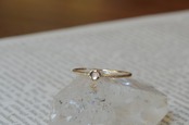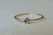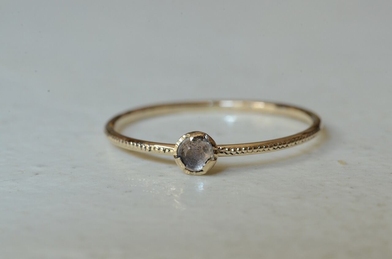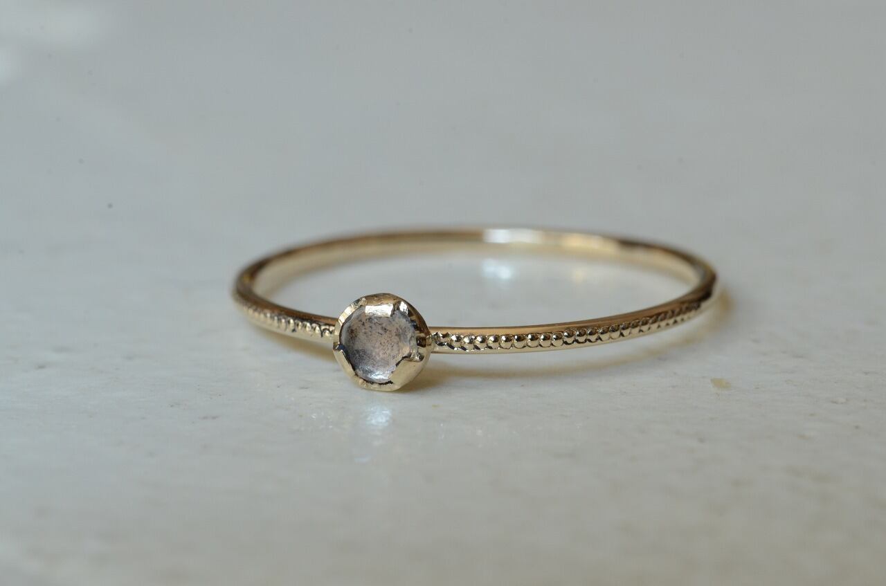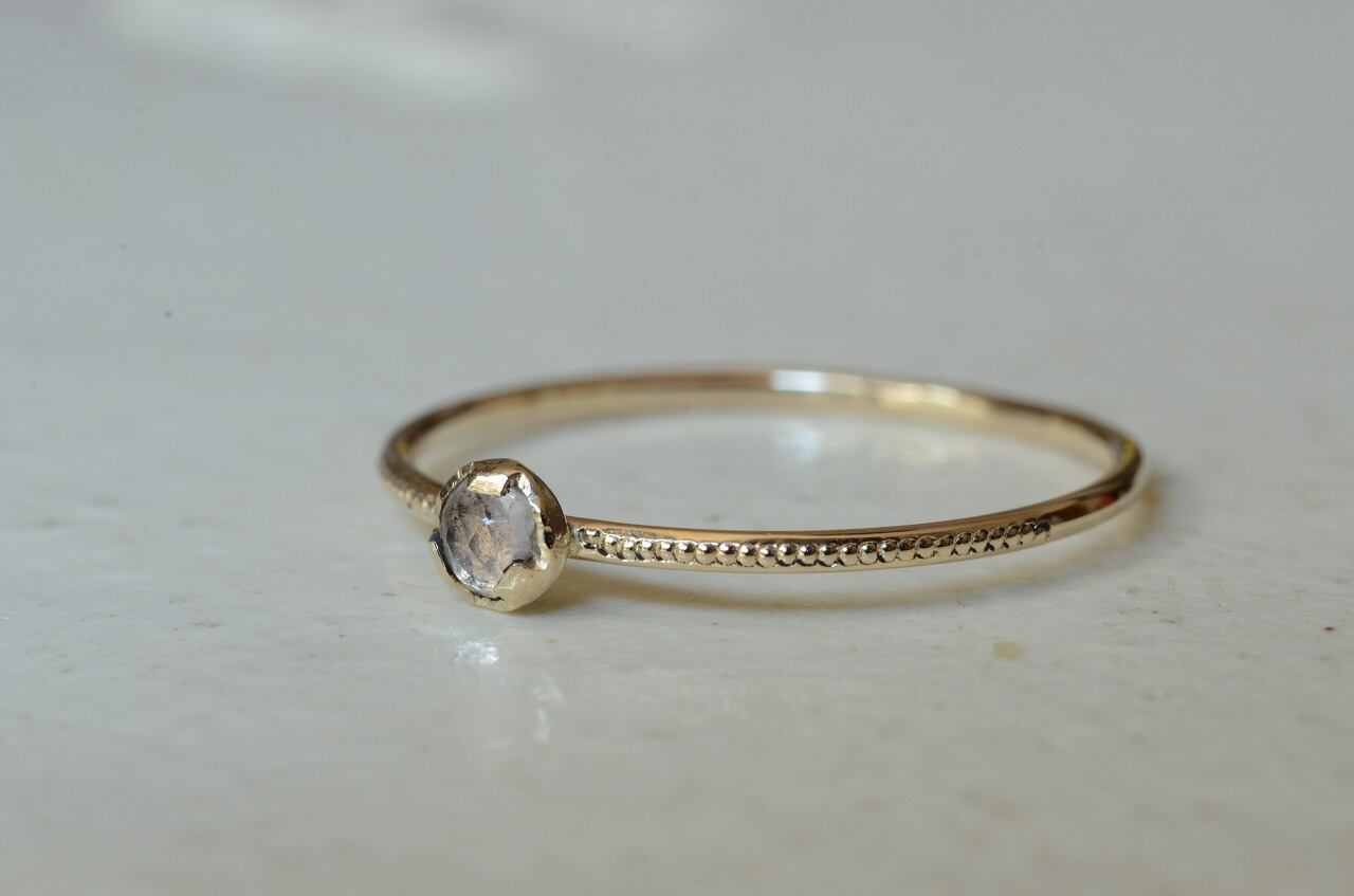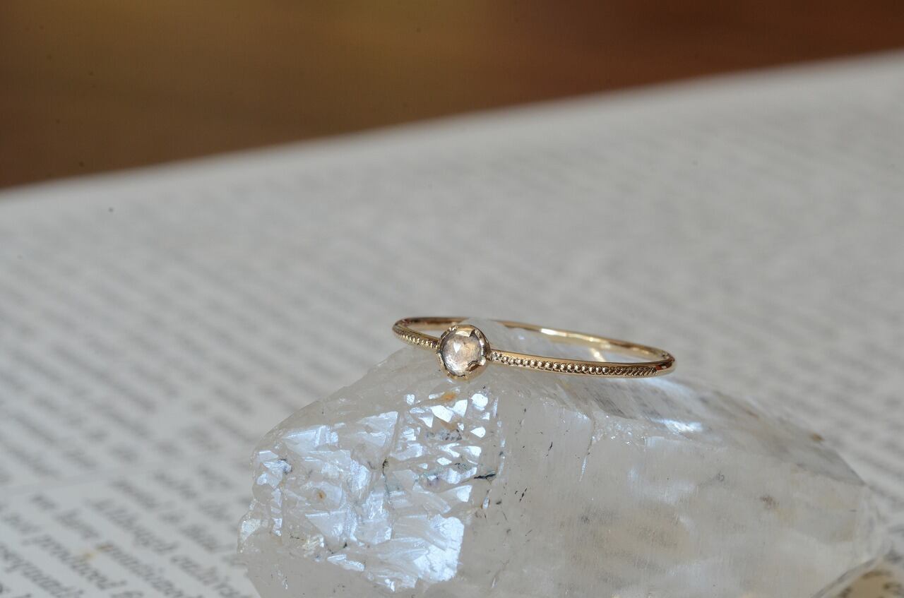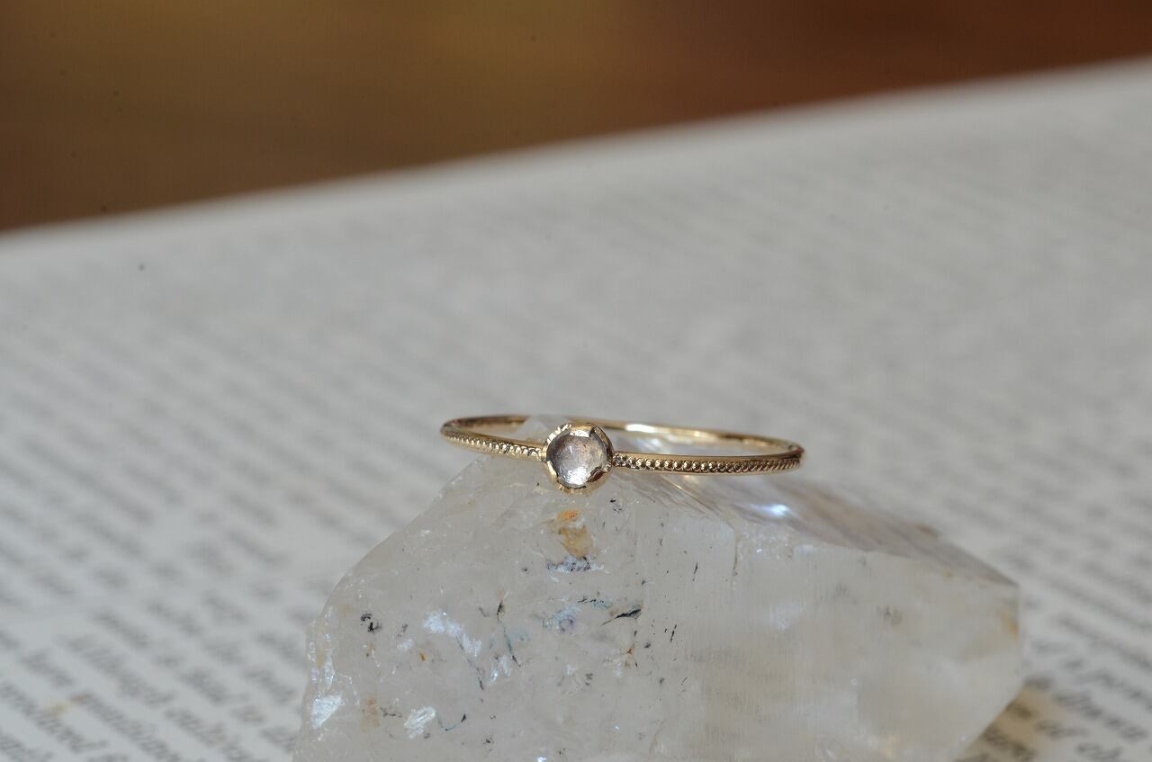 10金と透明感が美しいホワイトスピネルを組みあわせてリング部分には半周にミルを打ってその輝きも楽しめるようにしてみました。